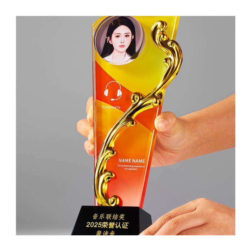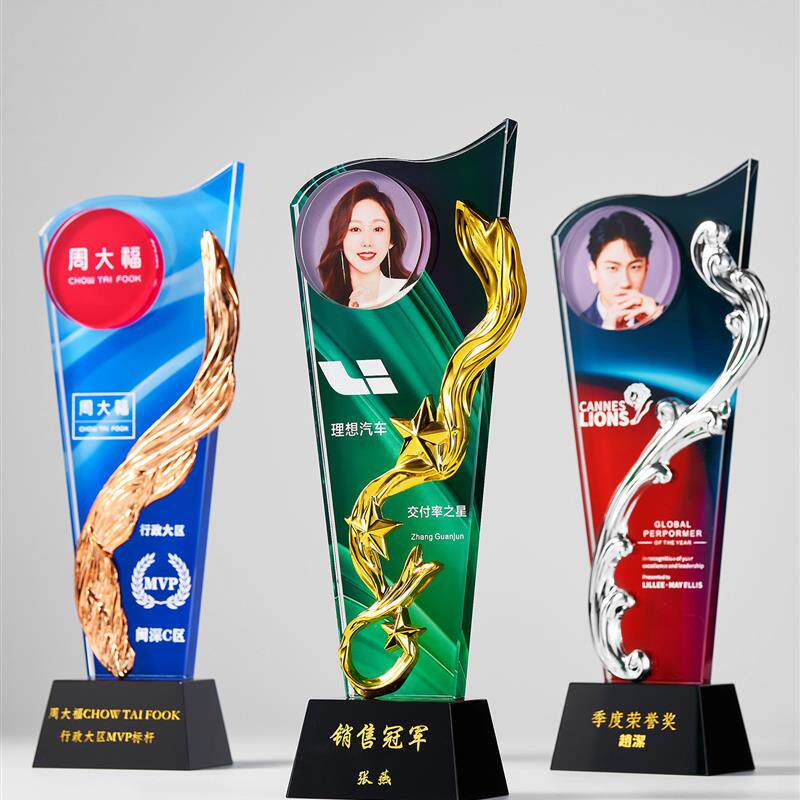 新款彩色炫彩刀片照片飘带水晶奖杯定制金属奖牌优秀员工年会颁奖