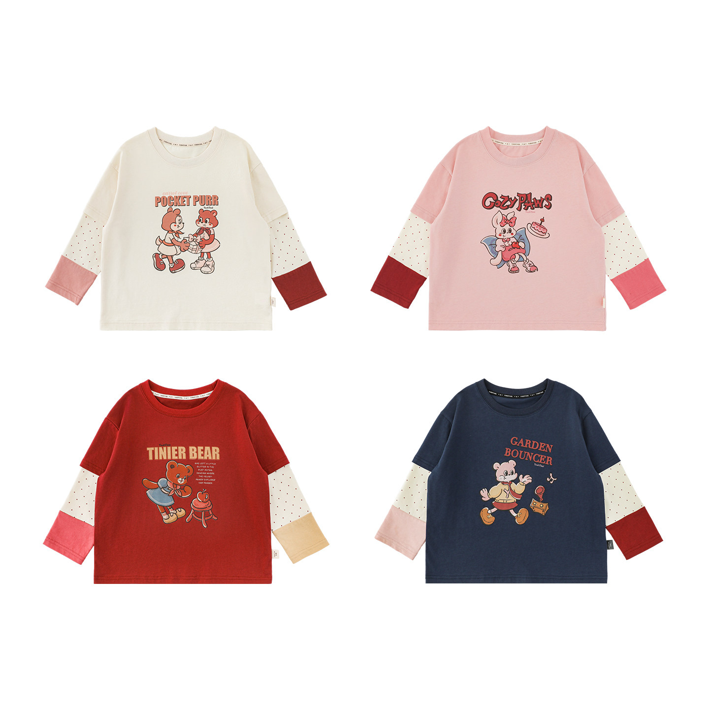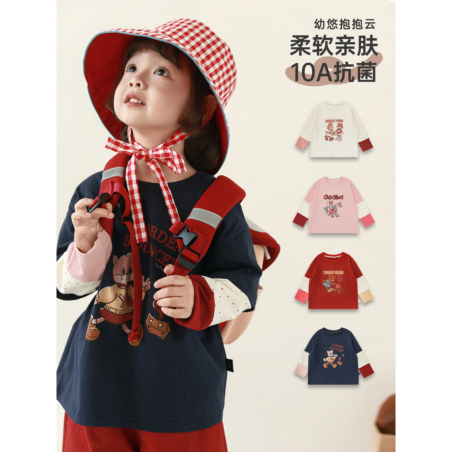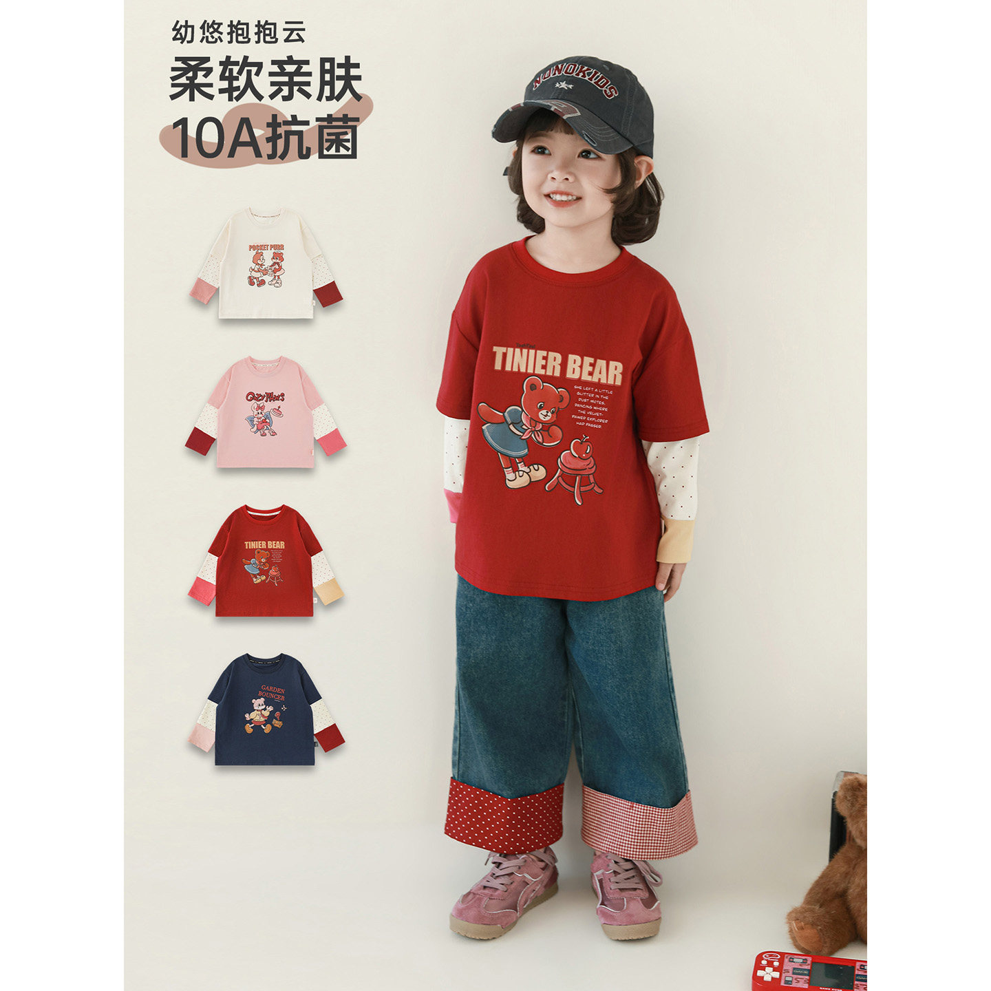 幼悠女童2026春季新款卡通长袖假两件t恤宽松纯棉抗菌儿童上衣潮