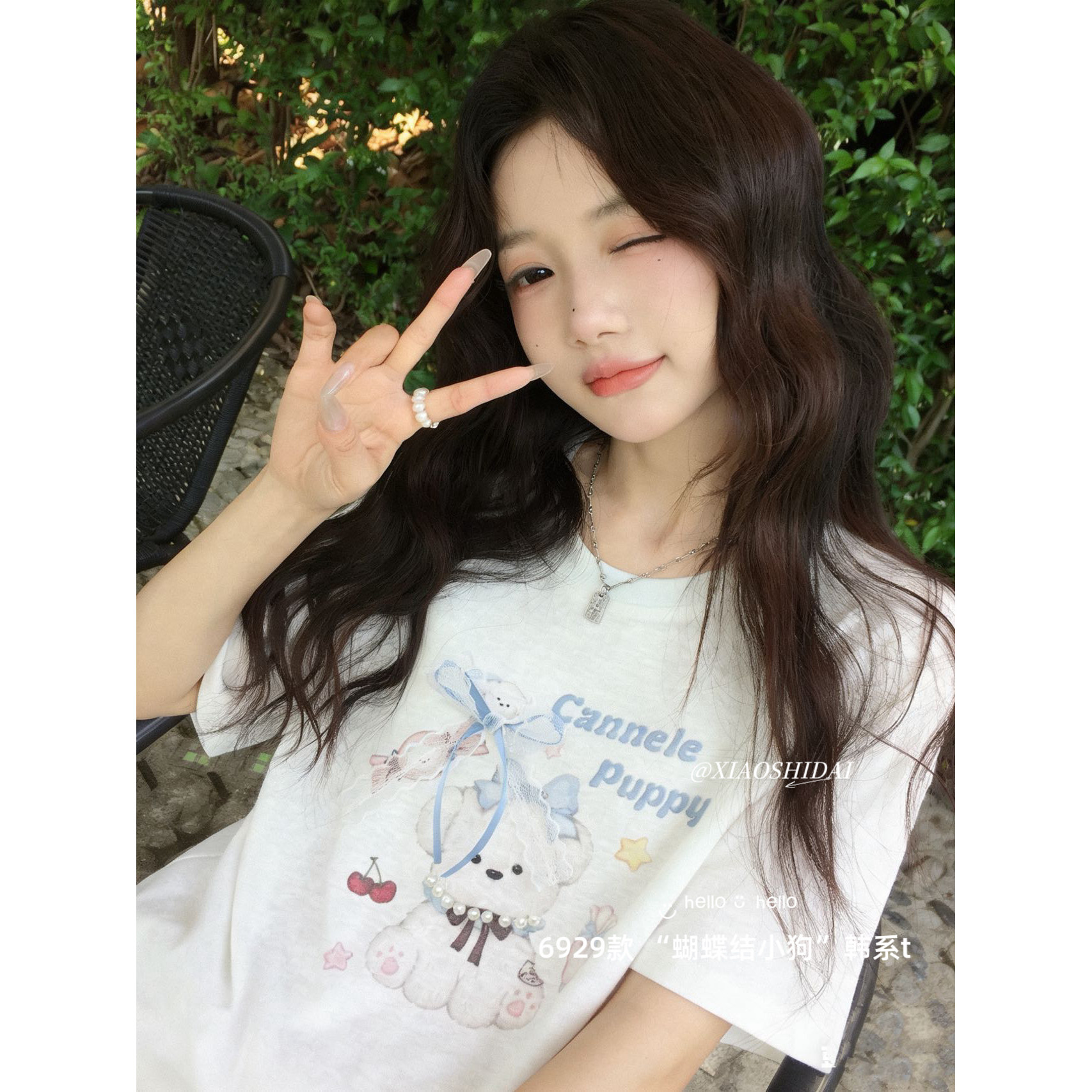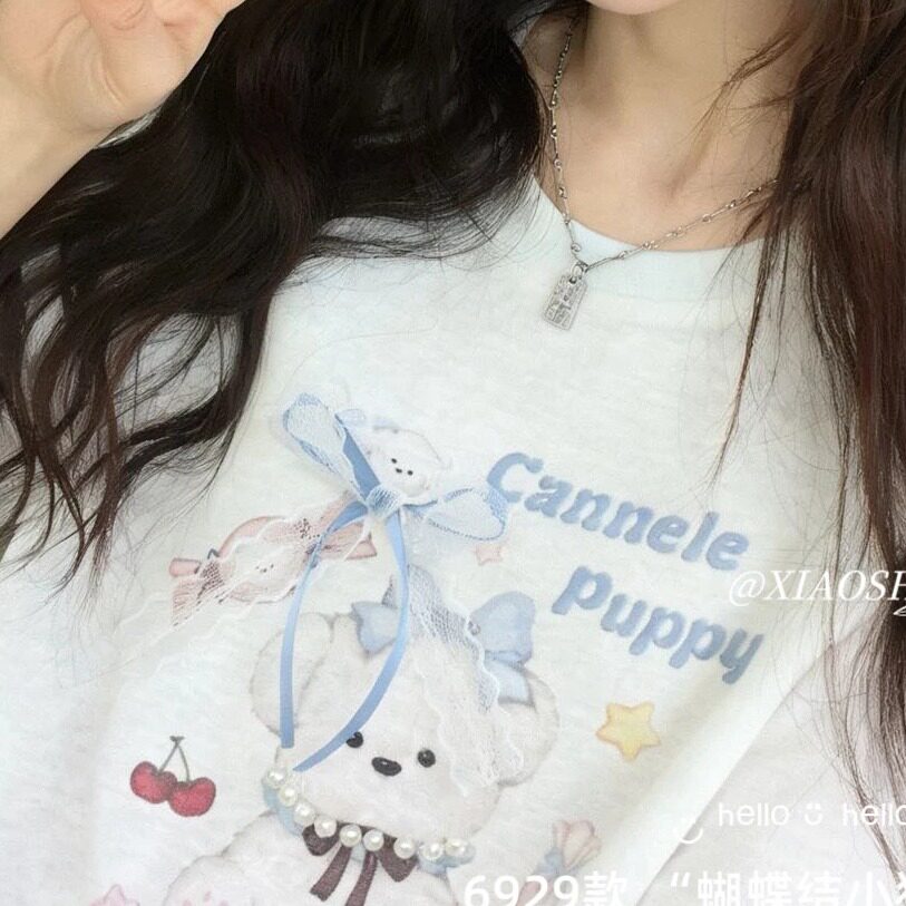 2026夏6929新款棉麻蝴蝶小熊结短袖T恤青少年女生可亲子