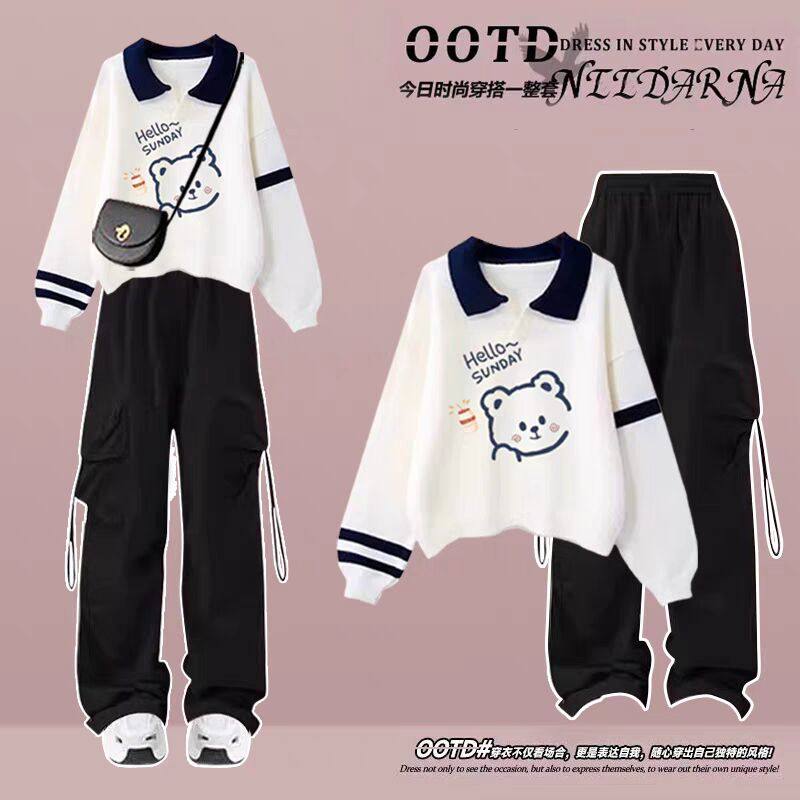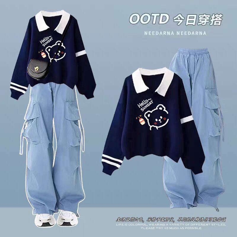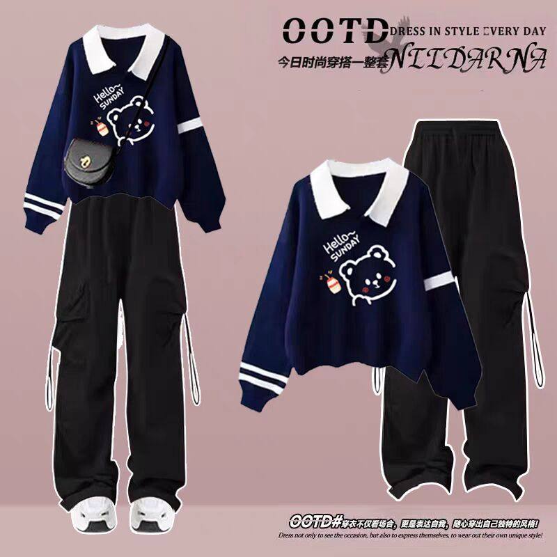 青少年秋季大童14初中生卫衣女套装2024新款polo领工装裤套装酷潮