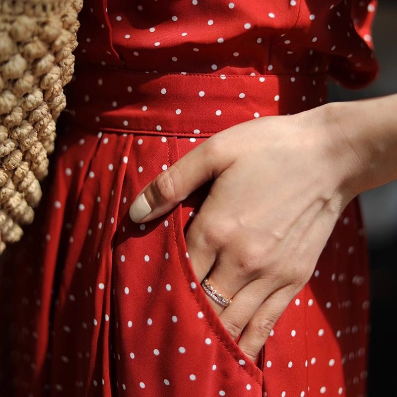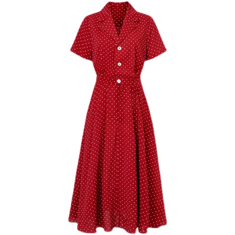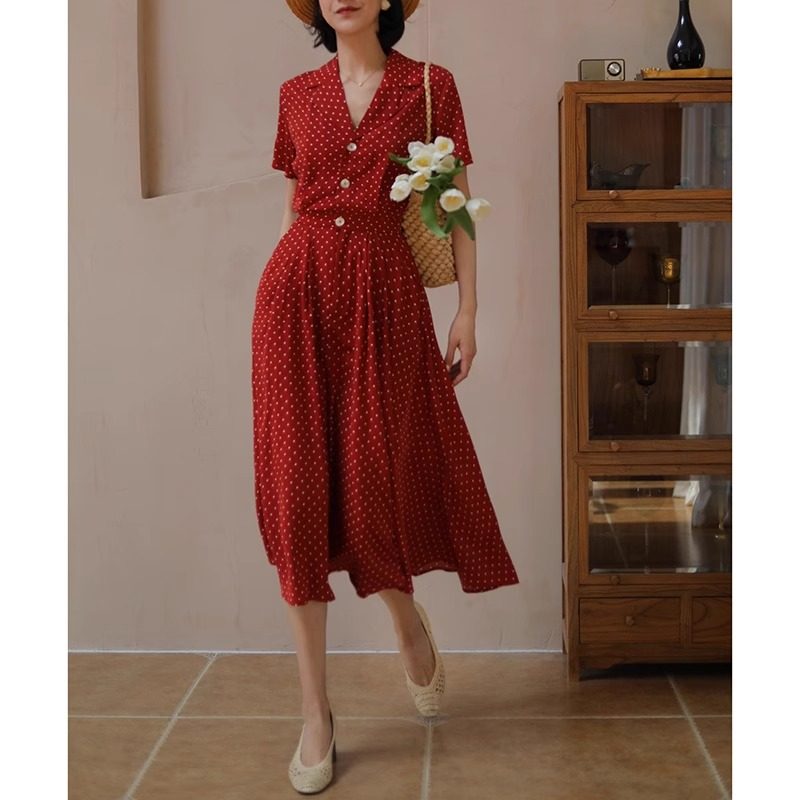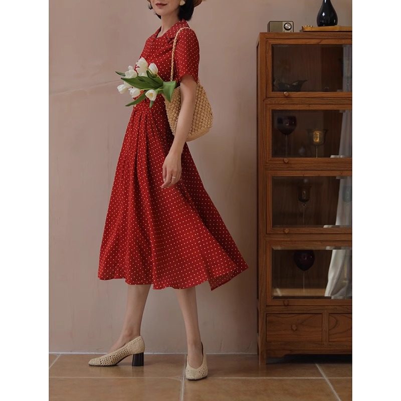 法式高级感波点西装领贝壳扣夏季收腰红色优雅大摆裙连衣裙