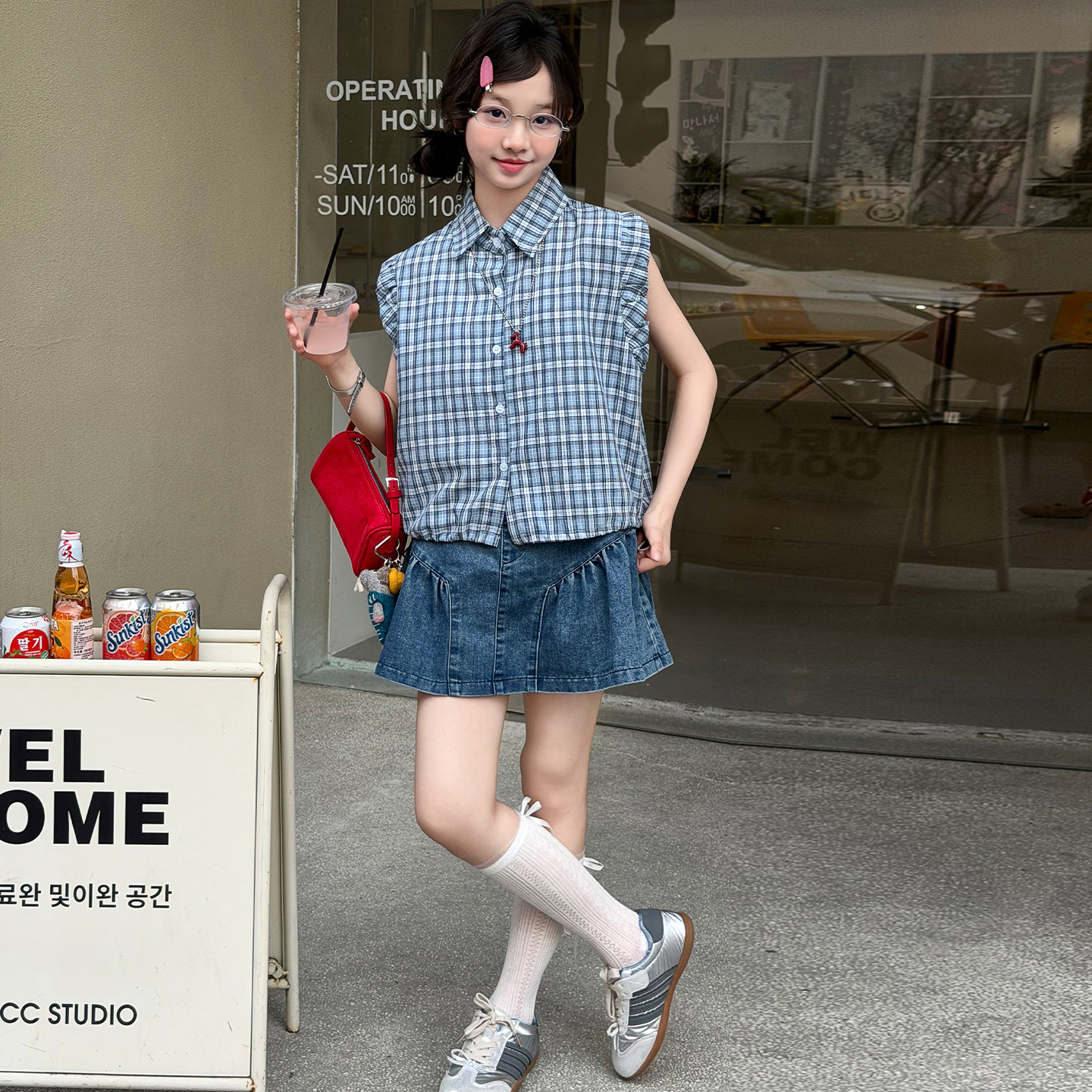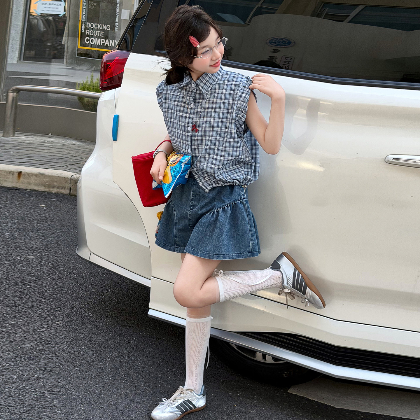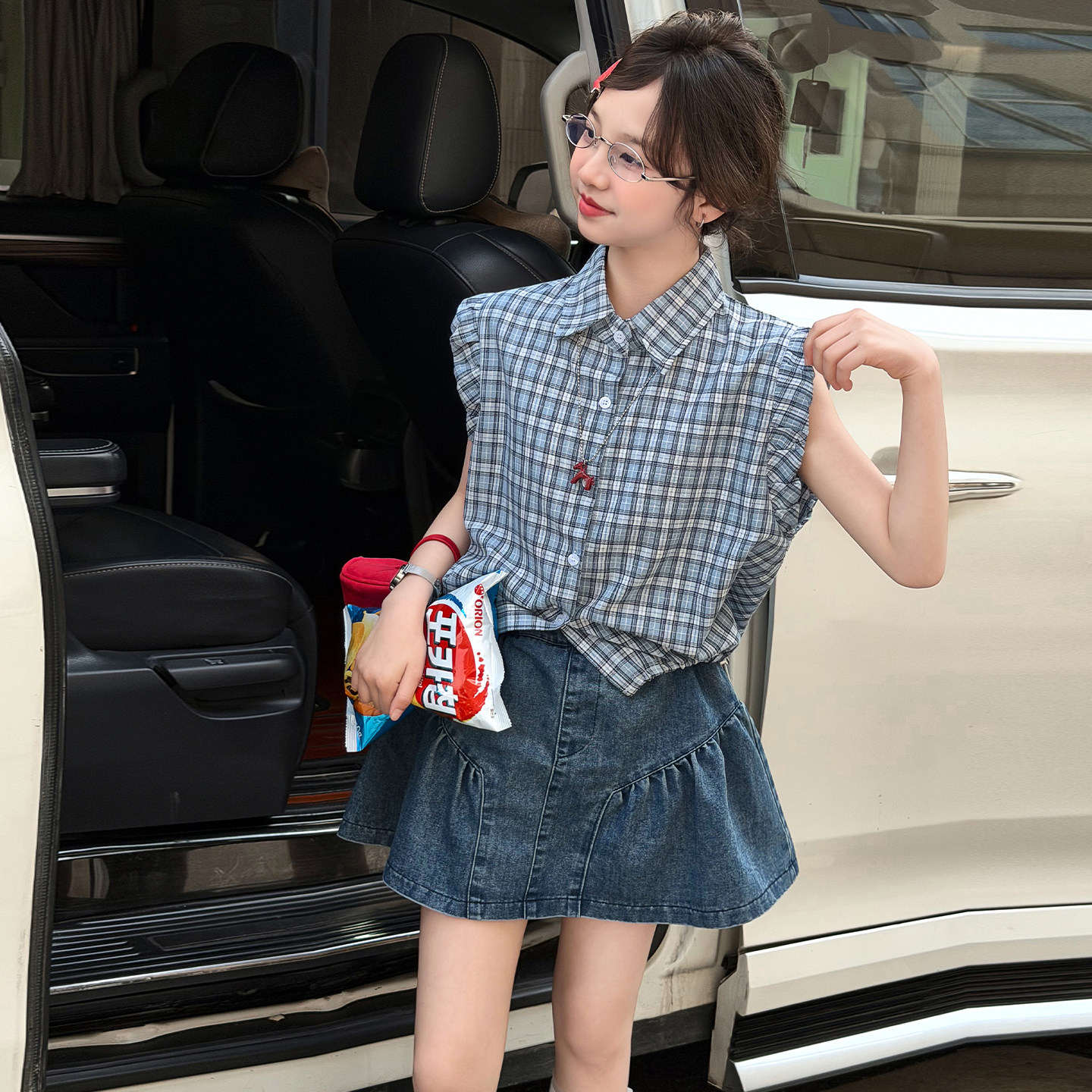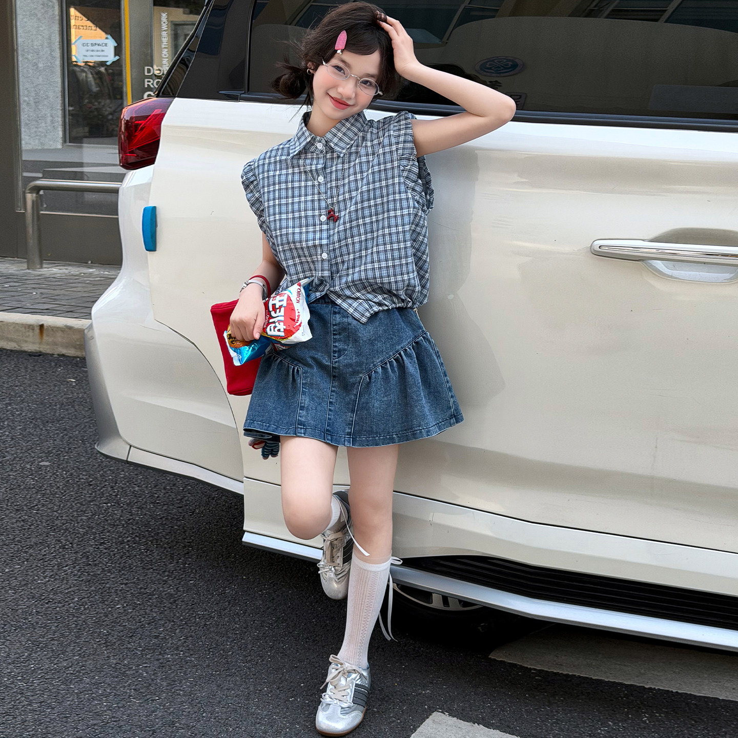 女童夏季牛仔裙裤套装童装新款薄款翻领飞飞袖衬衫短裙两件套洋气