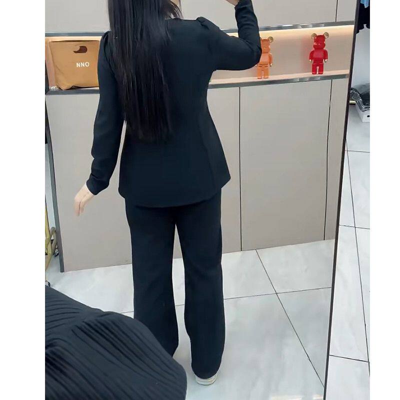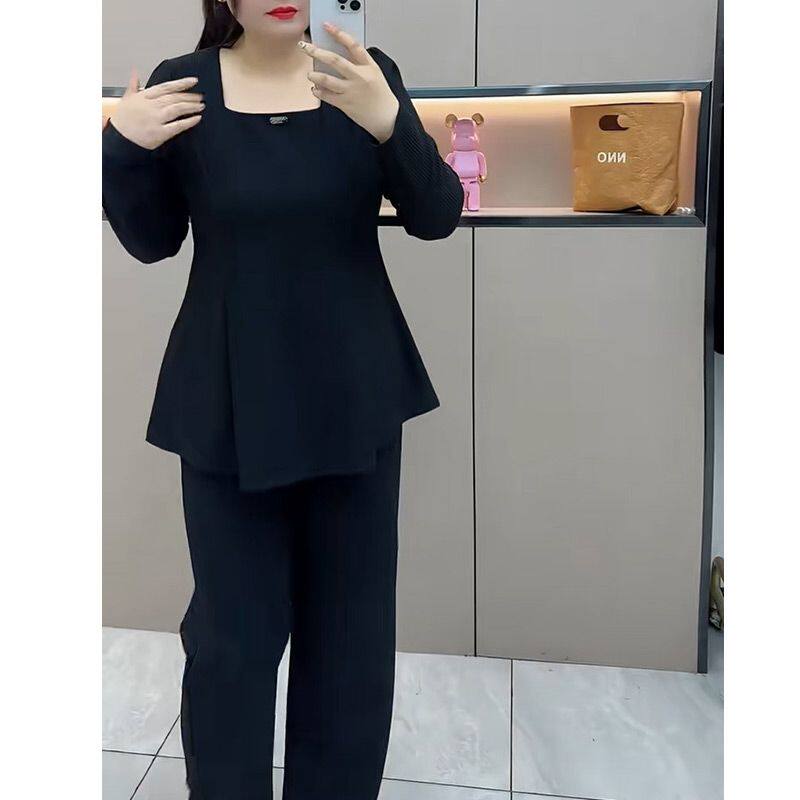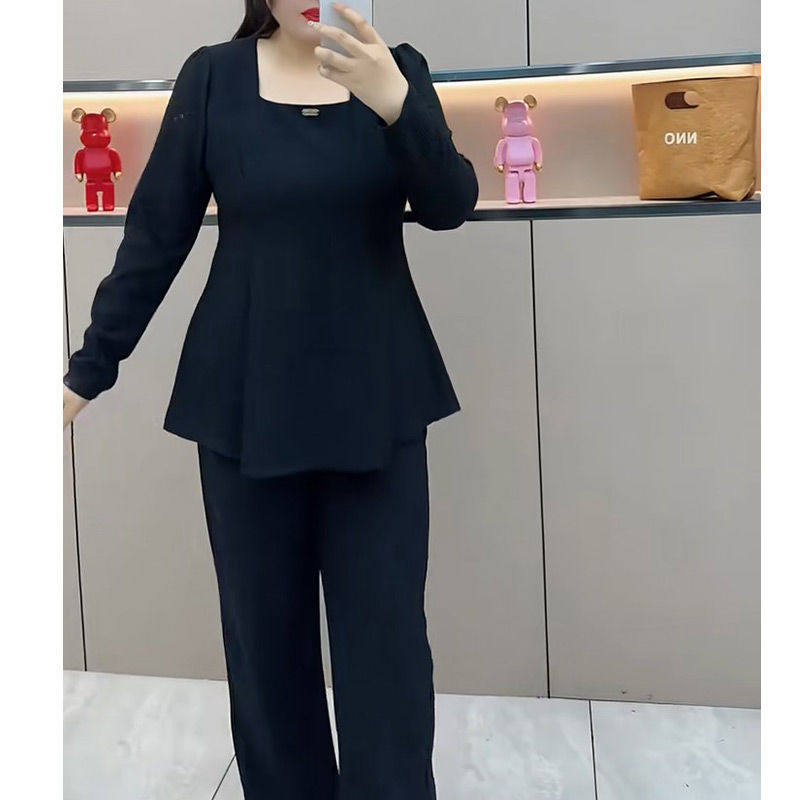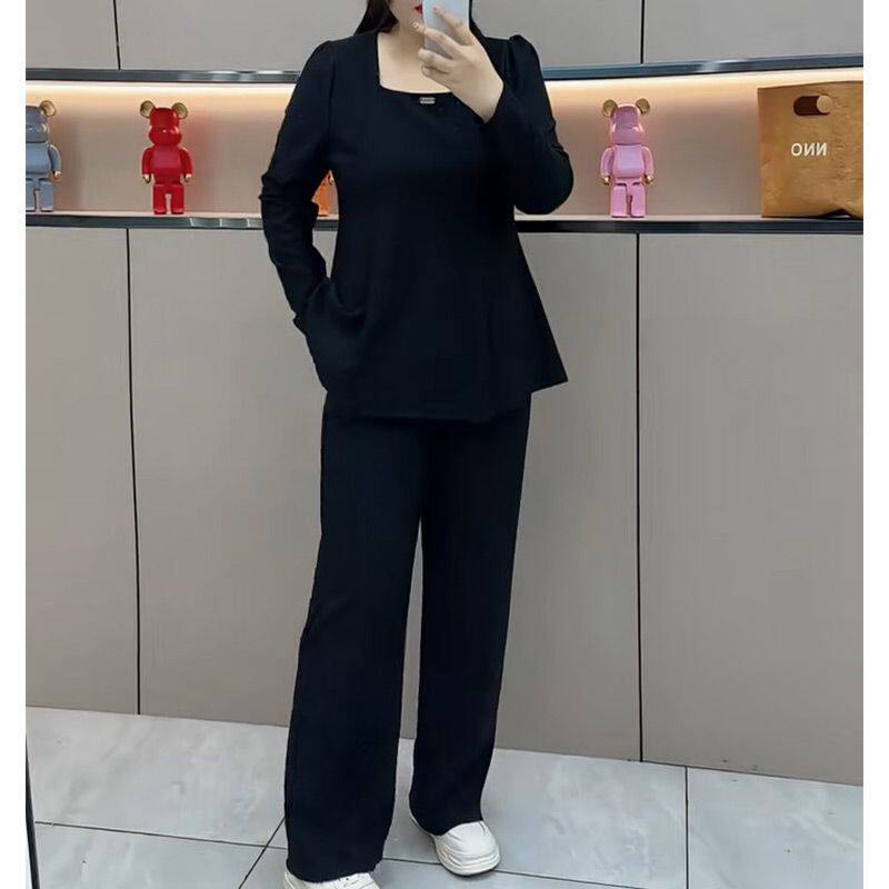时尚休闲大码套装女2026春季新款宽松遮肚子方口领上衣阔腿裤套装