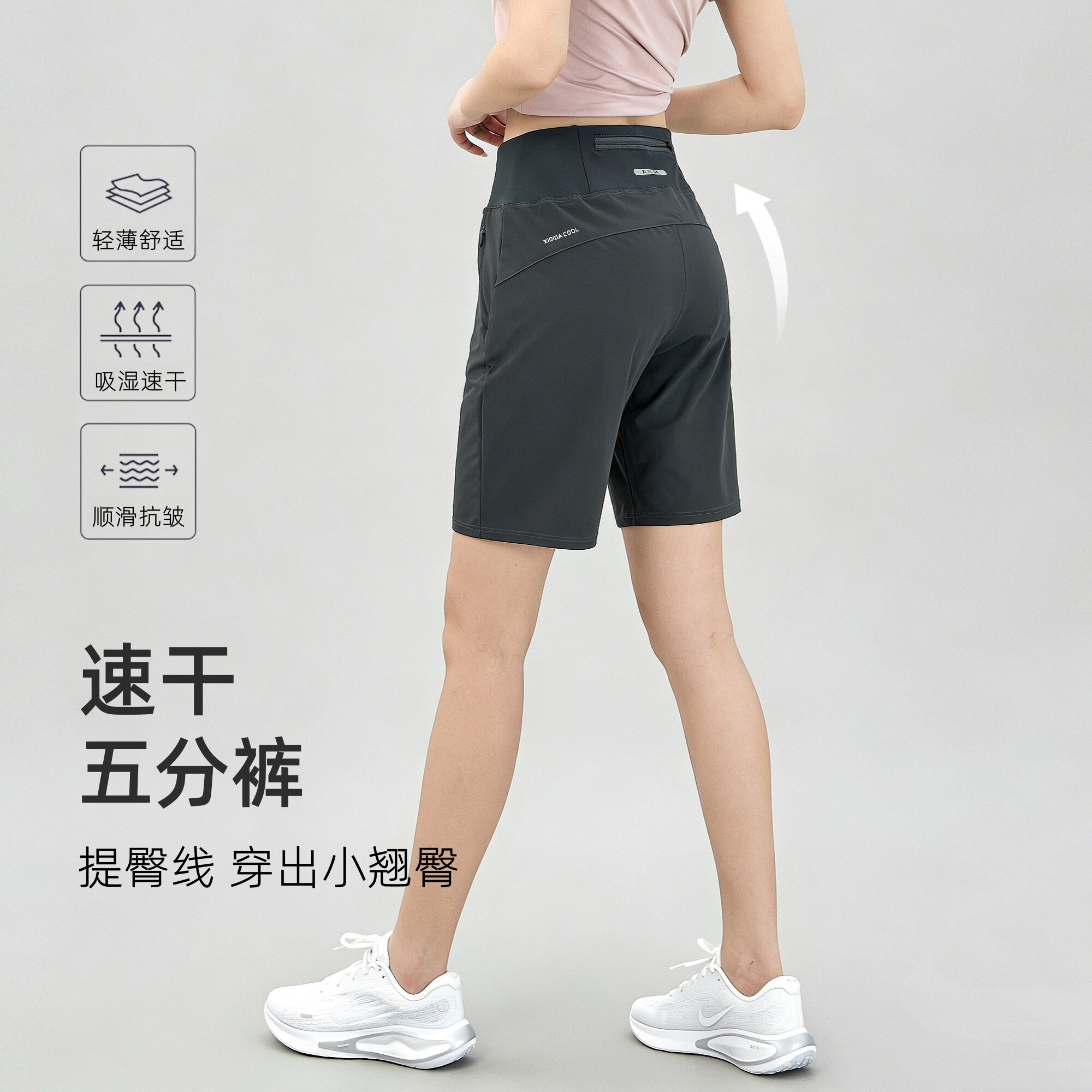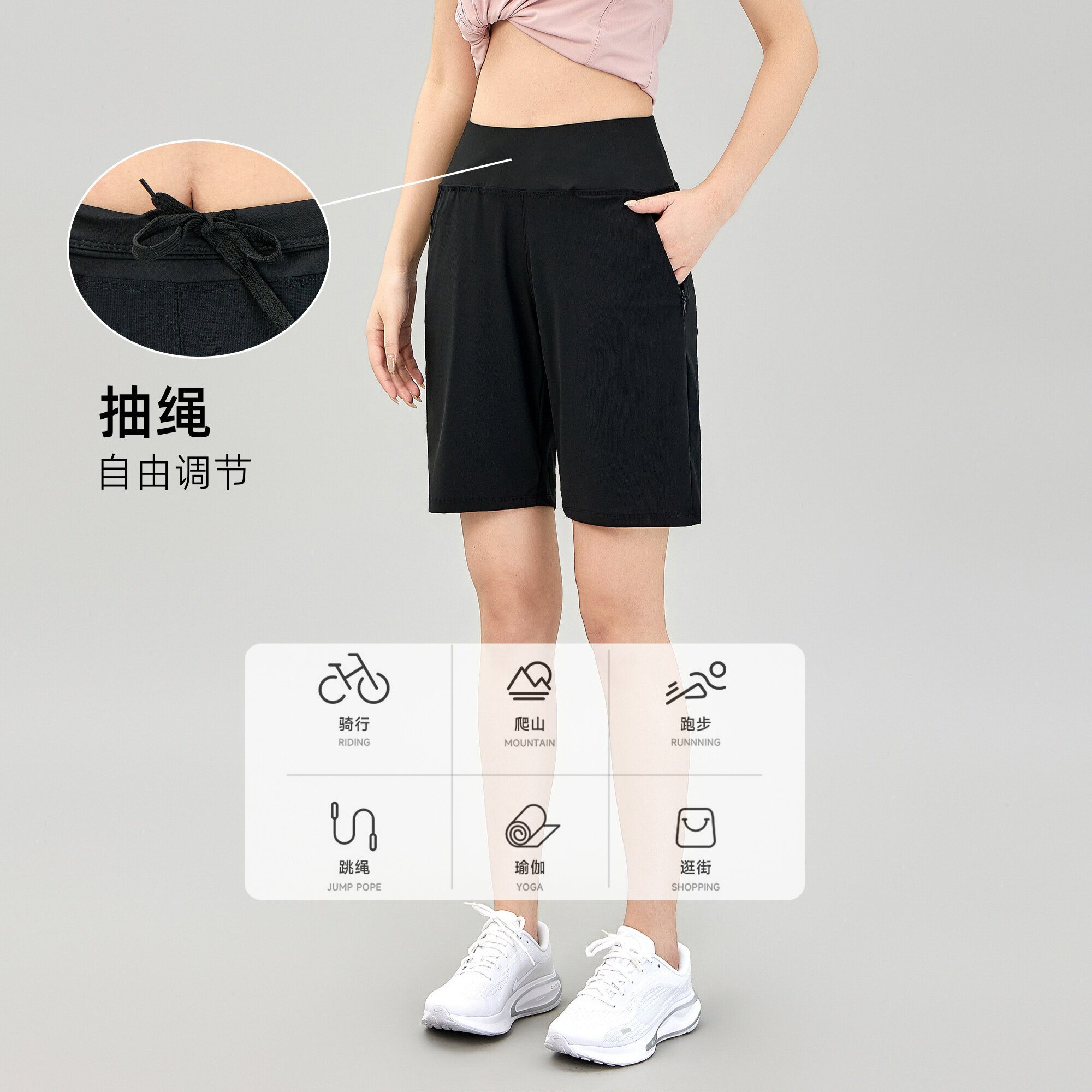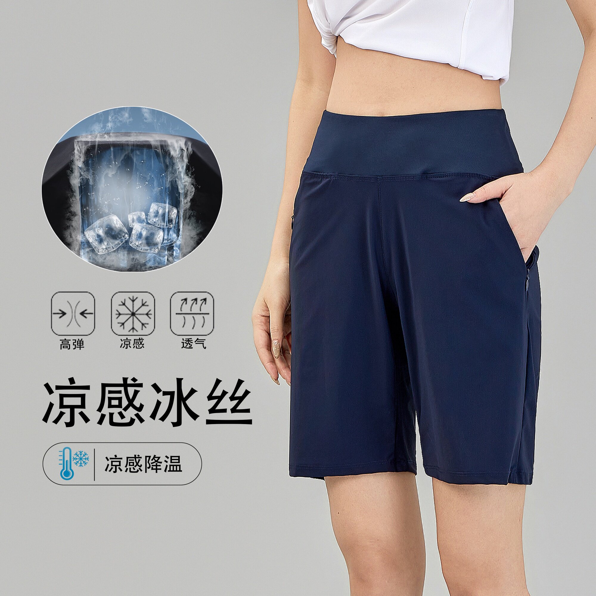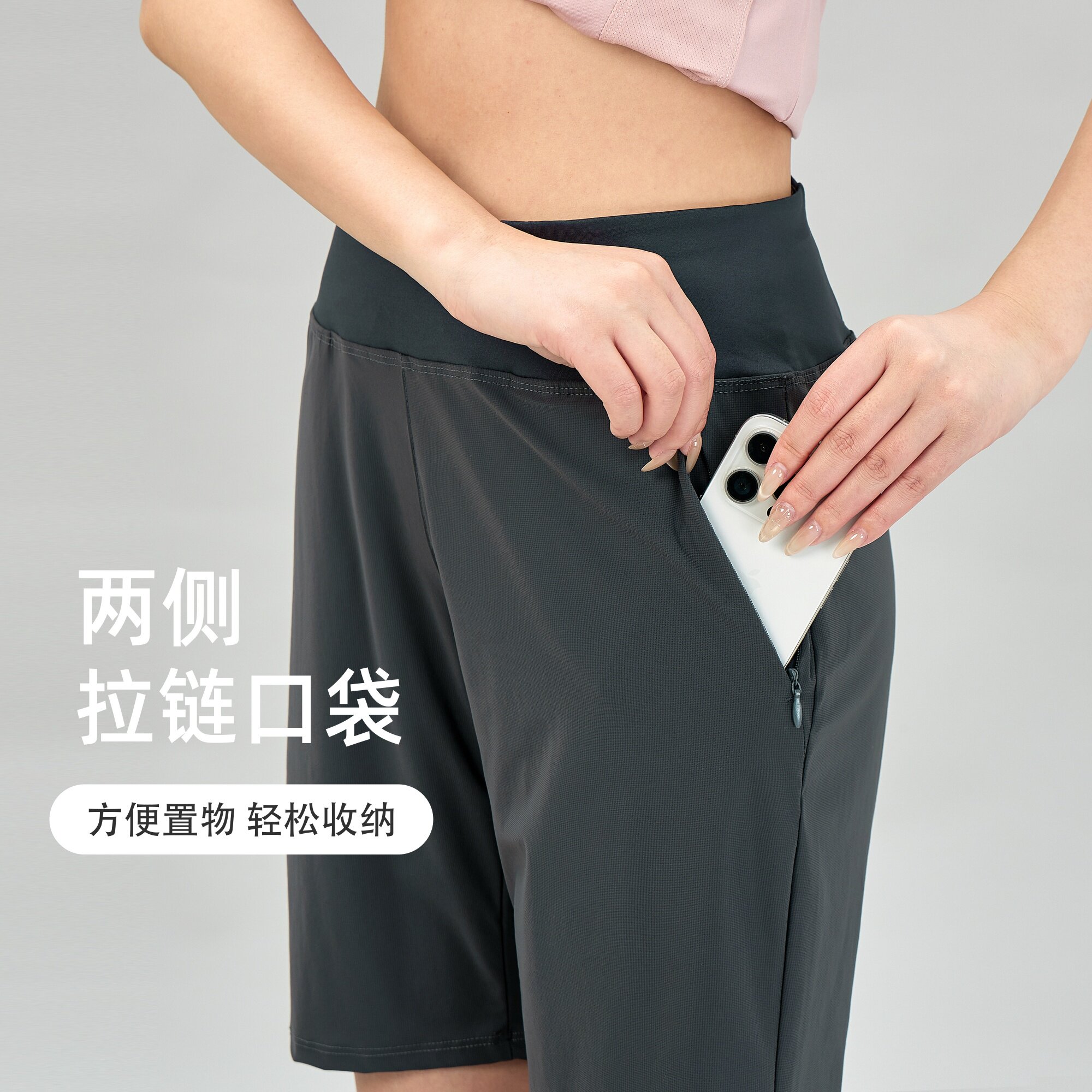 冰丝运动短裤女夏后腰口袋放手机宽松休闲瑜伽健身跑步速干五分裤