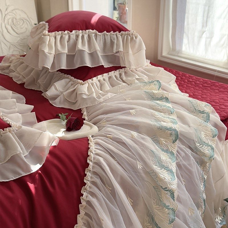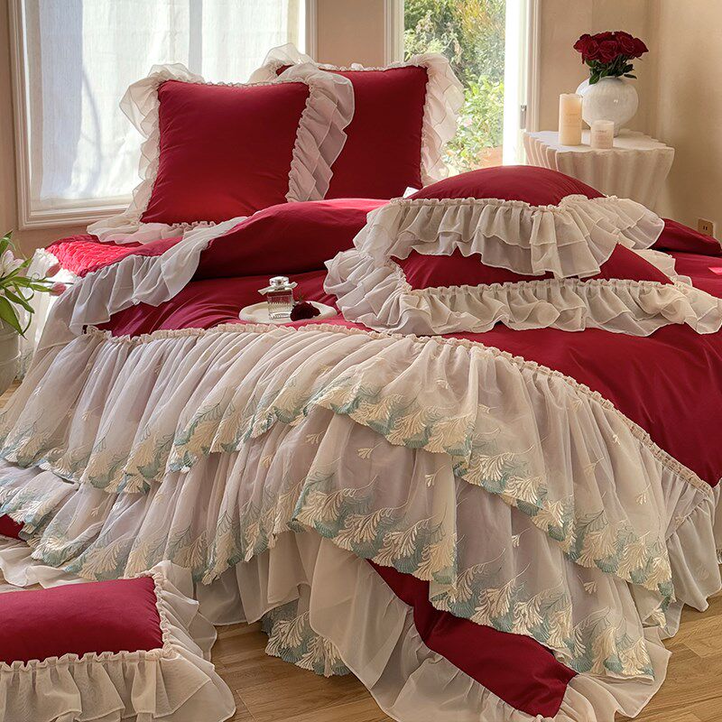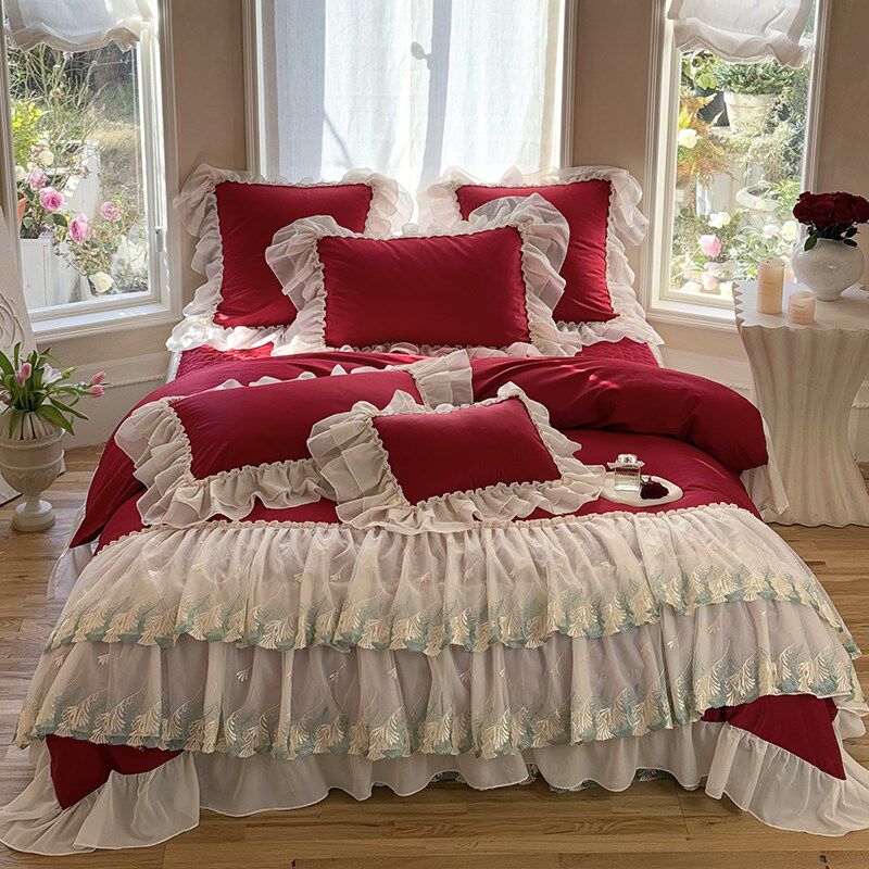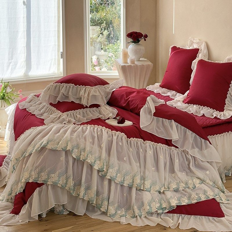 高端法式蕾丝全棉床盖款四件套酒红色结婚被套纯棉公主风陪嫁床品