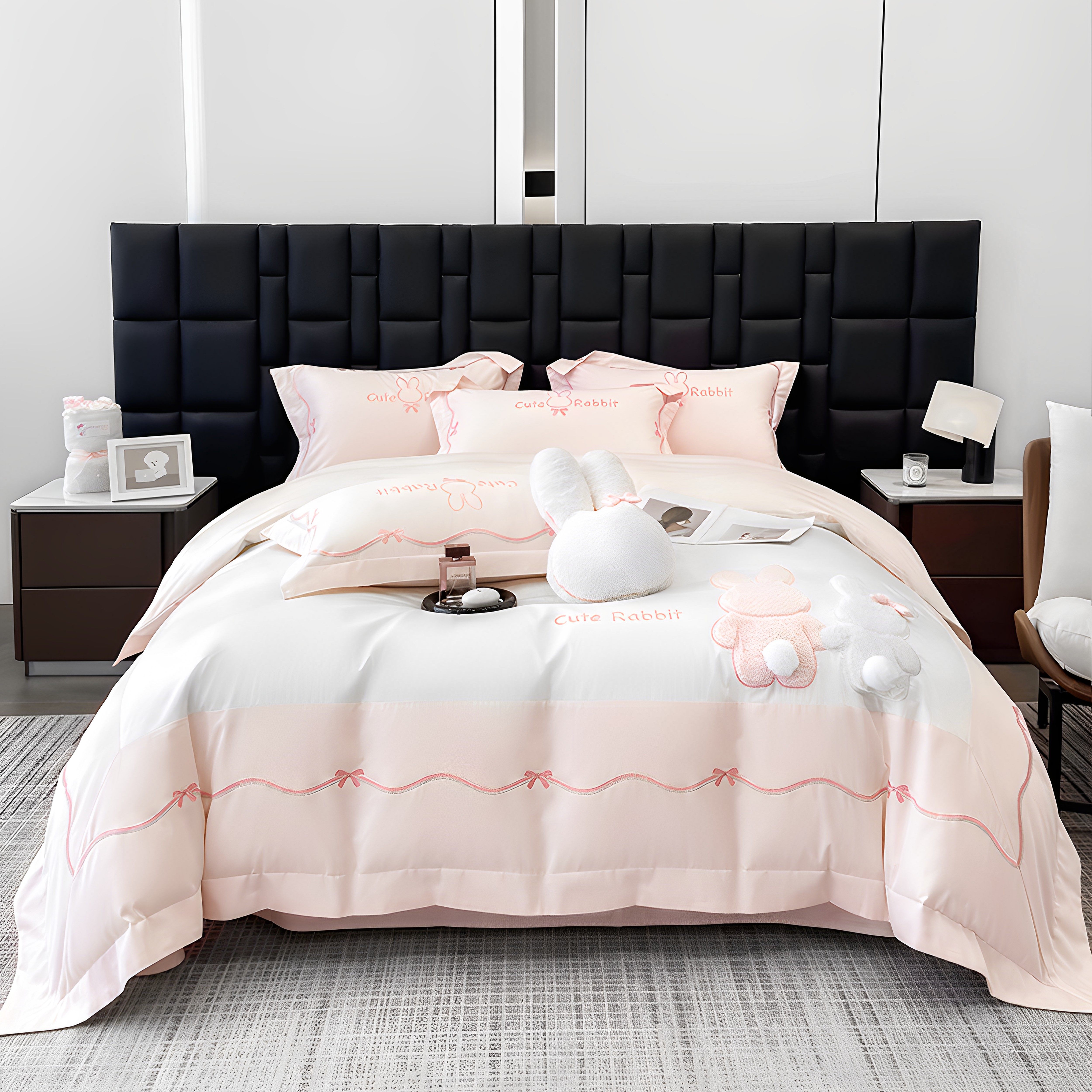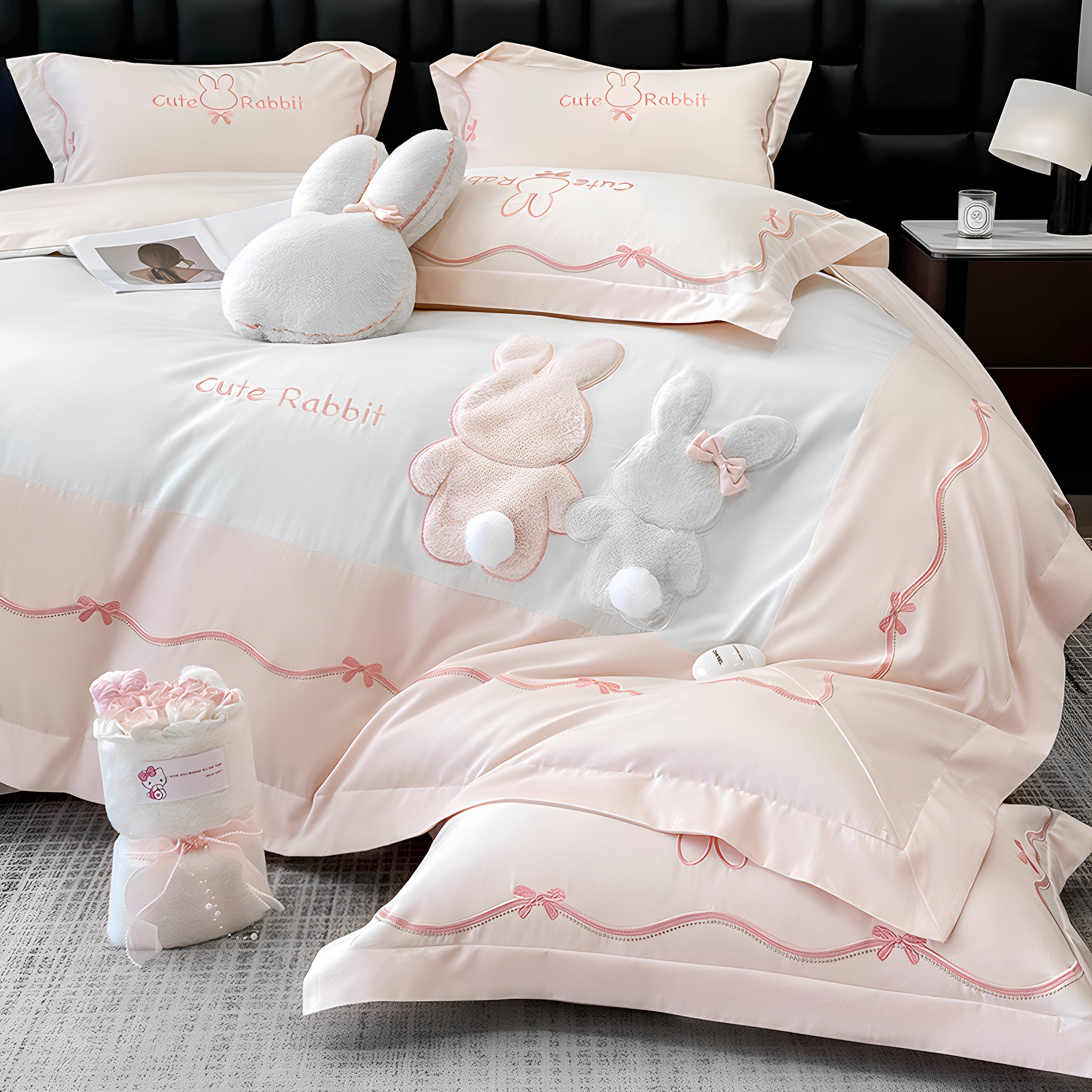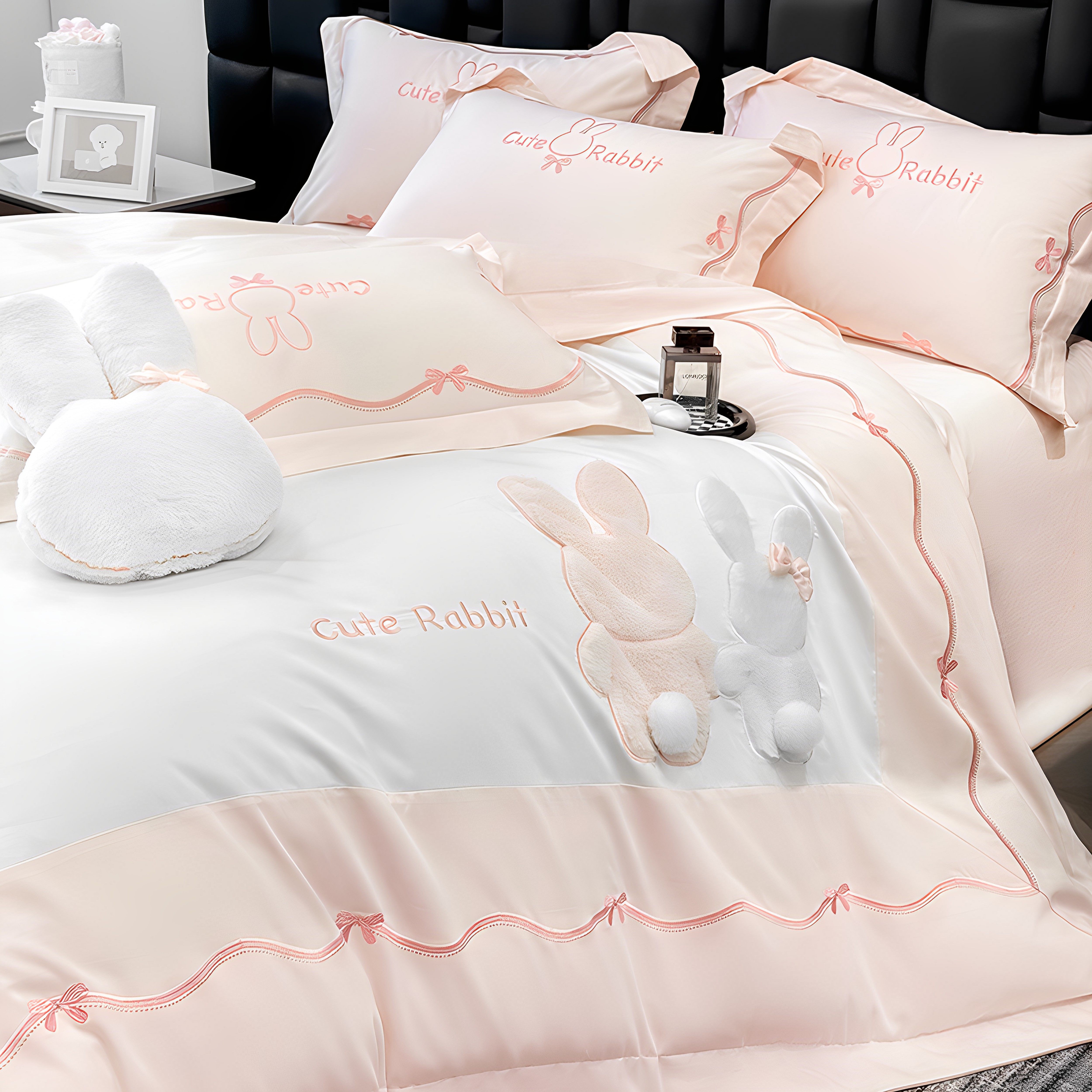 高级感小清新粉白色儿童长绒棉全棉纯棉床上用品四件套女孩三件套