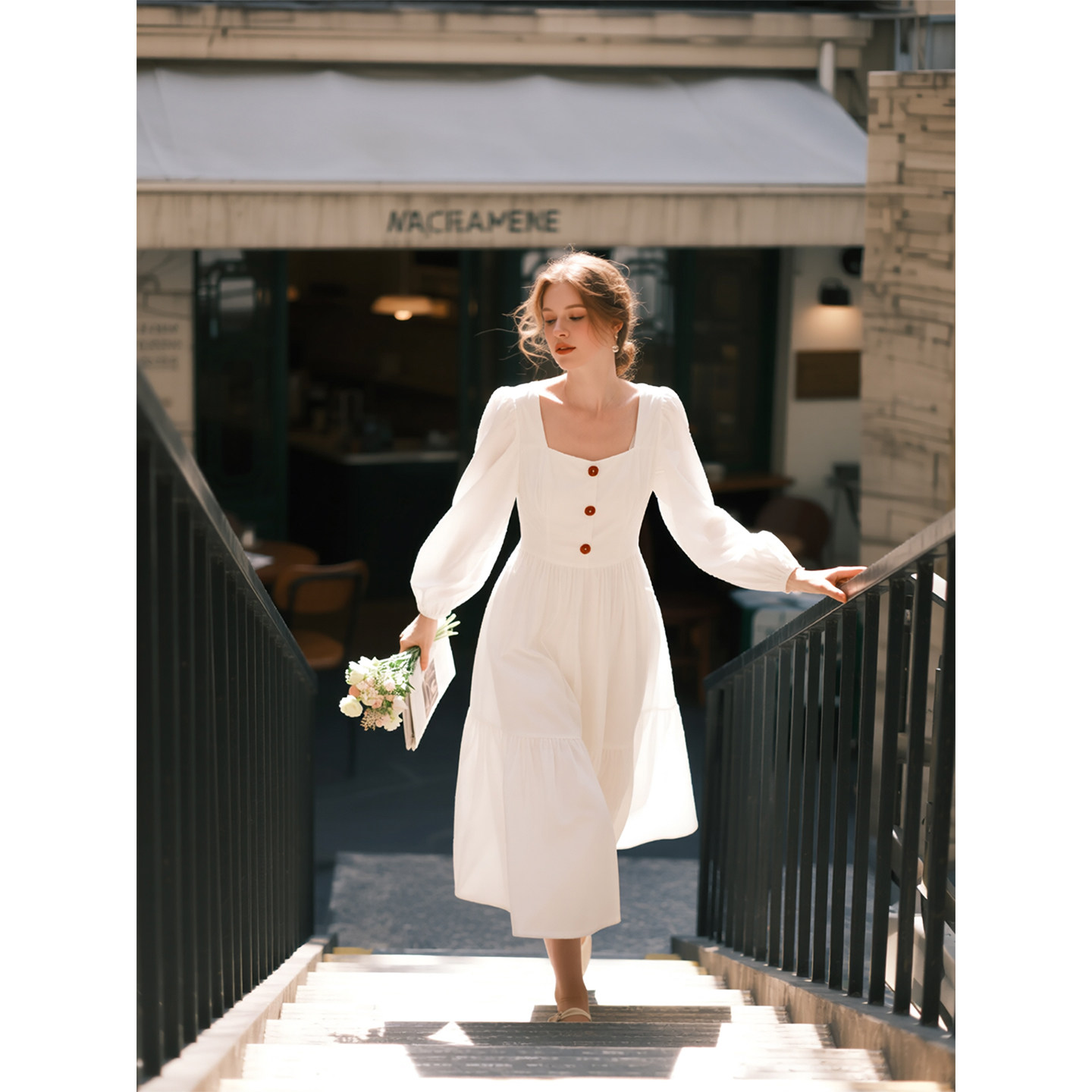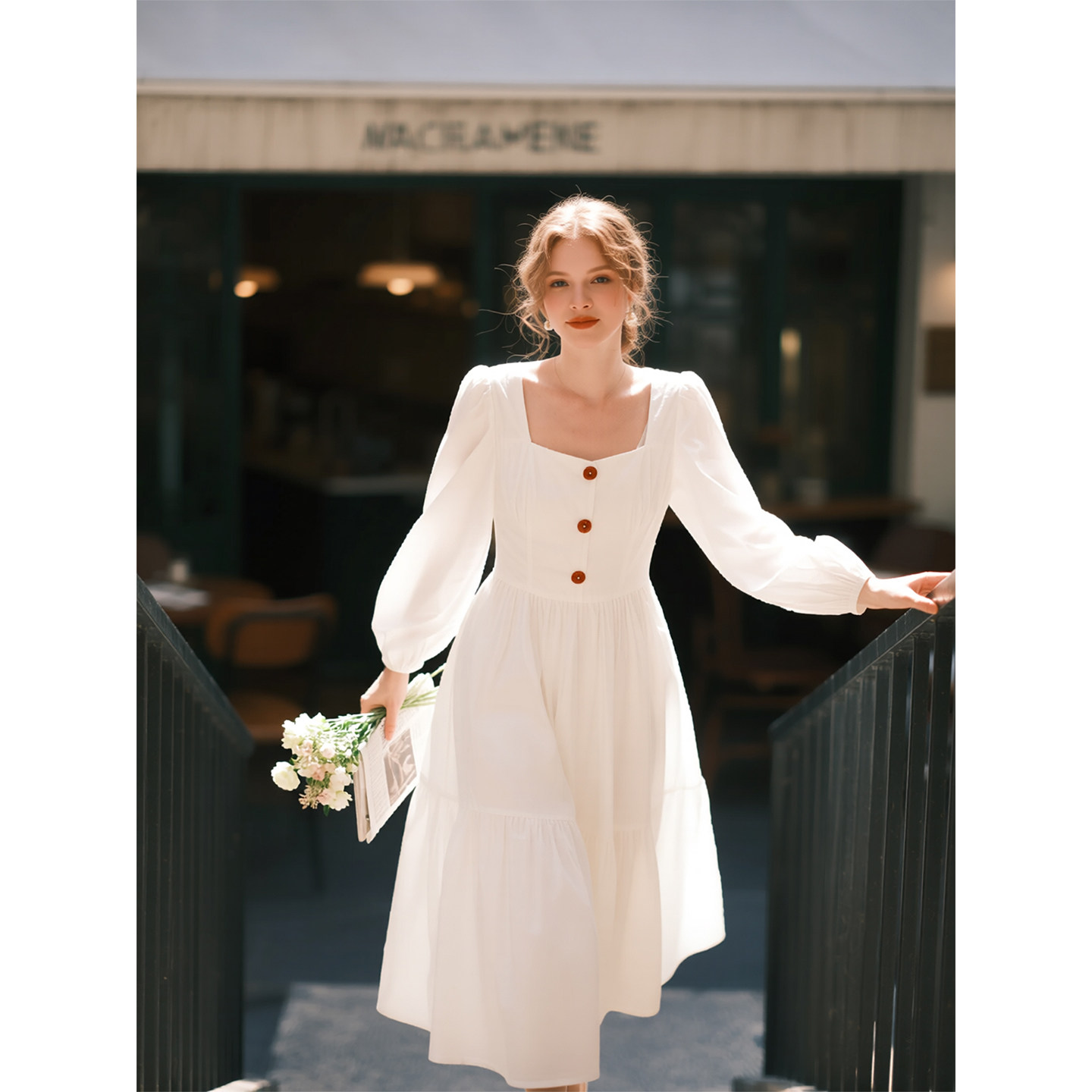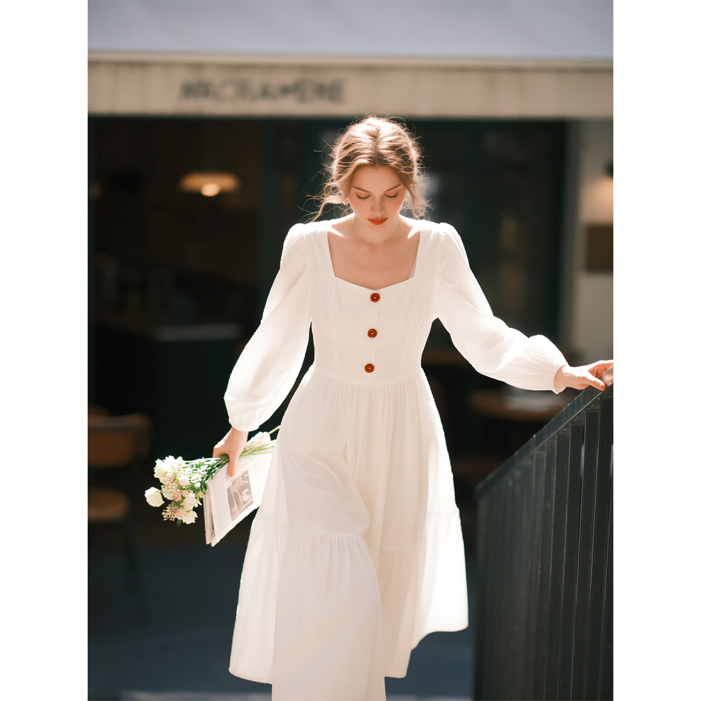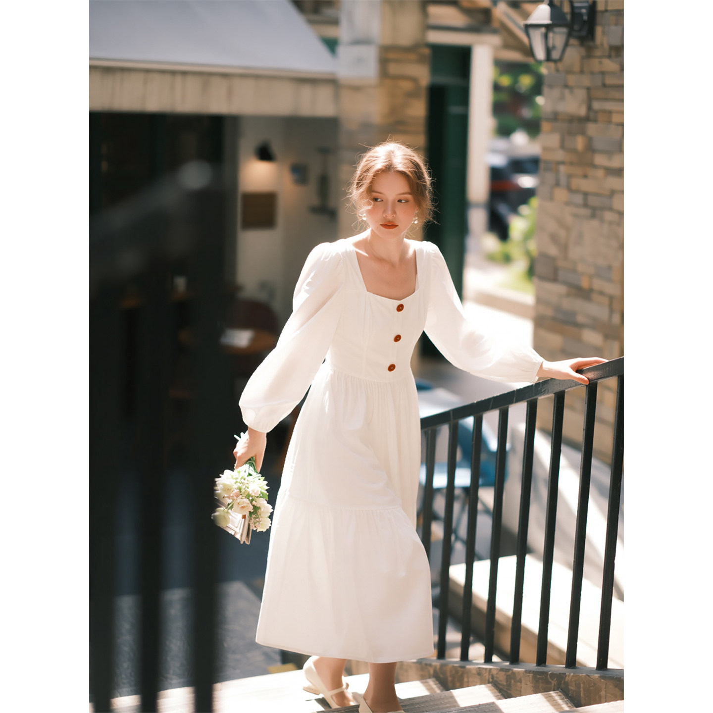 白色方领长袖连衣裙女2026年春季新款法式单排扣收腰气质a字长裙