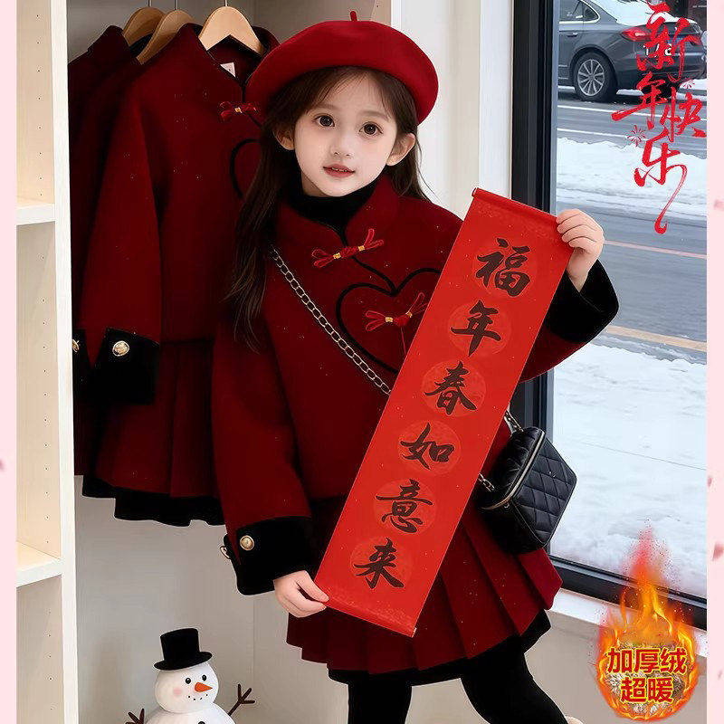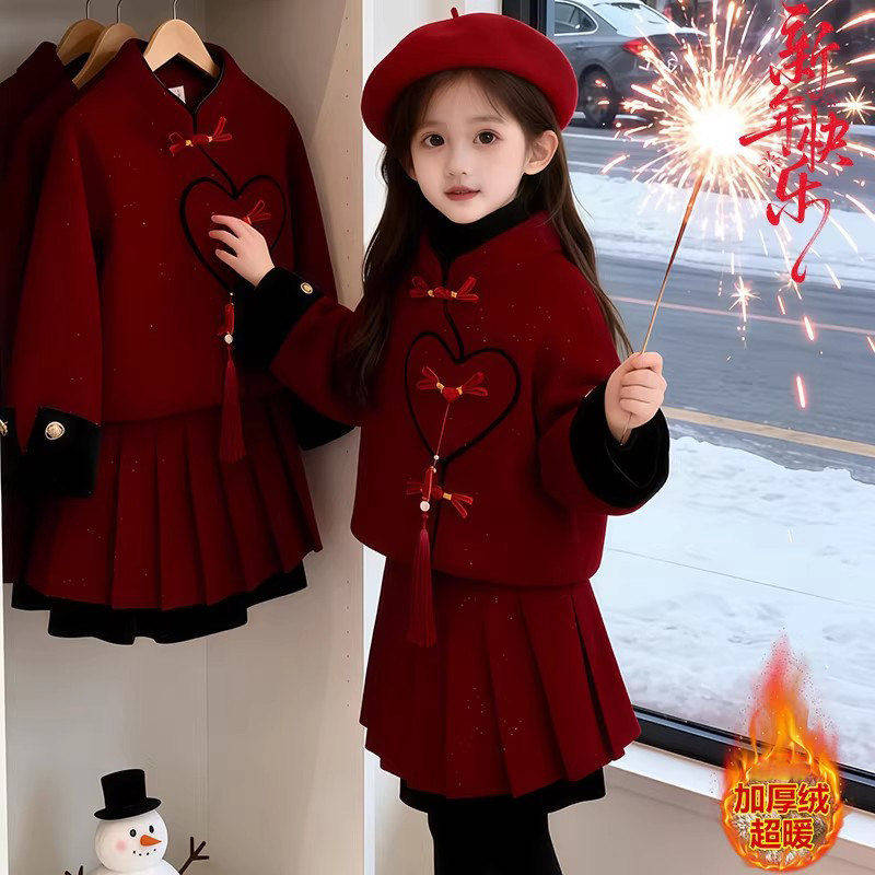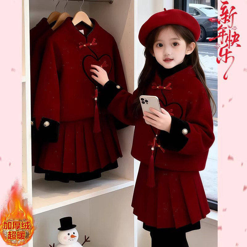 女童国风加绒小香风红色套装2025新款儿童喜庆拜年服好看裙子套装