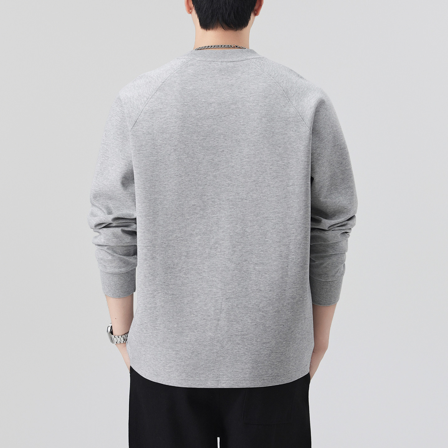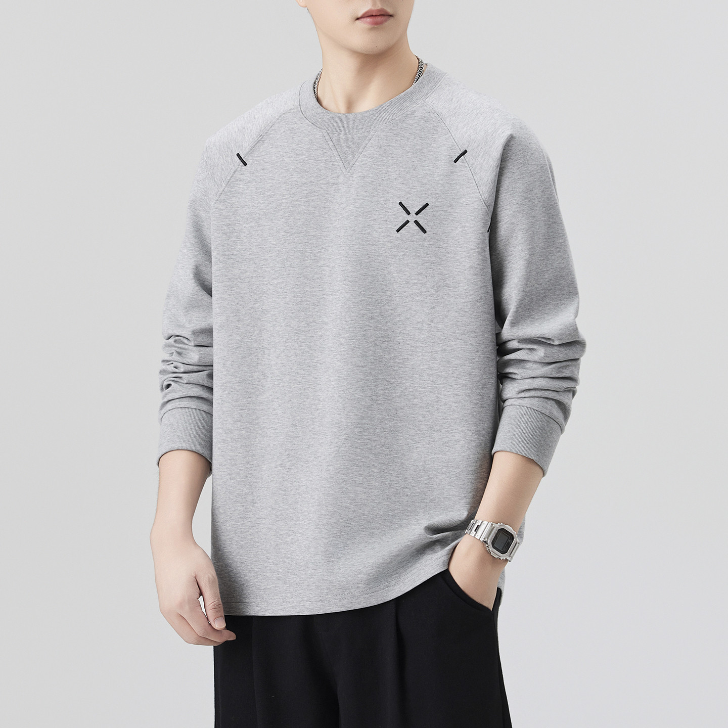 男式圆领灰色打底衫男款刺绣长袖t恤男2026新款春季简约套头卫衣