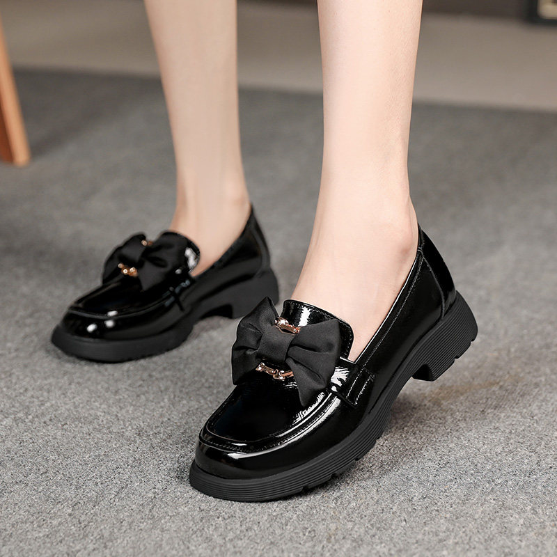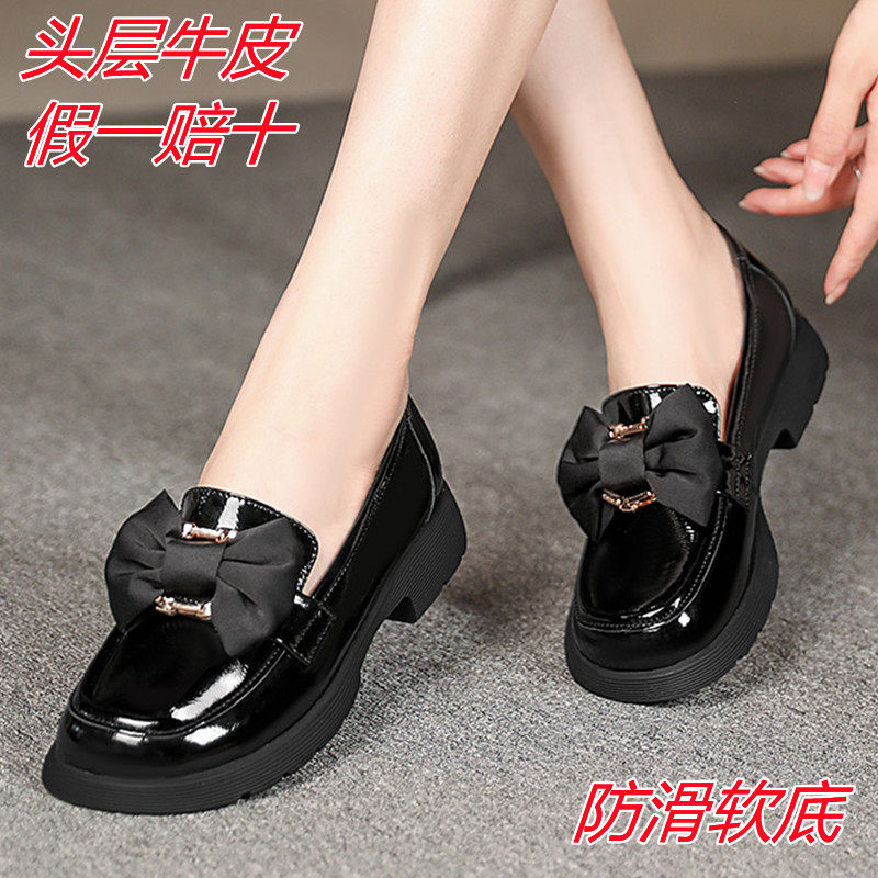 真皮乐福鞋女头层牛皮2023新款蝴蝶结黑色小皮鞋女平底百搭单皮鞋
