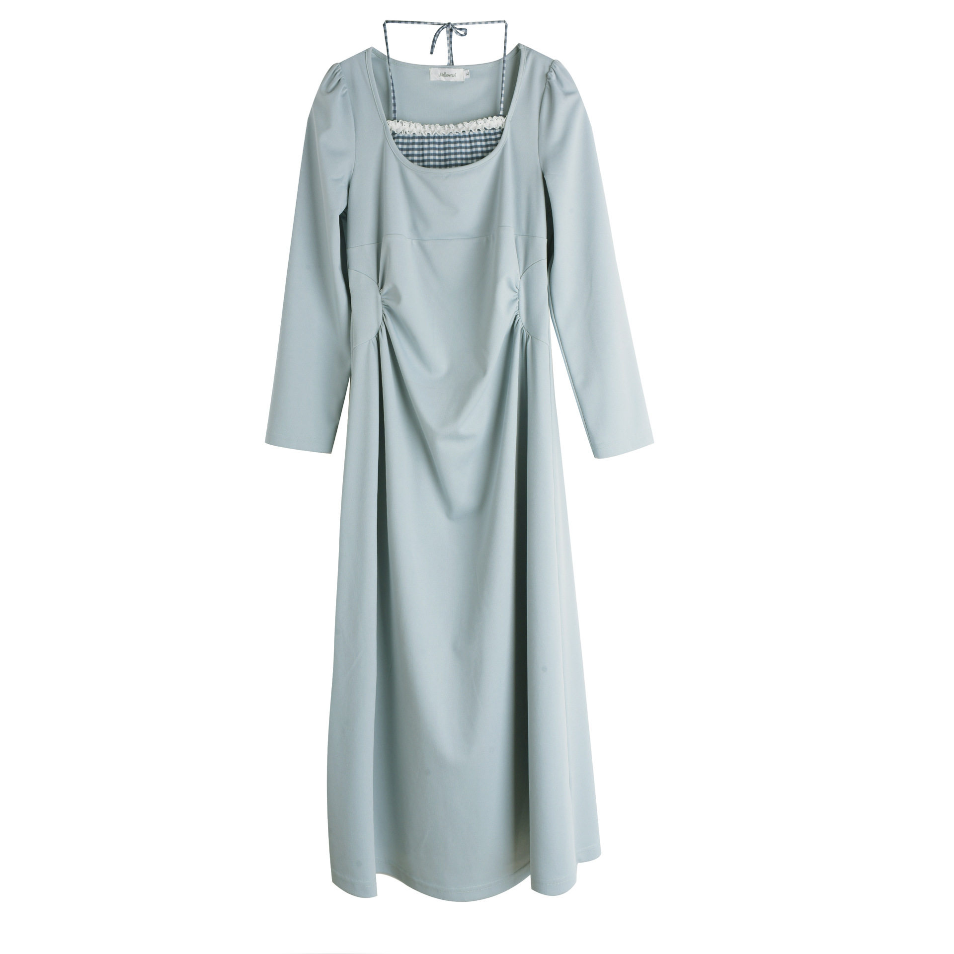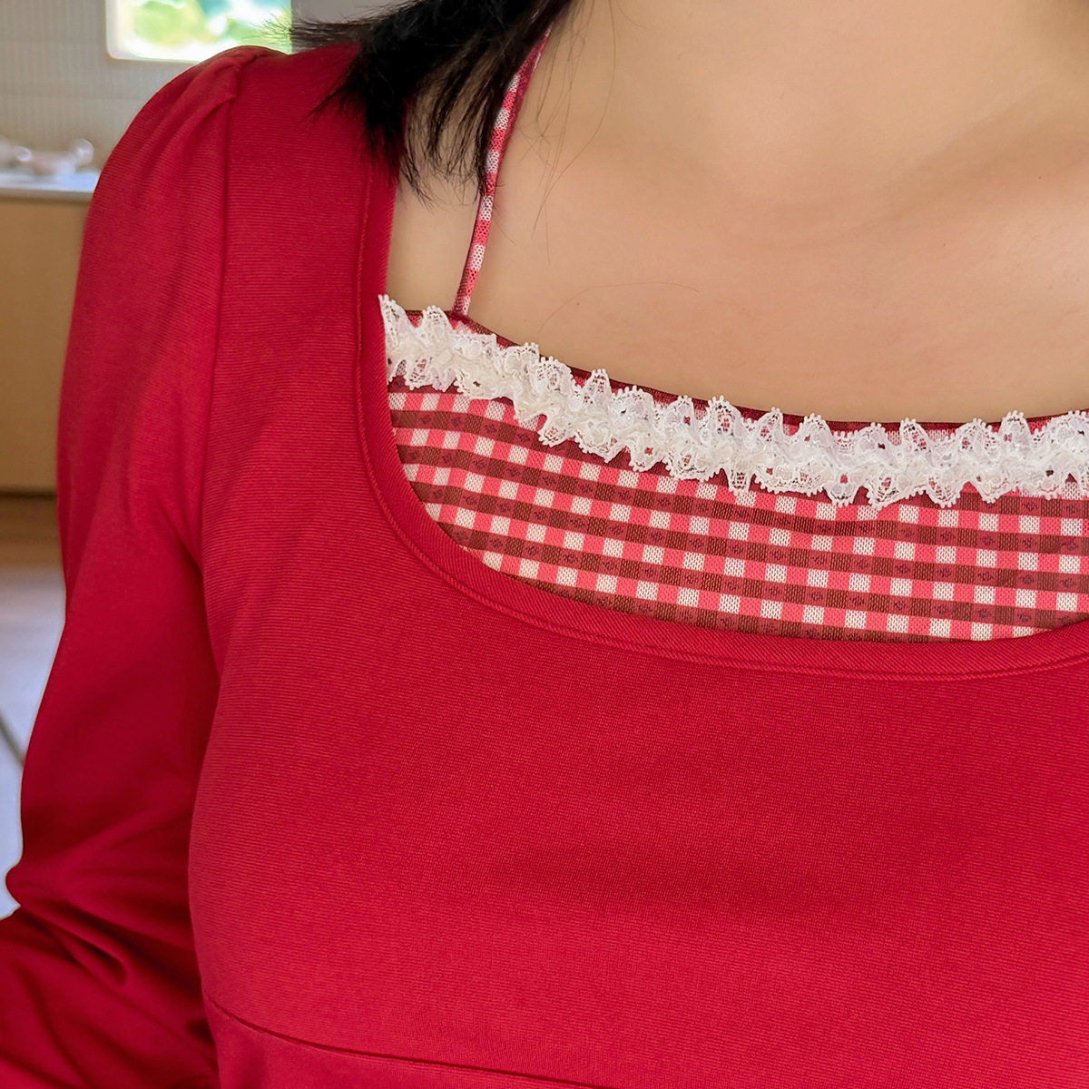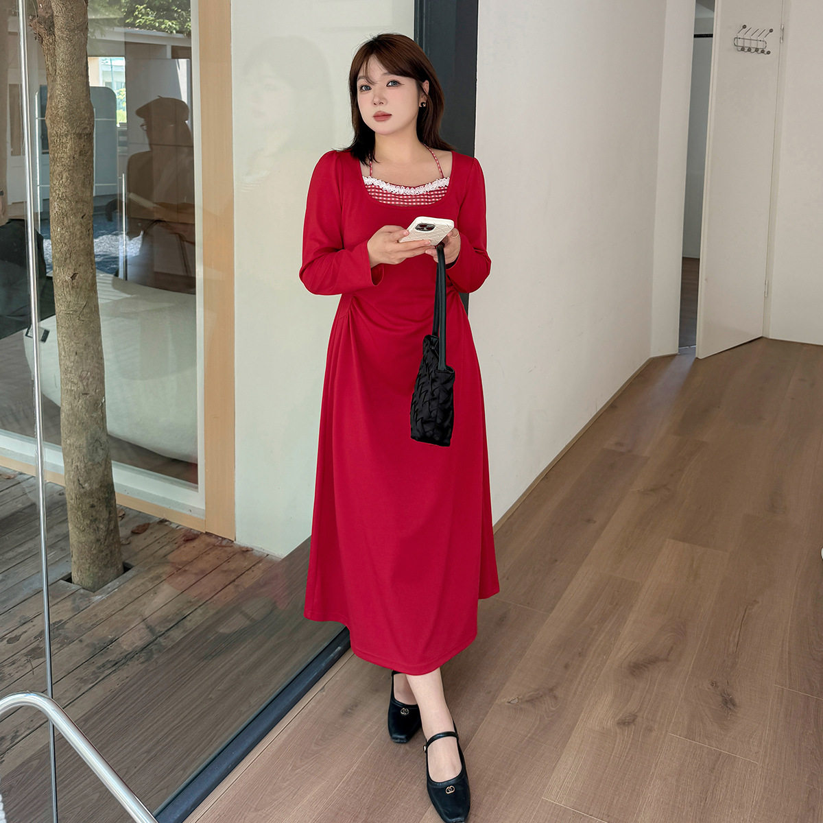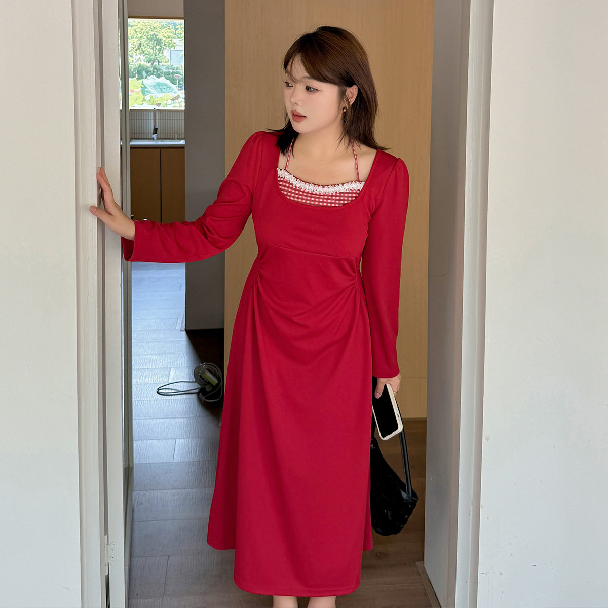 大码女装200斤胖mm秋季新款显瘦假两件挂脖红色敬酒服长袖连衣裙