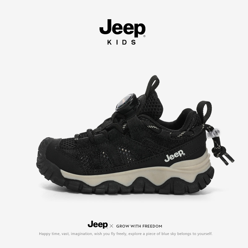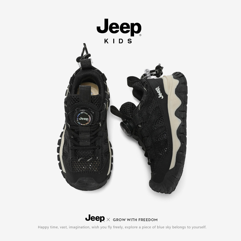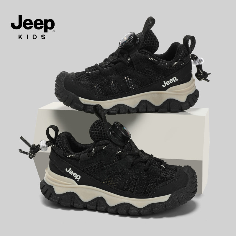 jeep黑色男童鞋运动鞋夏季薄款透气儿童网面防滑户外登山老爹潮鞋