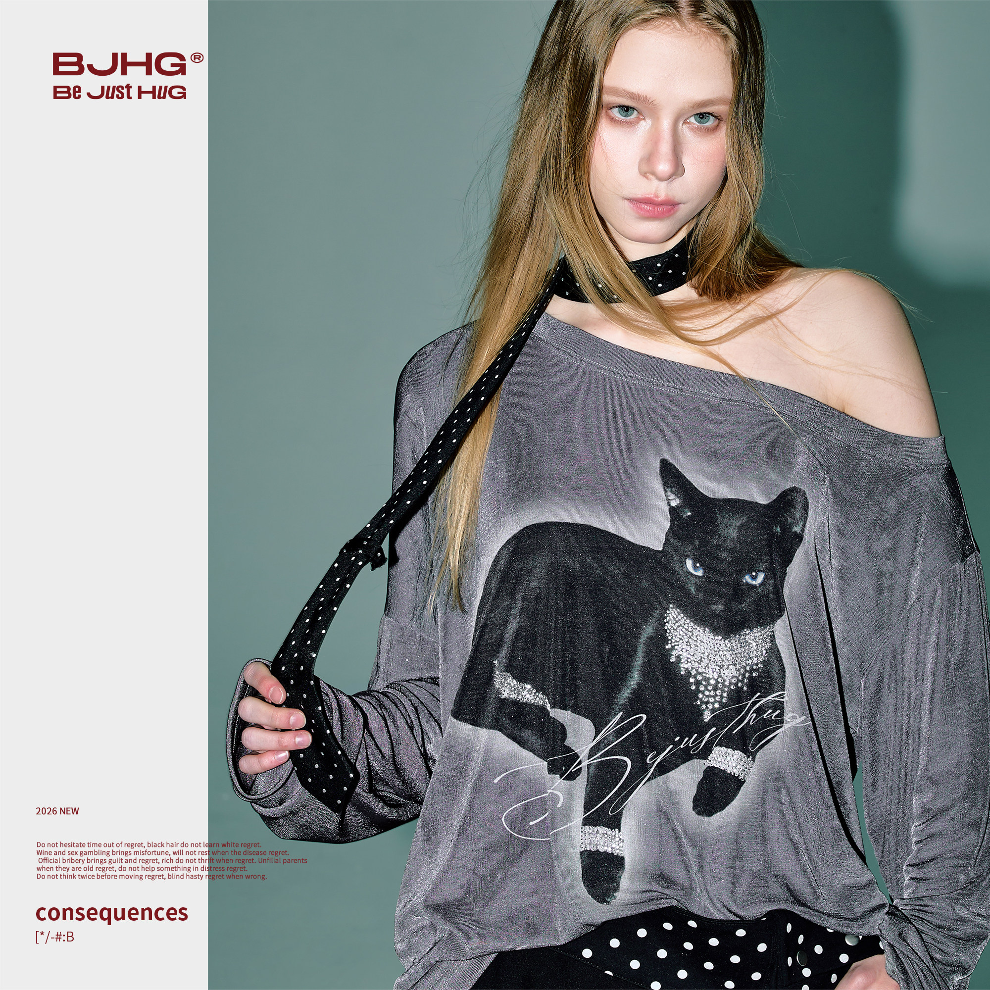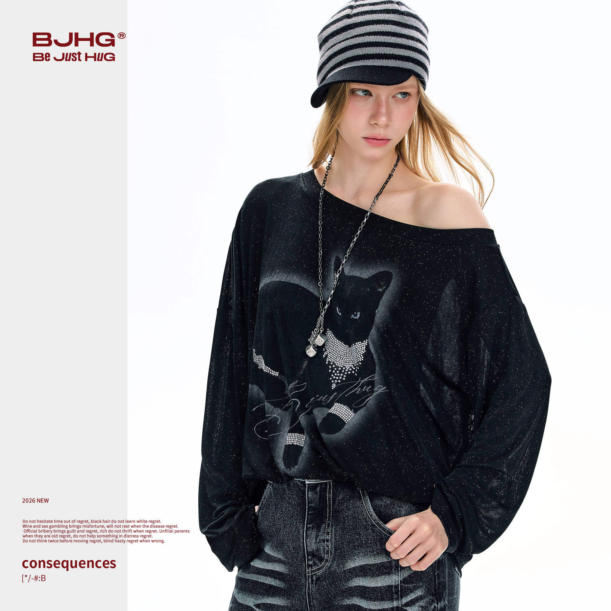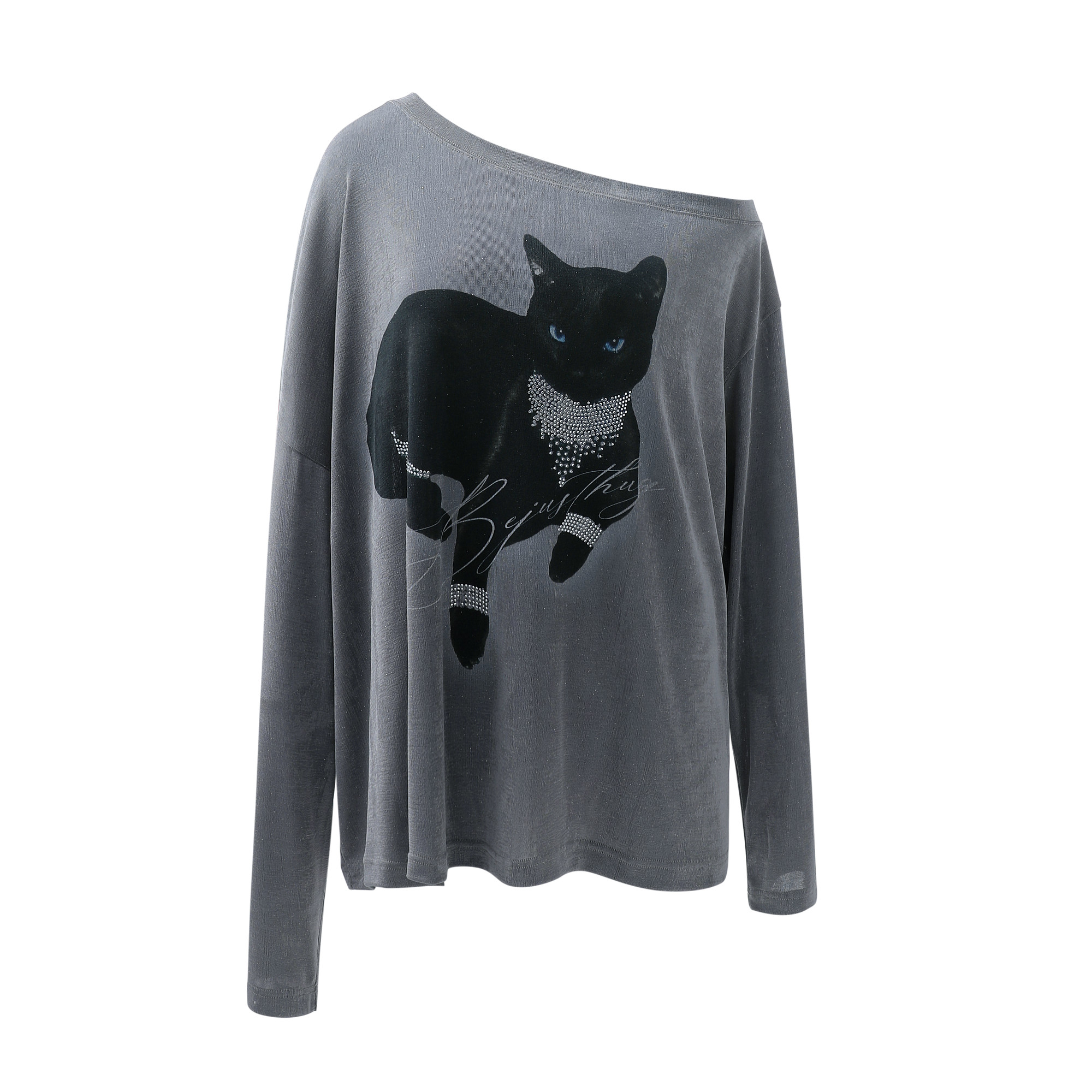 BJHG不计后果斜肩长袖T恤女款2026新款春夏洒银黑猫印花罩衫上衣