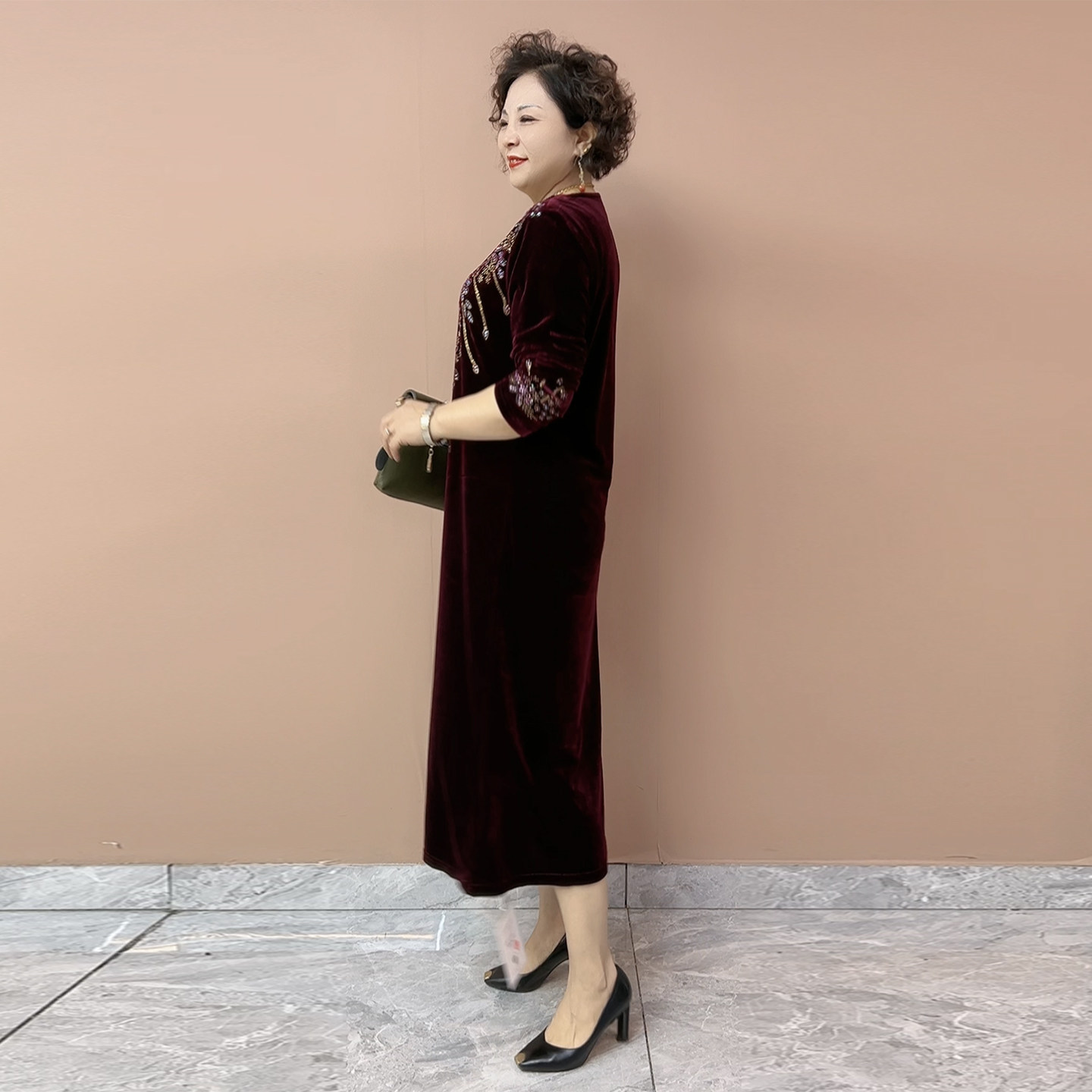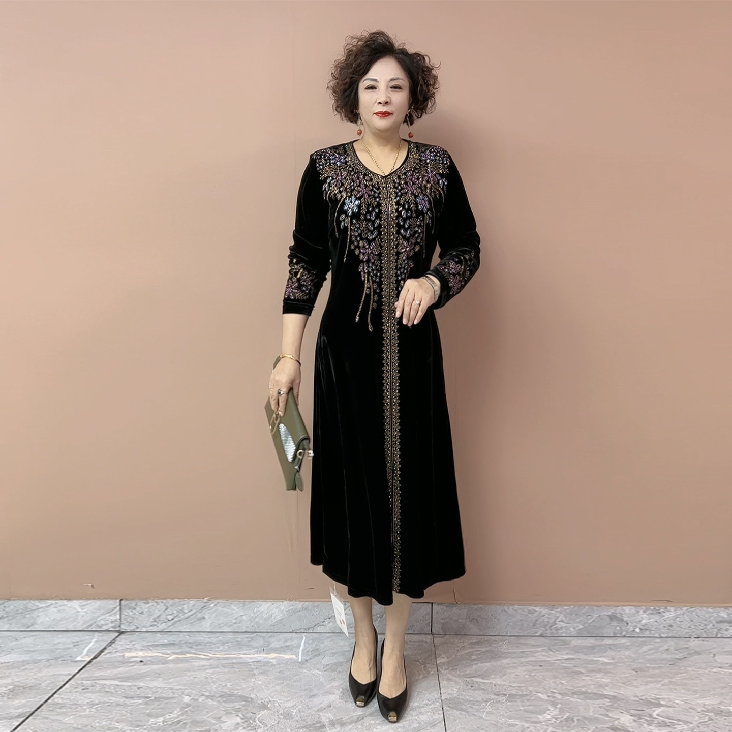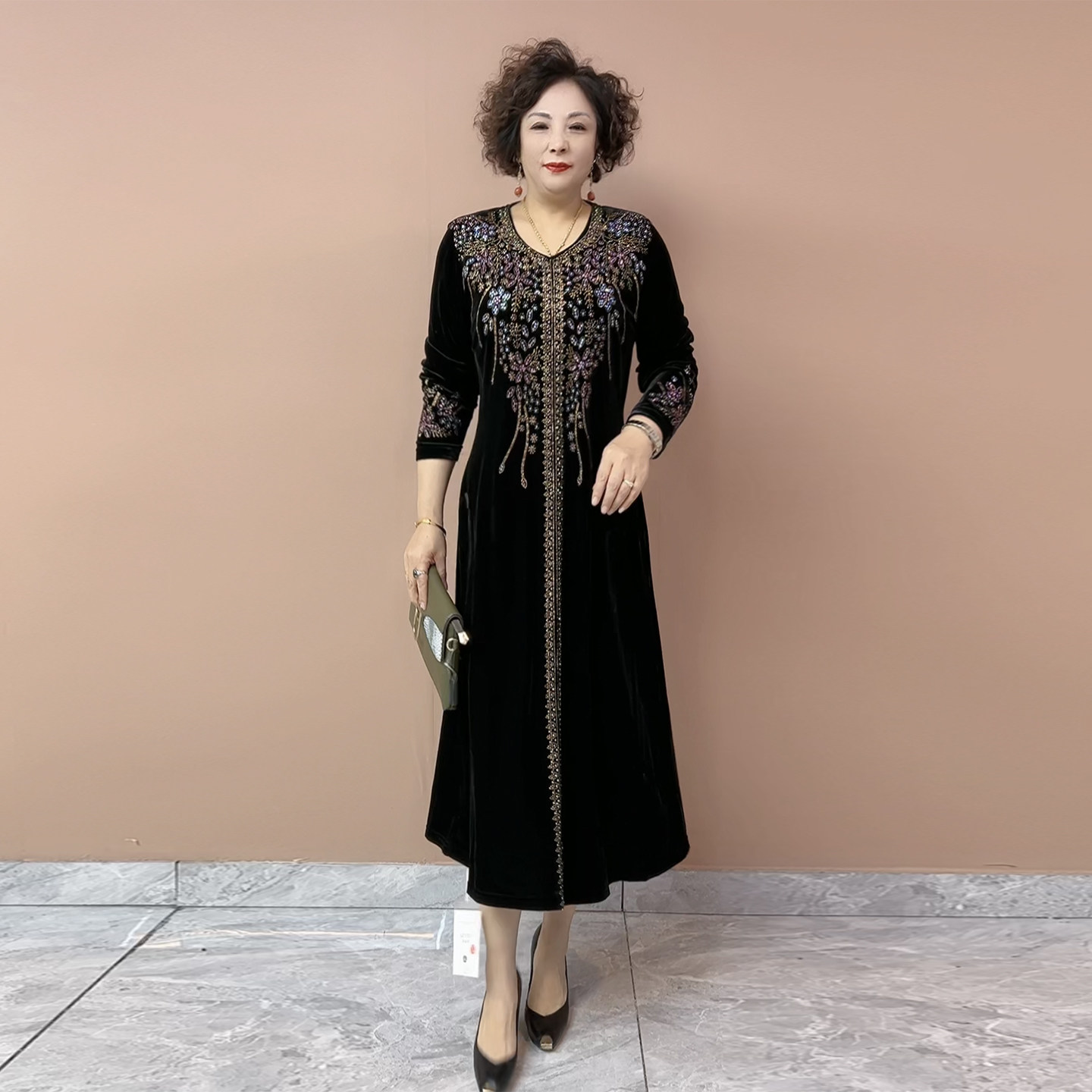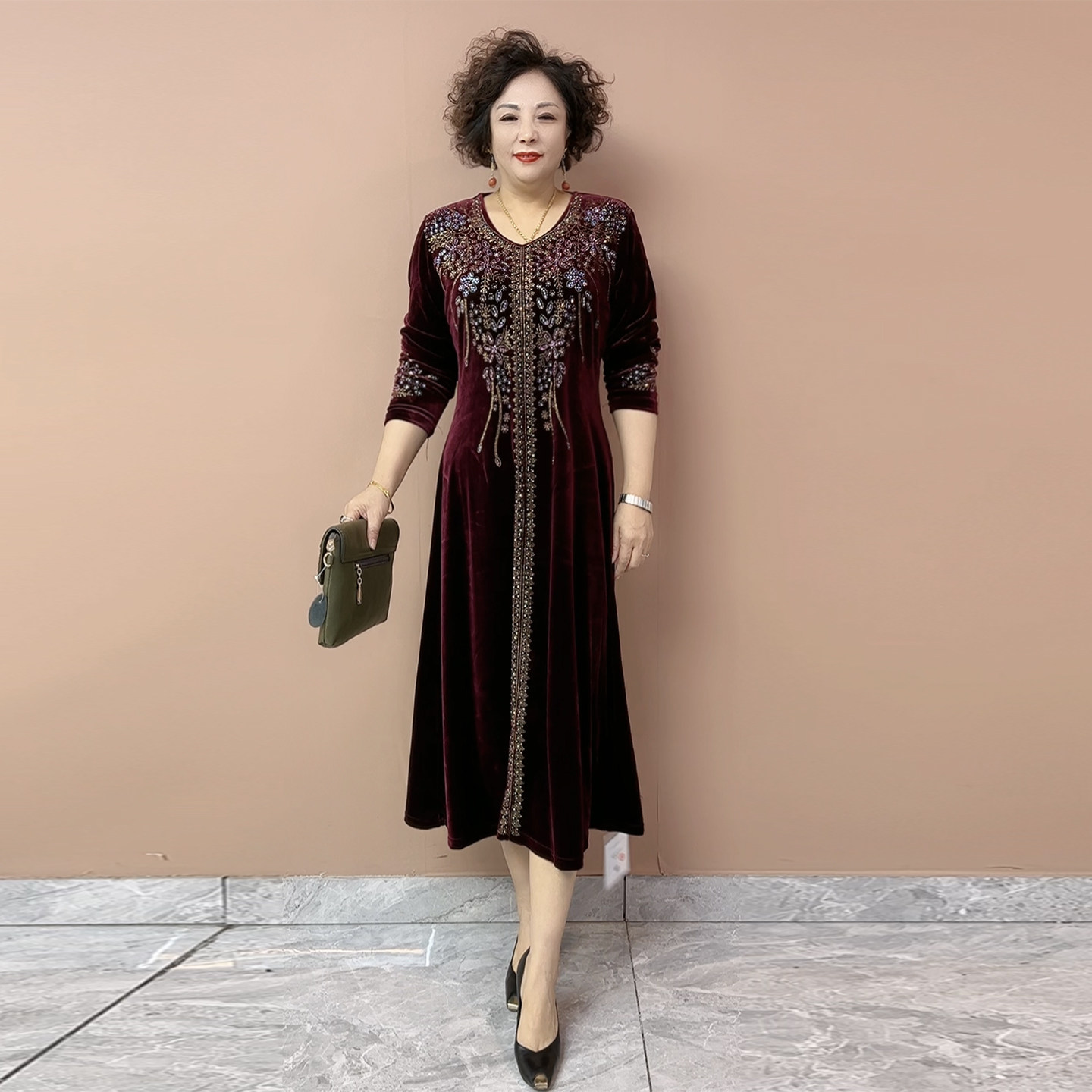 重工烫钻丝绒连衣裙秋冬新款中老年妈妈大码遮肚显瘦过膝长款裙子