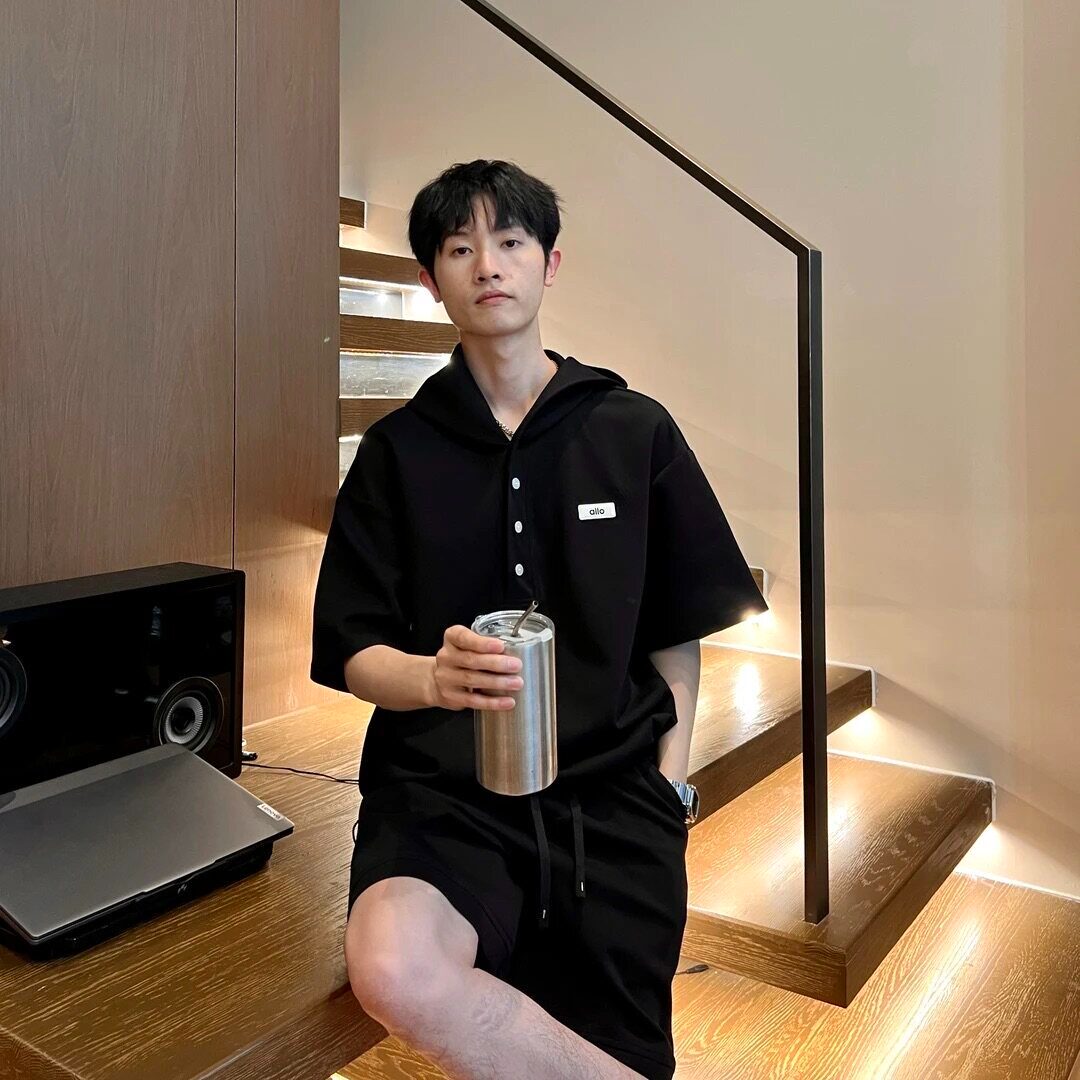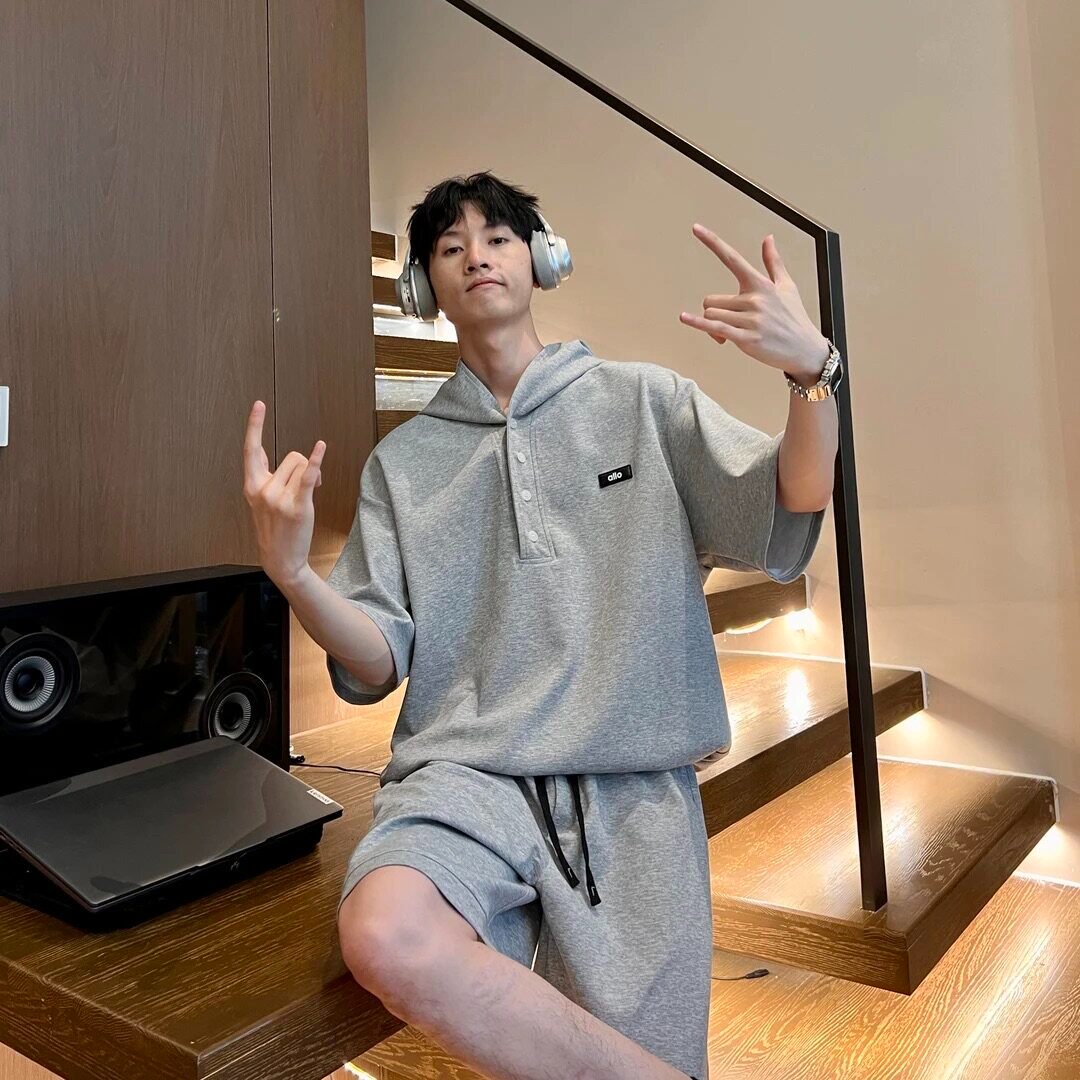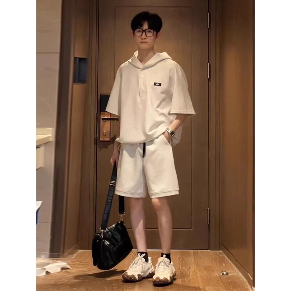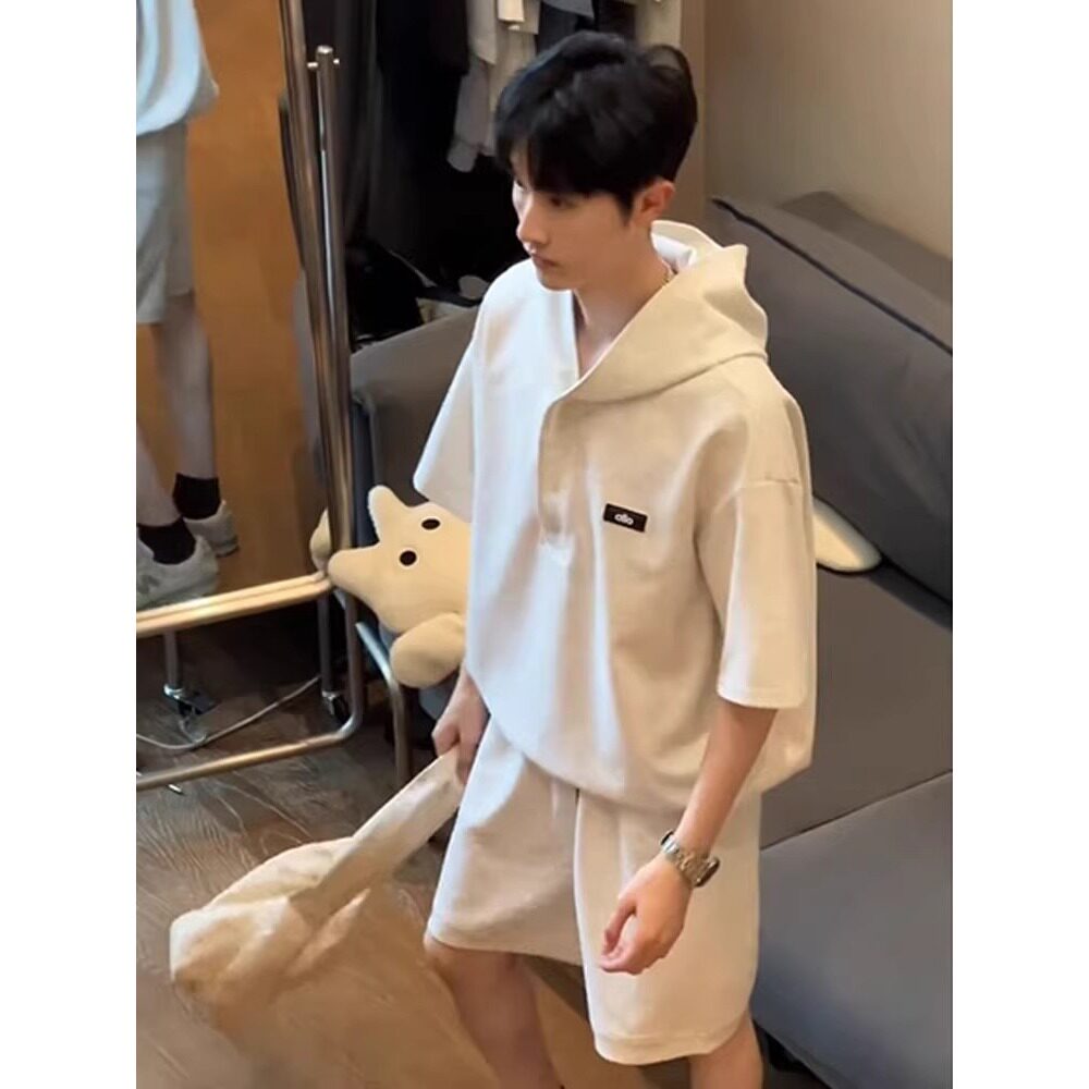 夏季短袖t恤套装男孩初中高中学生帅气冰丝l连帽衫青少年大童男装