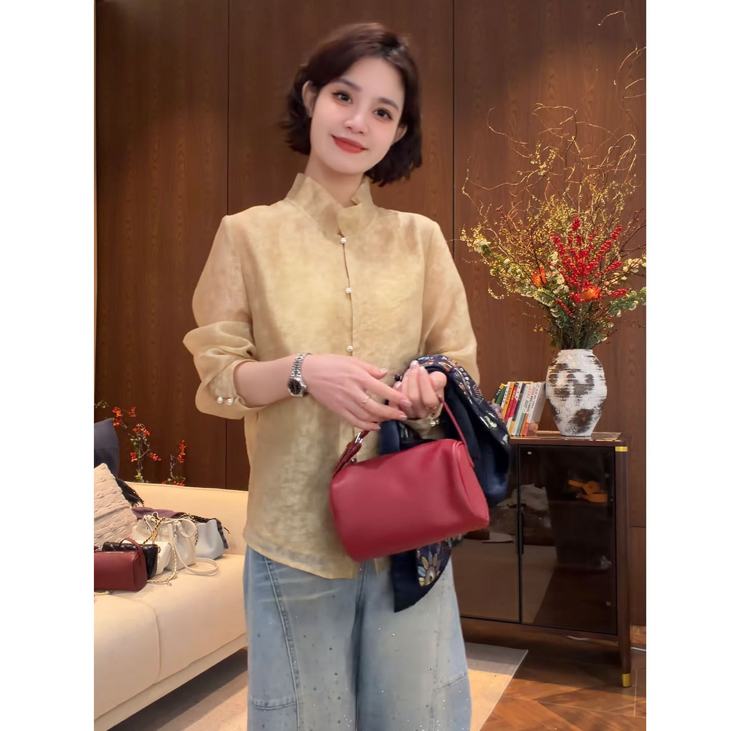 新中式衬衫女款2026春季休闲百搭花苞领衬衣减龄洋气国风提花上衣