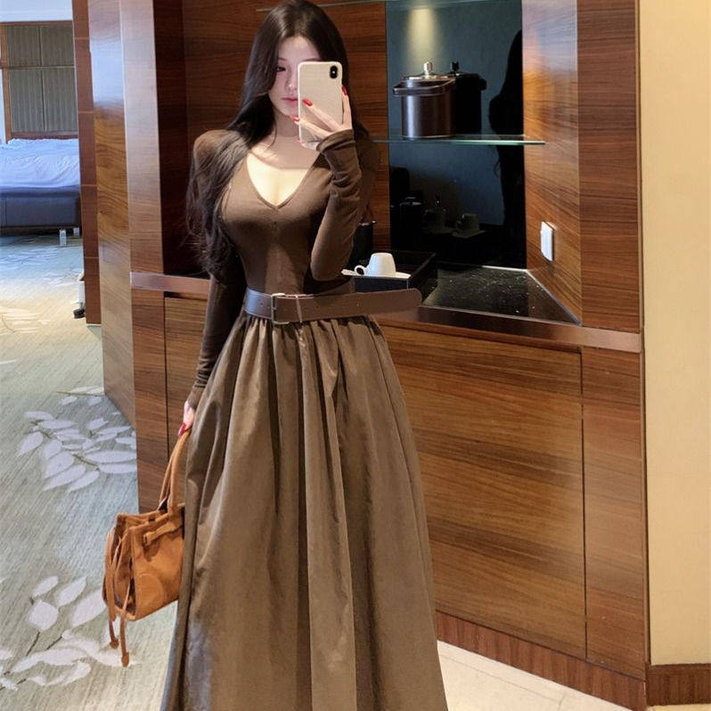 复古咖色拼接v领长袖连衣裙女秋冬收腰大摆裙子气质显瘦a字长裙