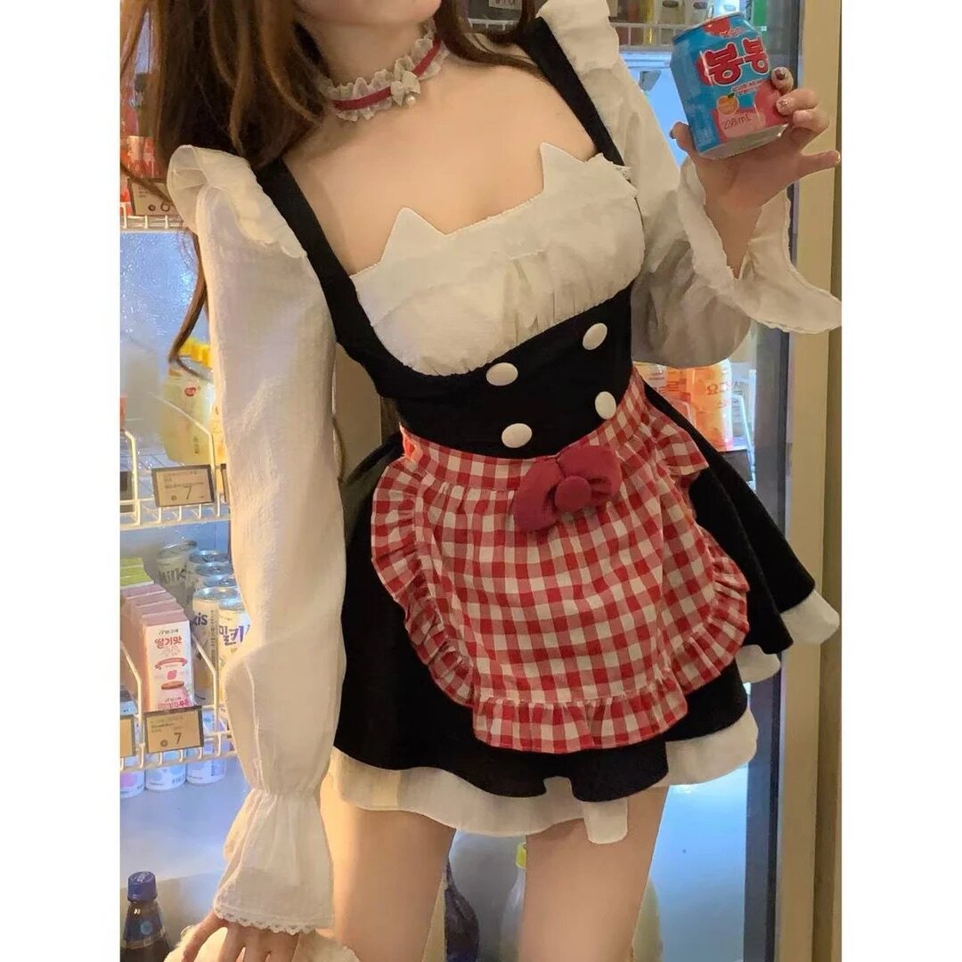 甜美纯欲风可爱女仆裙拼接长袖双排扣收腰蓬蓬连衣裙粉色围裙套装
