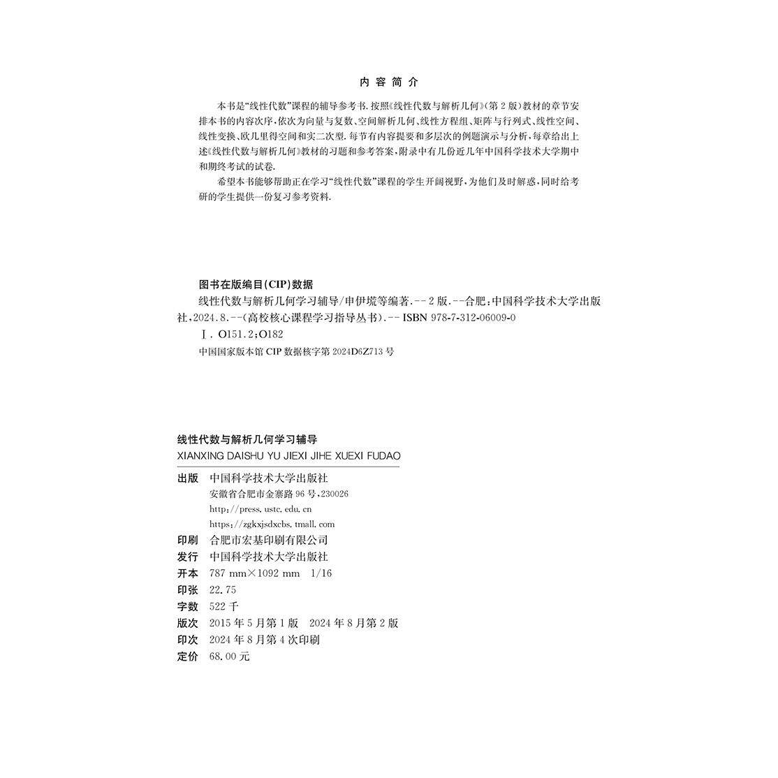 官方正版】中科大 线性代数与解析几何学习辅导 第2版二版 申伊塃 郑业龙 陈效群张韵华 李烔生查建国线性代数教材配套学习指导书