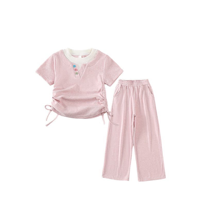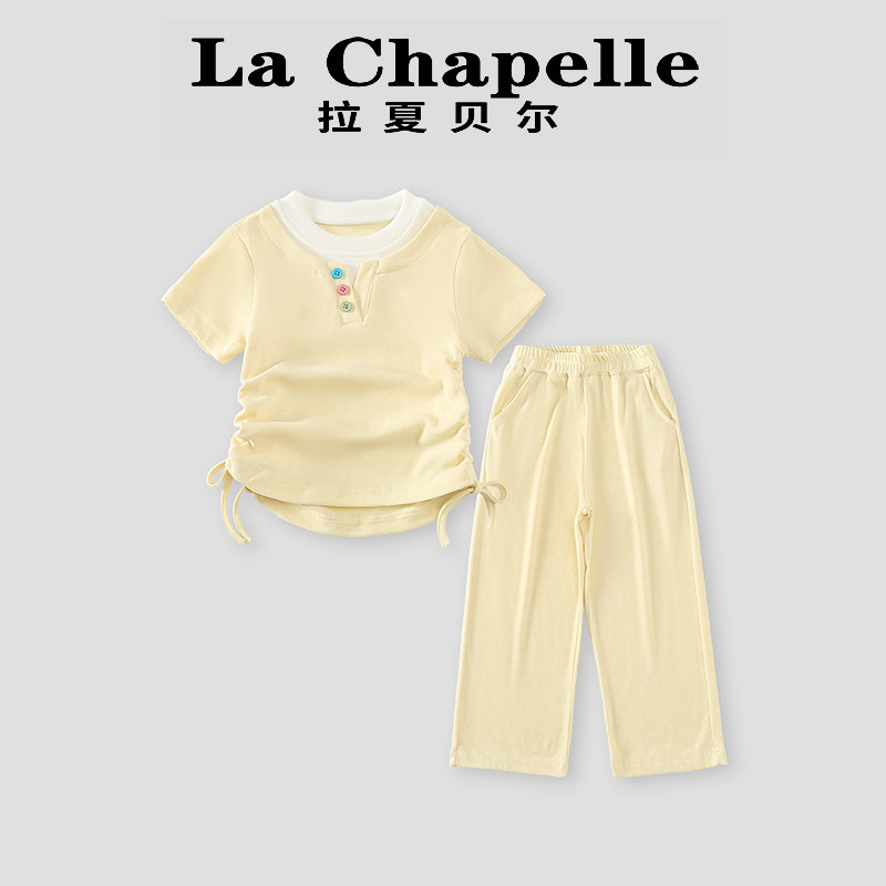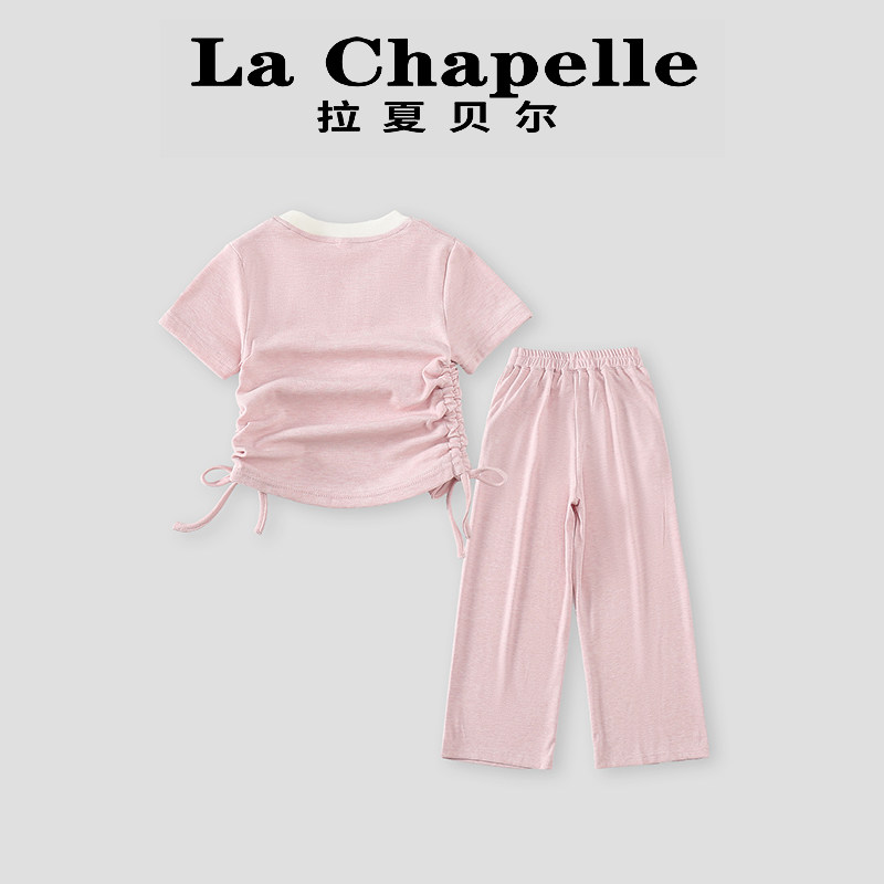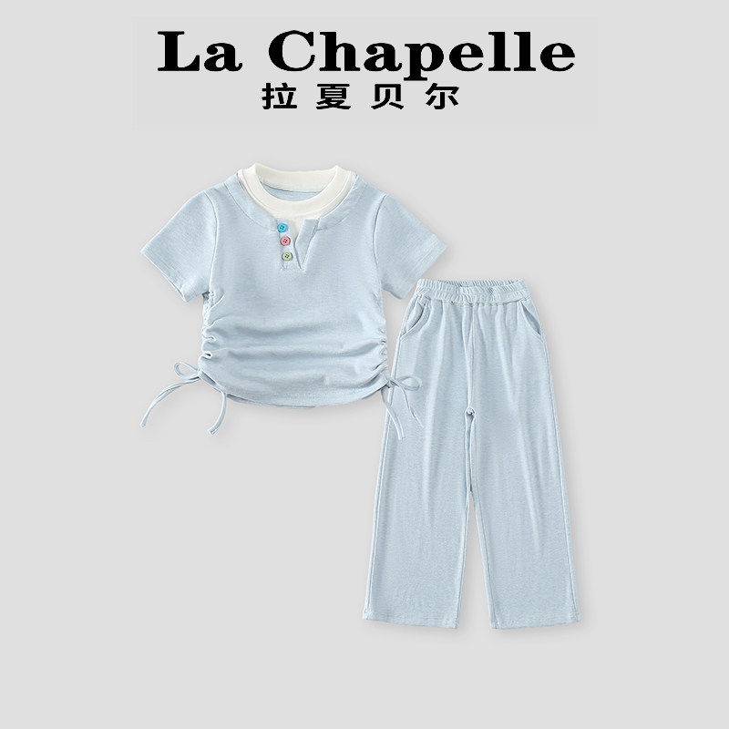 拉夏贝尔童装女童夏天衣服夏季甜美纯色短袖短裤两件套女宝宝套装