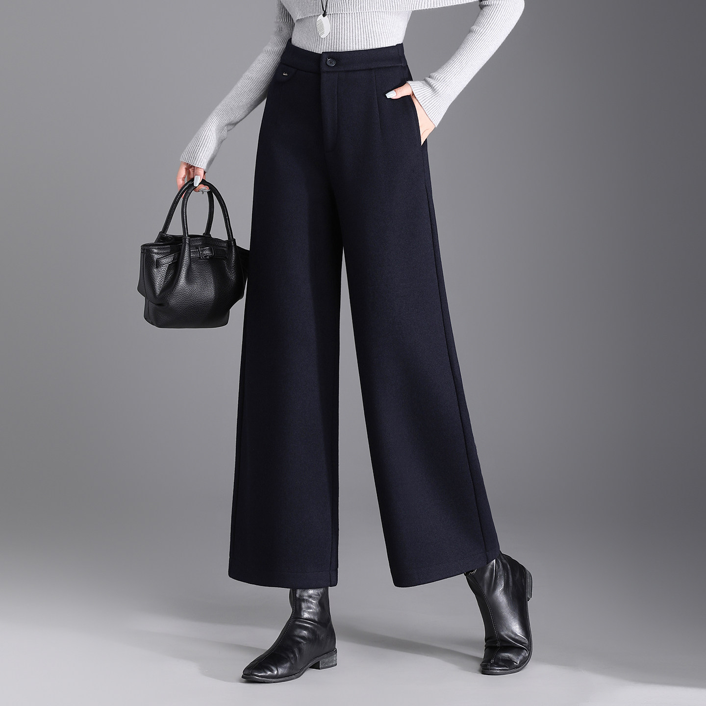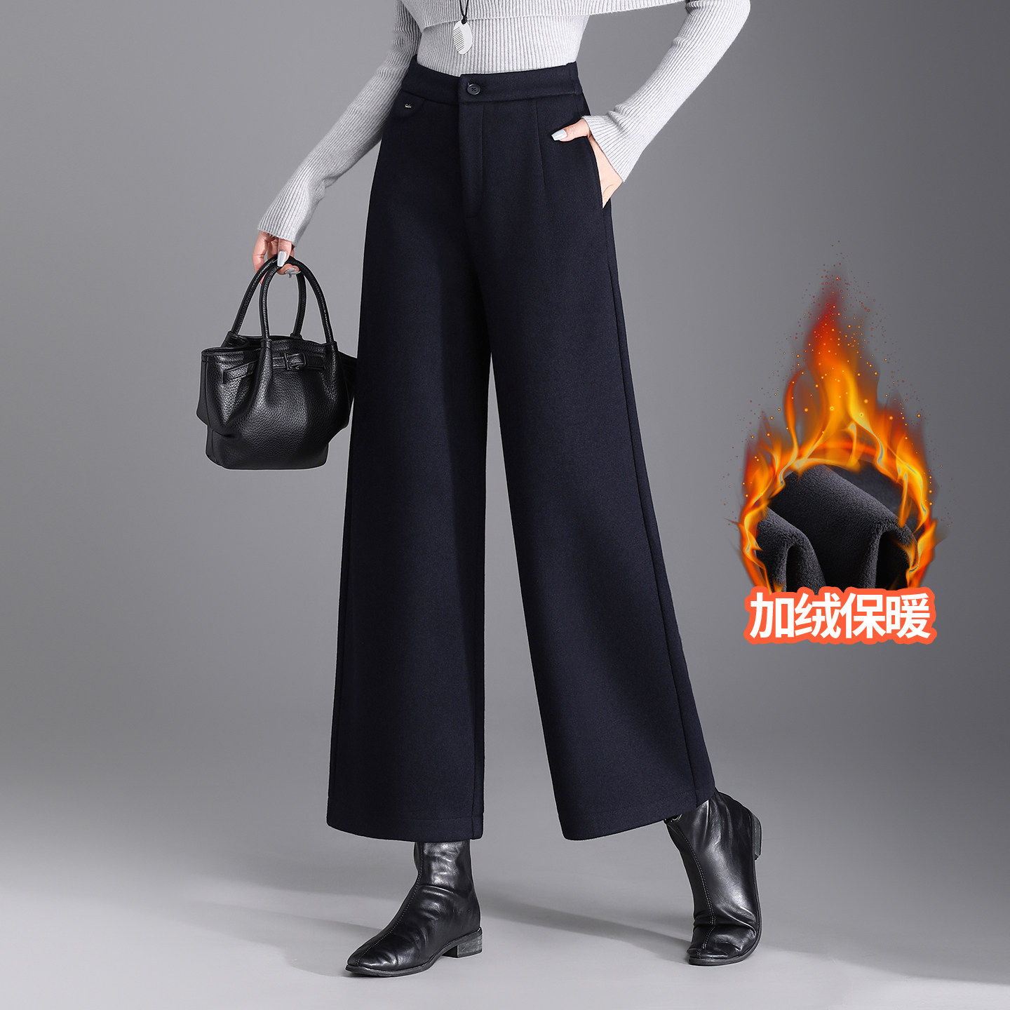 高腰冬季保暖阔腿裤休闲裤女款加绒直筒裤黑色显瘦宽松外穿长裤子