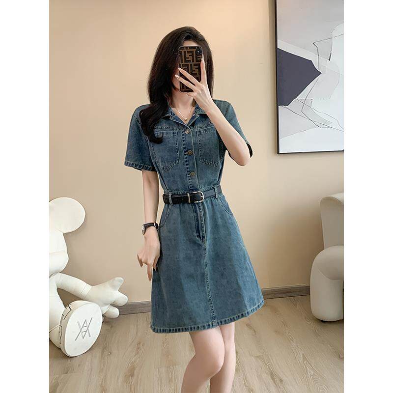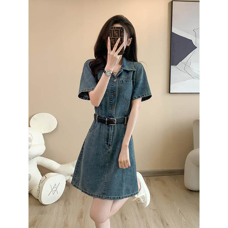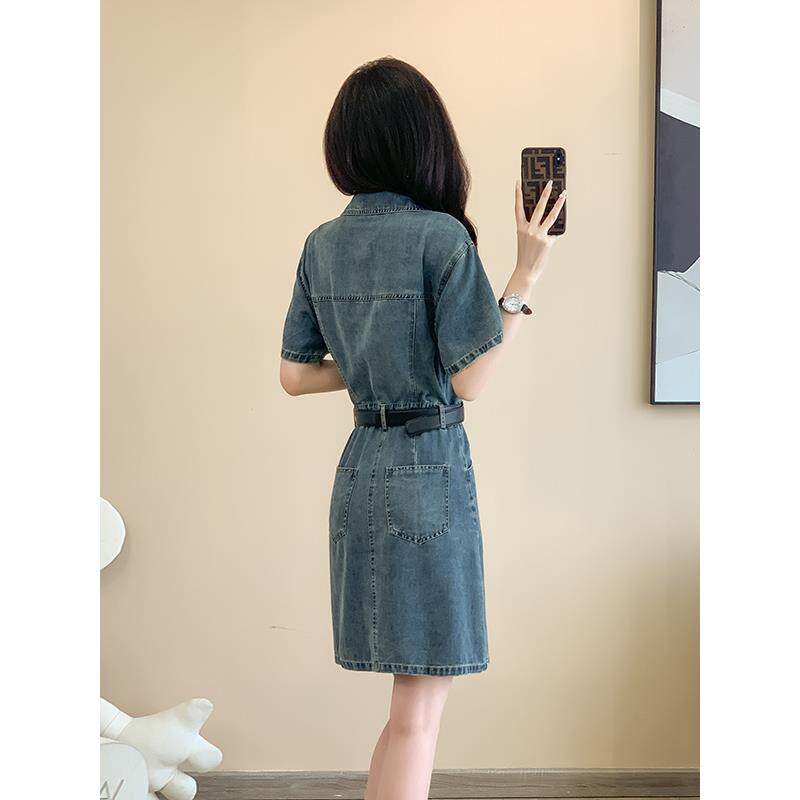 复古牛仔连衣裙女夏季新款薄款收腰显瘦小个子气质休闲短袖衬衫裙