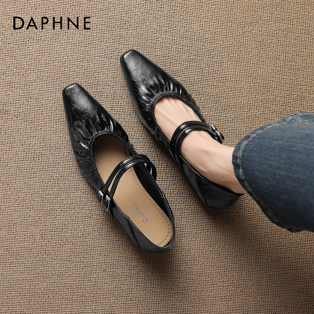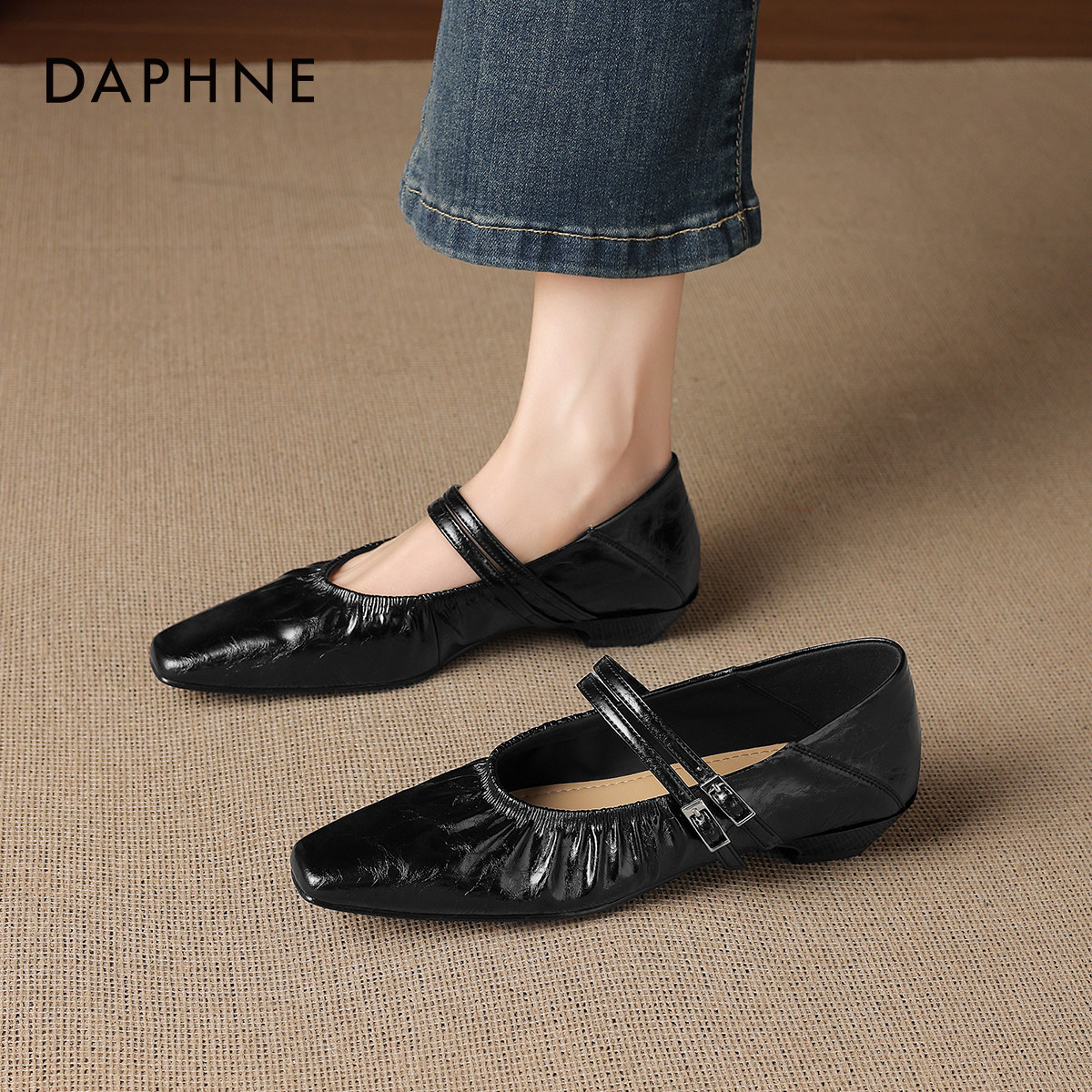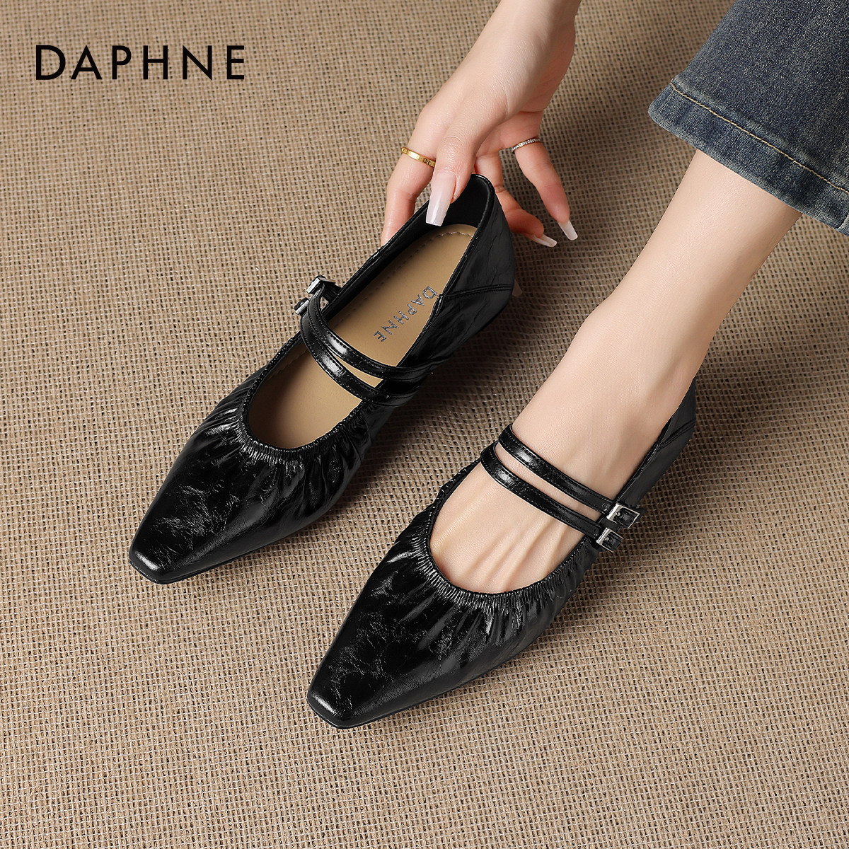 达芙妮尖头单鞋女款2026新款春夏季平底黑色小皮鞋法式玛丽珍女鞋