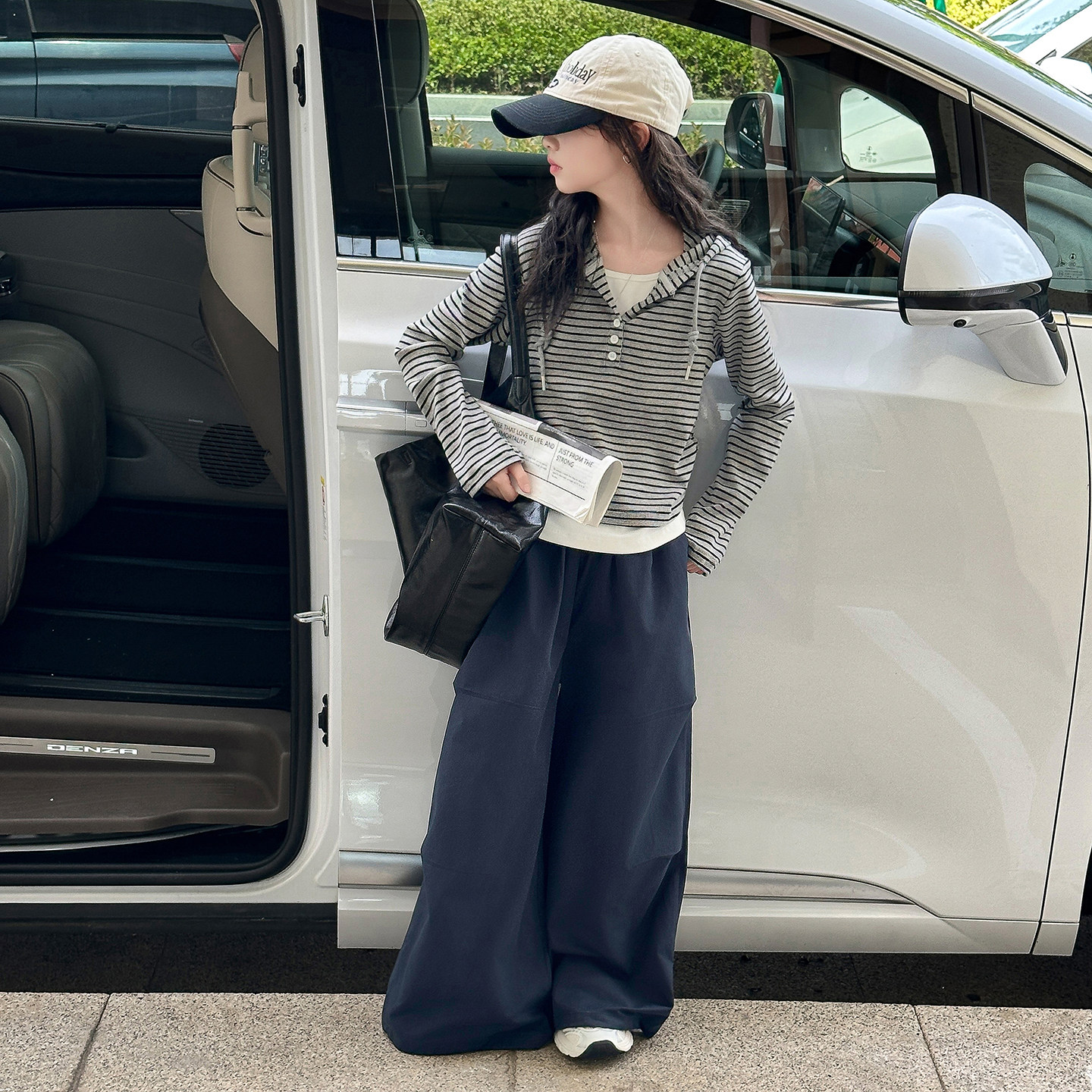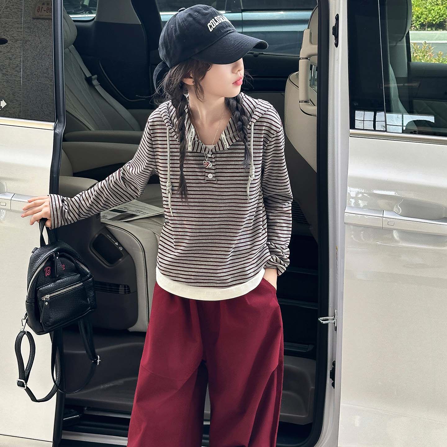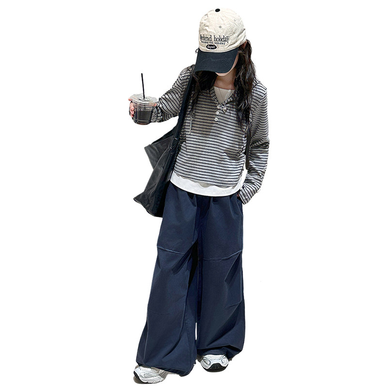 女童连帽卫衣春秋款2026新款儿童洋气条纹上衣女大童假两件打底衫