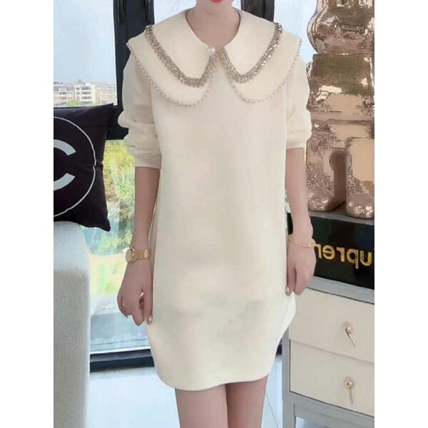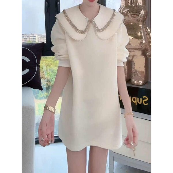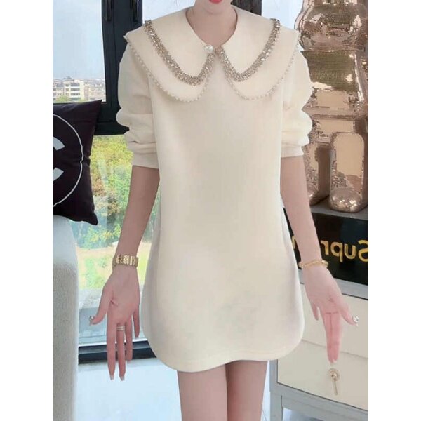 大码胖mm高级感镶钻减龄短款连衣裙春季时尚绝美百搭气质长袖裙子