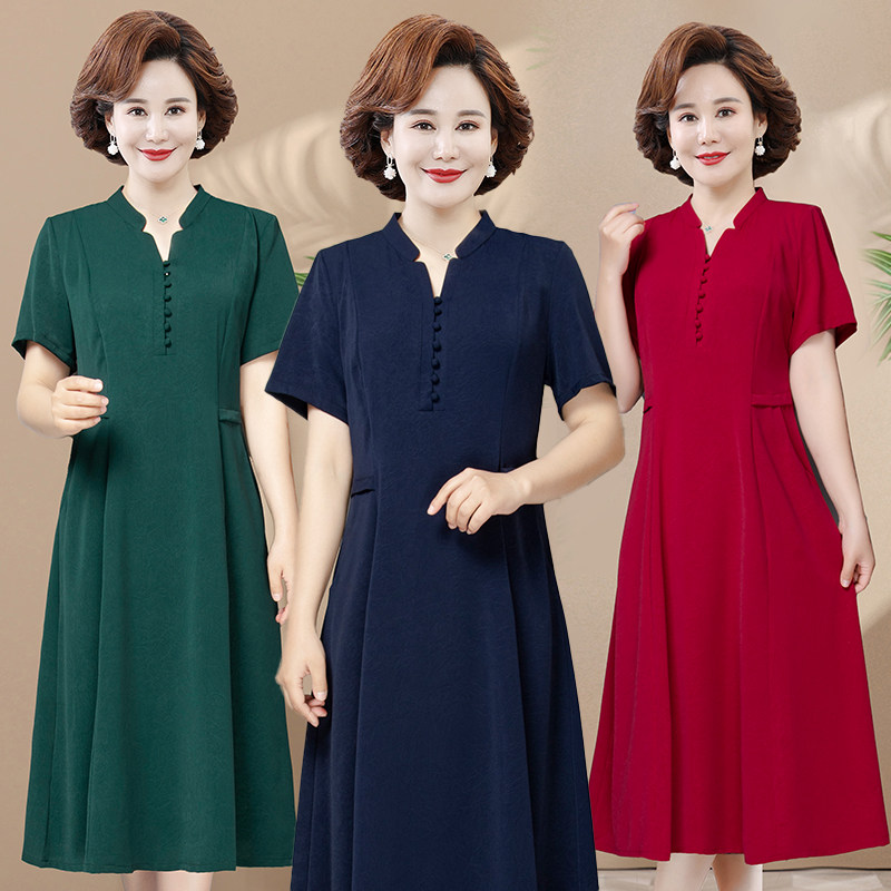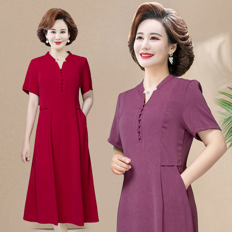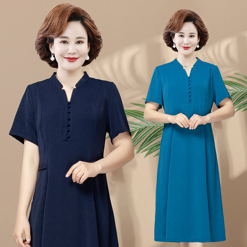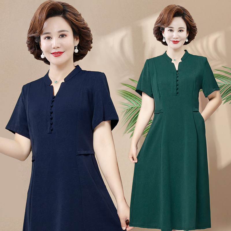 夏季中老年女装2023新款连衣裙大码纯色V领A字裙短袖妈妈藏肉裙子