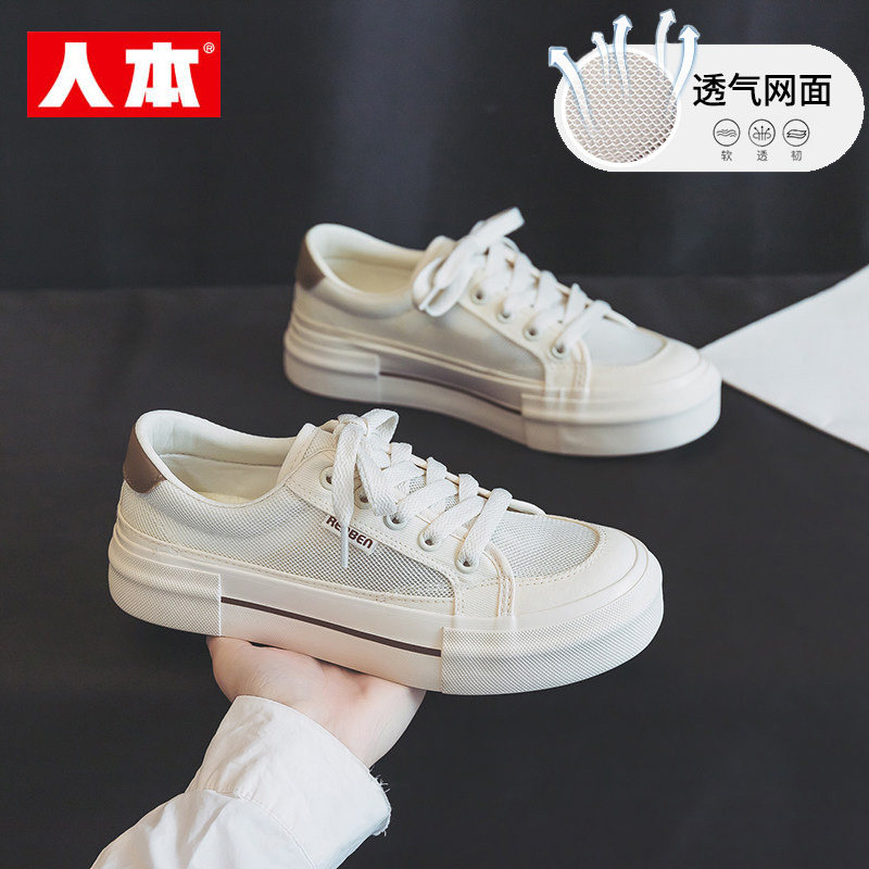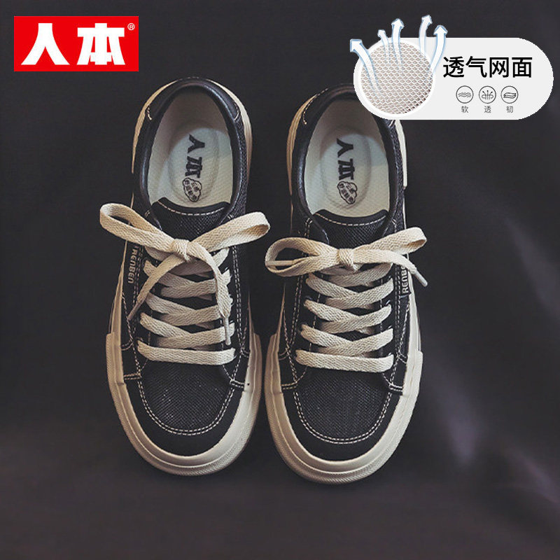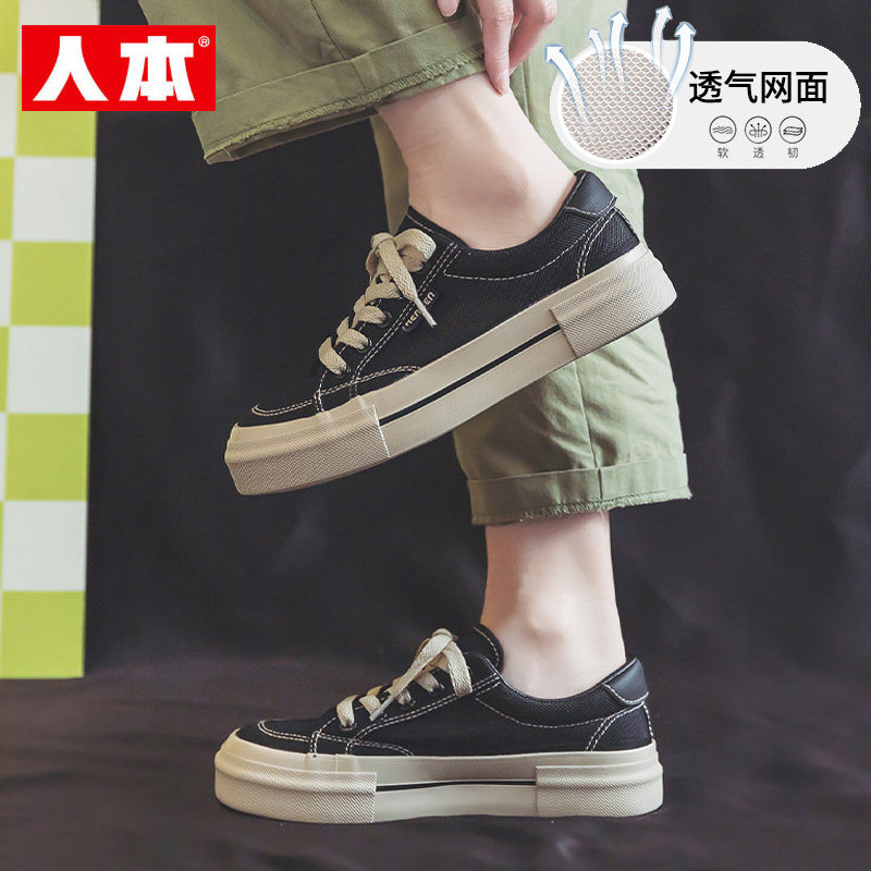 人本网面帆布鞋女2026夏季新款透气厚底休闲板鞋黑色轻便软底女鞋