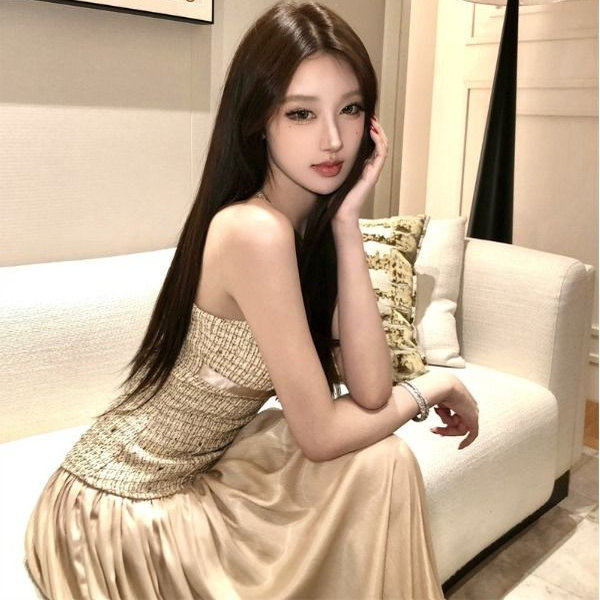 小香风抹胸连衣裙女秋冬设计感拼接缎面约会礼服长裙法式A字裙子