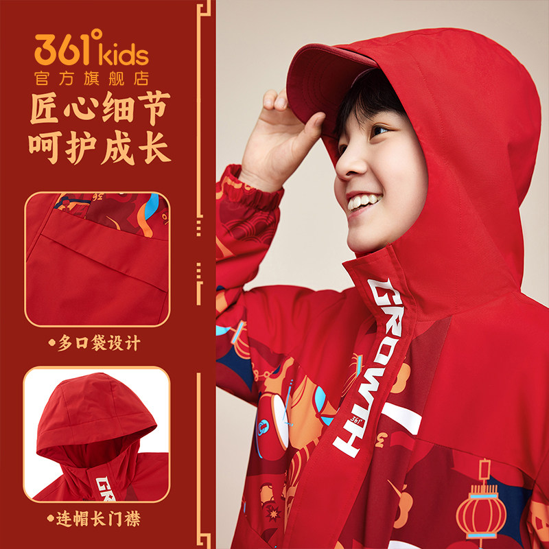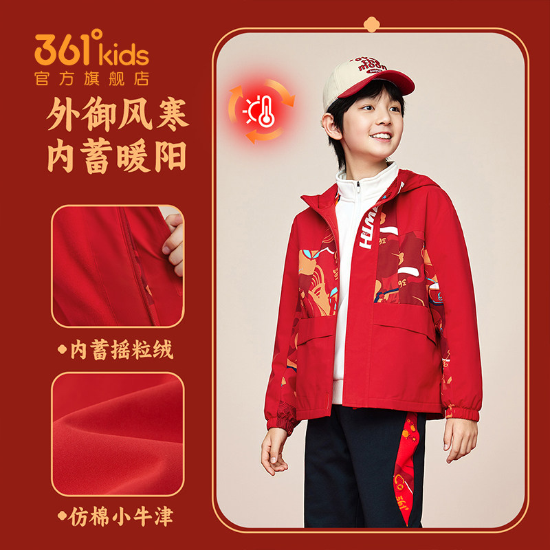 四防科技|361童装男童加绒加厚新款女童上衣新年红色儿童冲锋外套