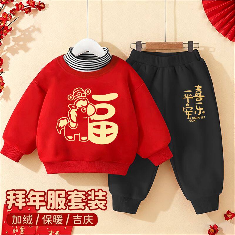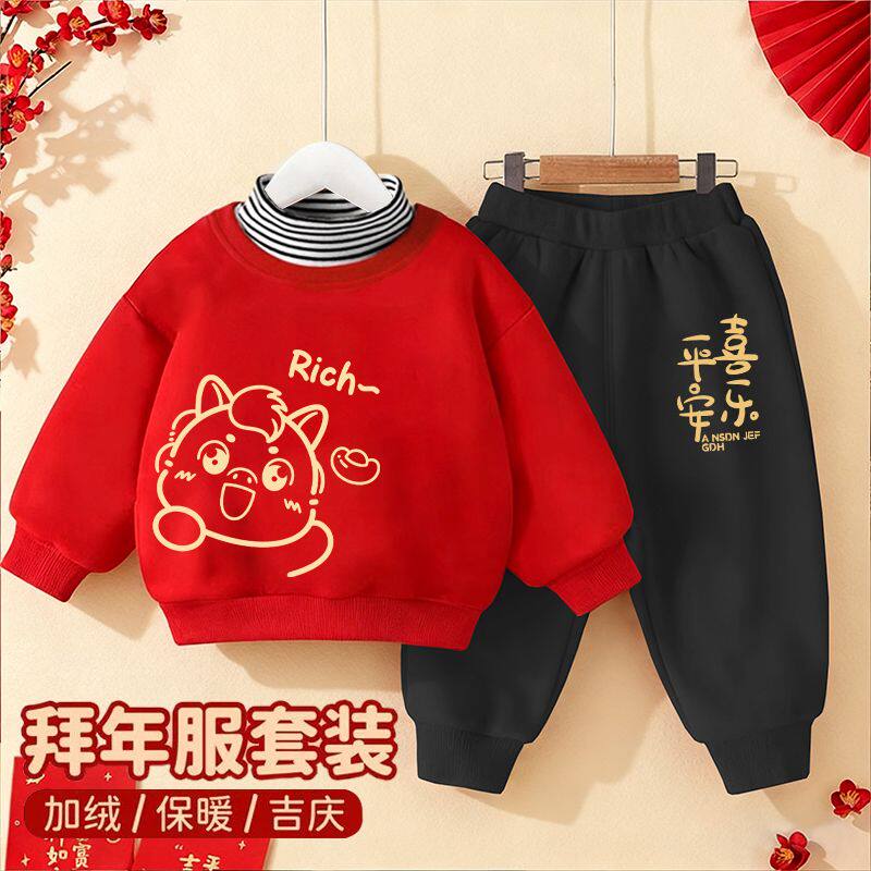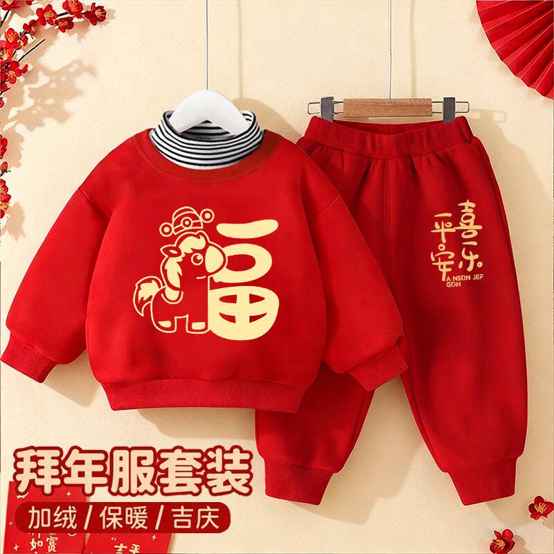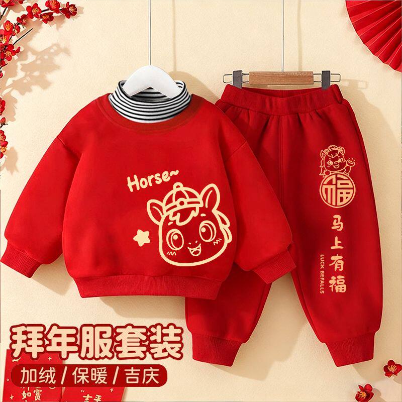 男女童卫衣套装2026马年宝宝红色喜庆加绒衣服冬季保暖高领两件套