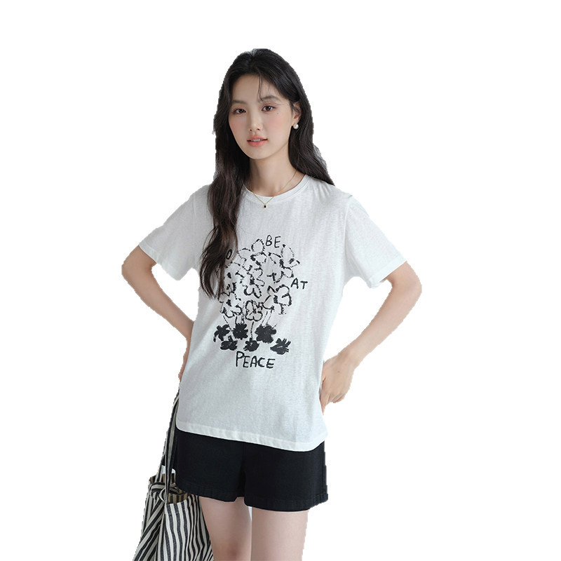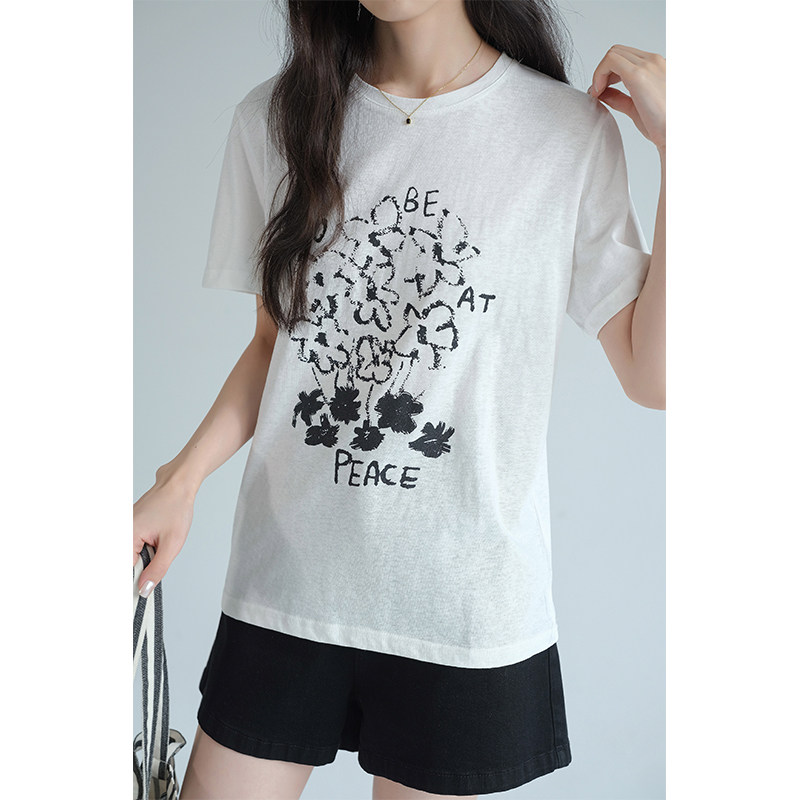 311线报网描述:设计感花朵印花短袖上衣显瘦百搭正肩T恤ins