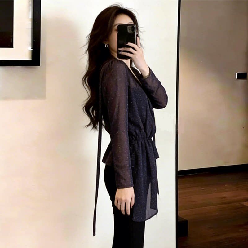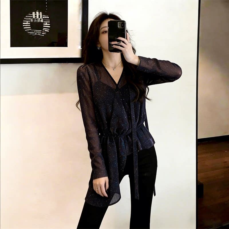 轻熟风波点法式V领女款衬衫春季气质百搭显瘦收腰大码胖mm上衣潮