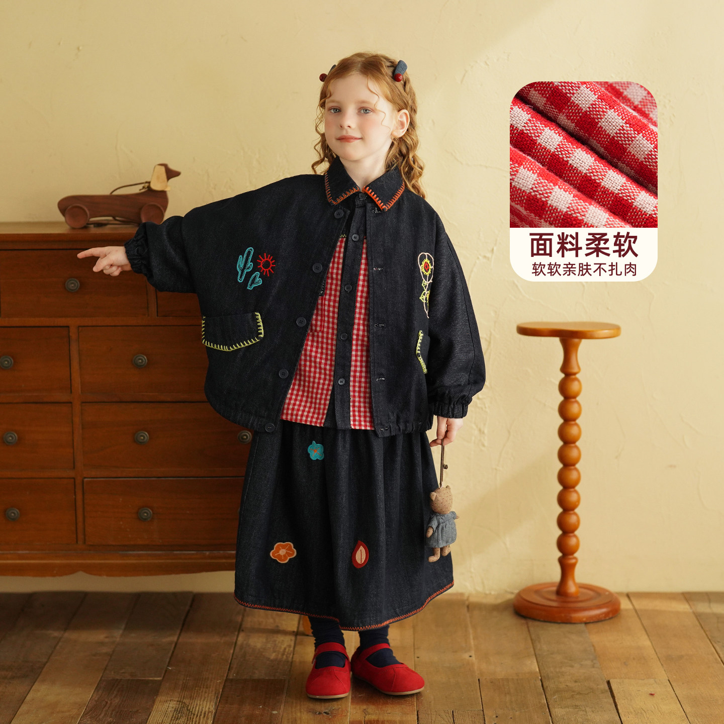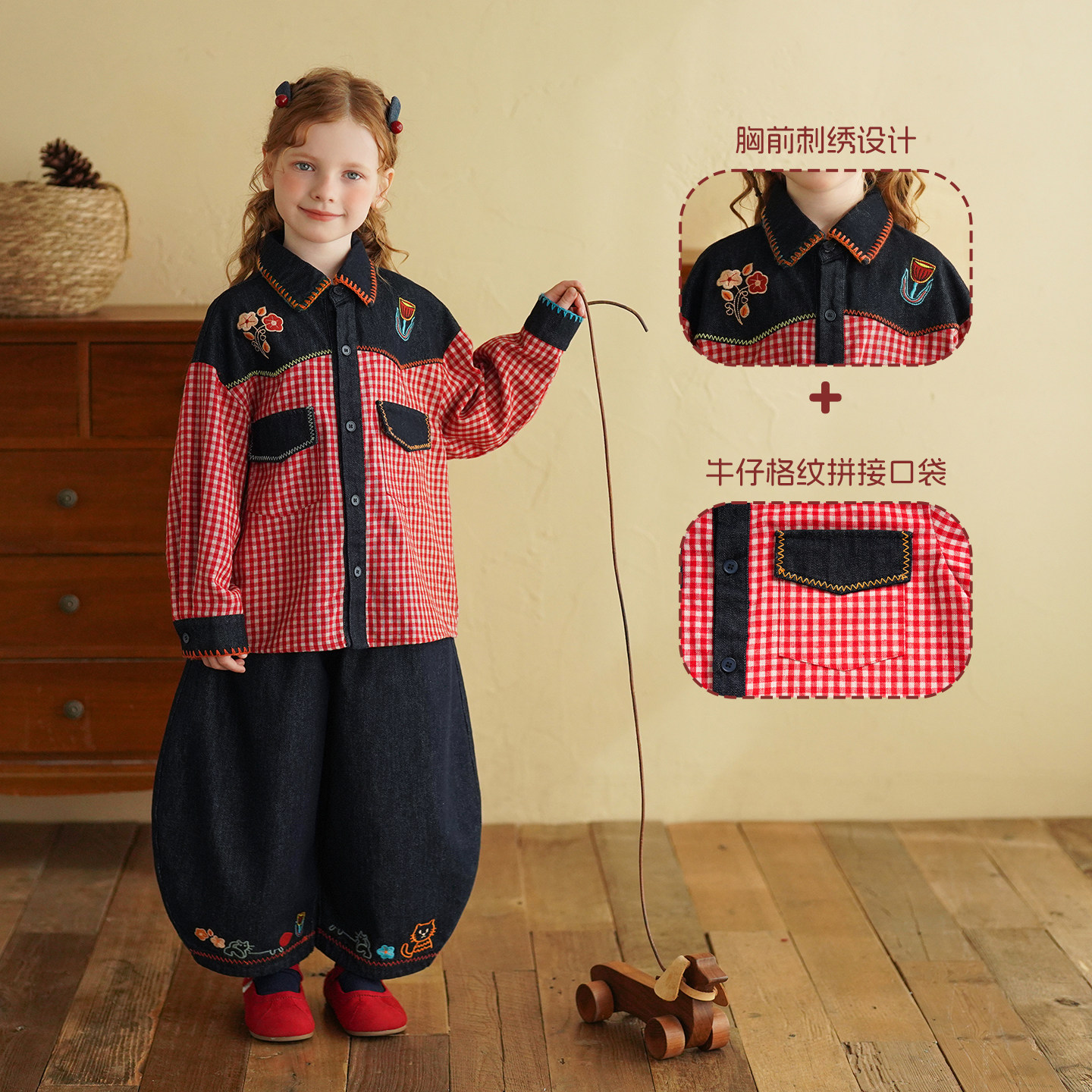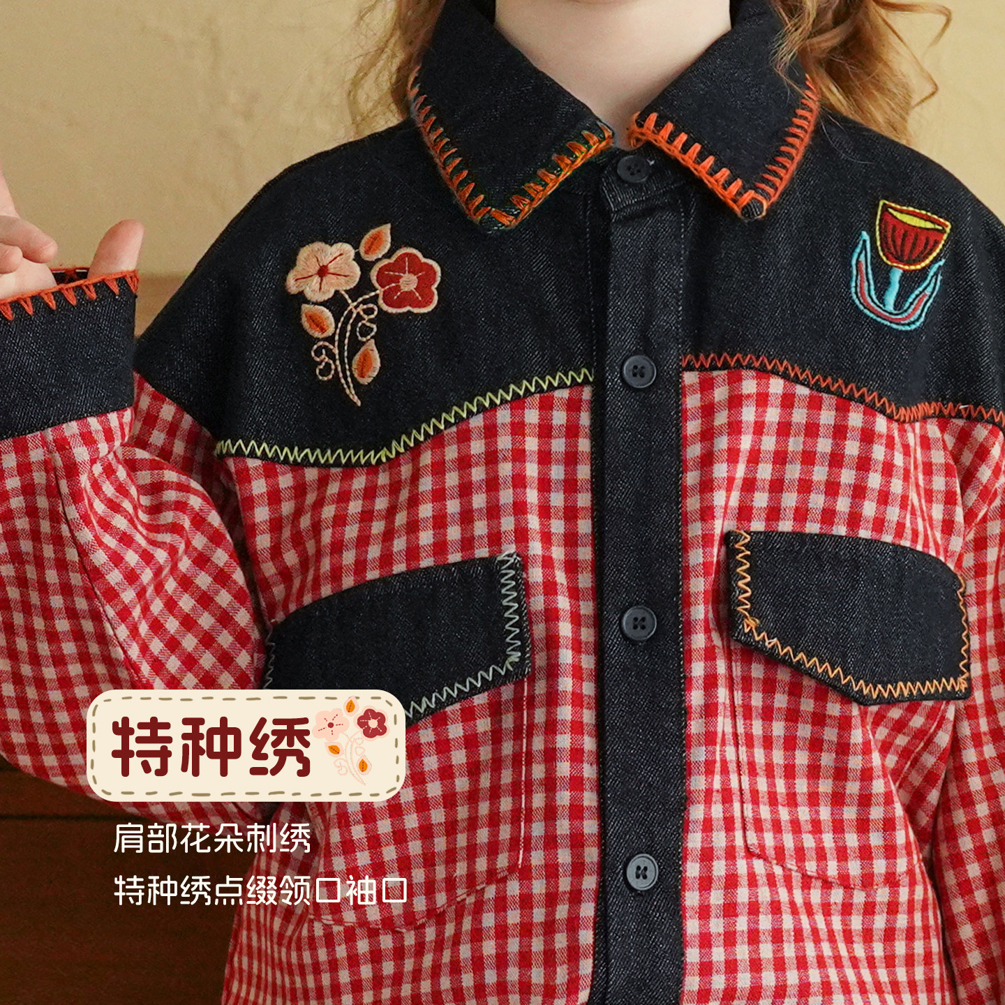 砚台家女童红色格纹牛仔衬衫2026春装新款女宝宝宽松百搭外套衬衣