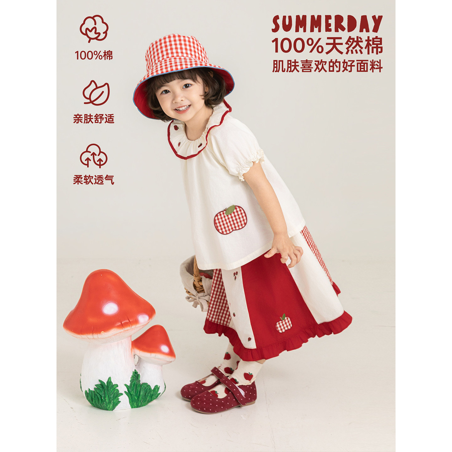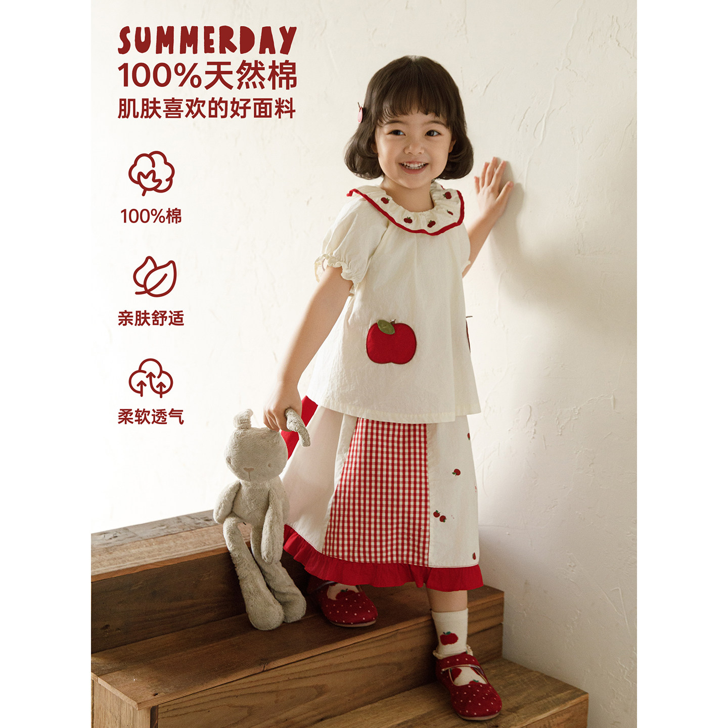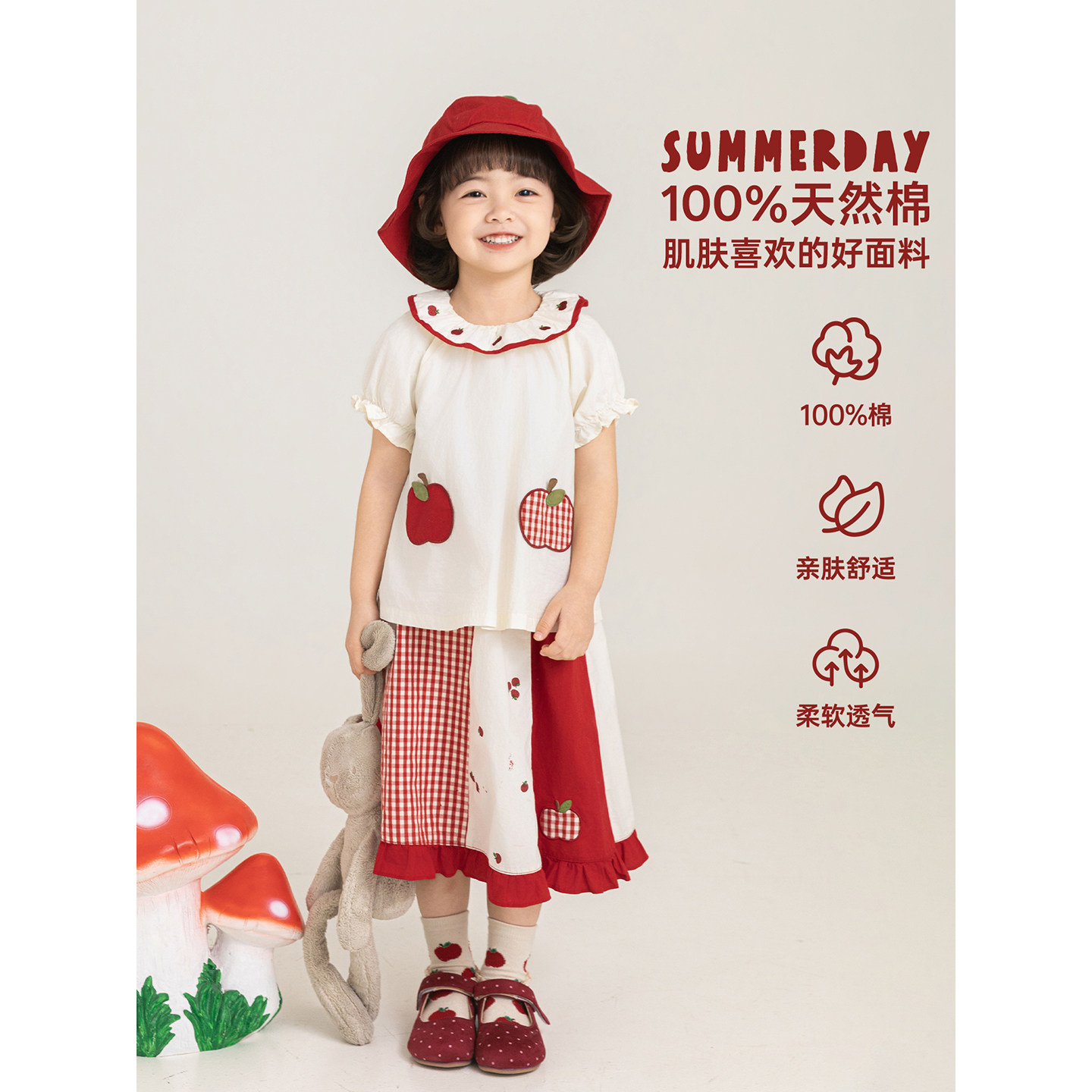 幼悠女童夏季新款荷叶翻领短袖衬衫拼色花边裙子红苹果可爱套装潮