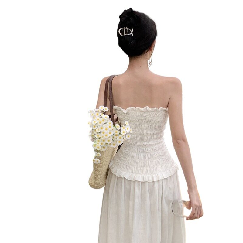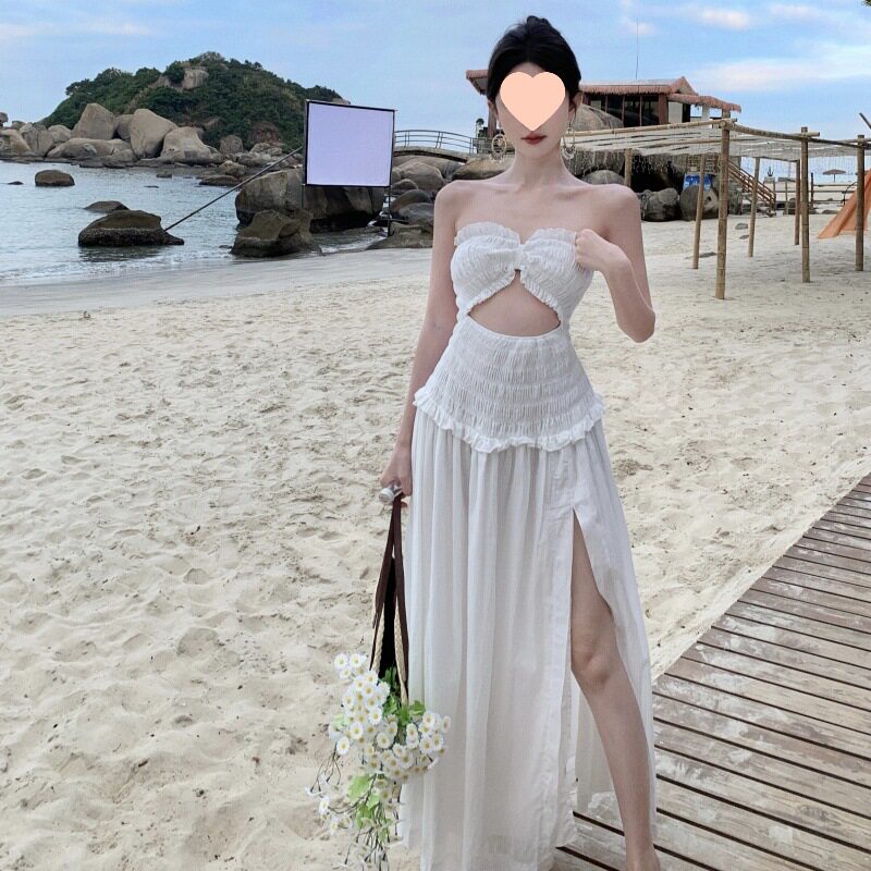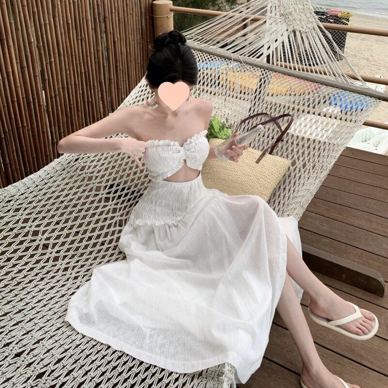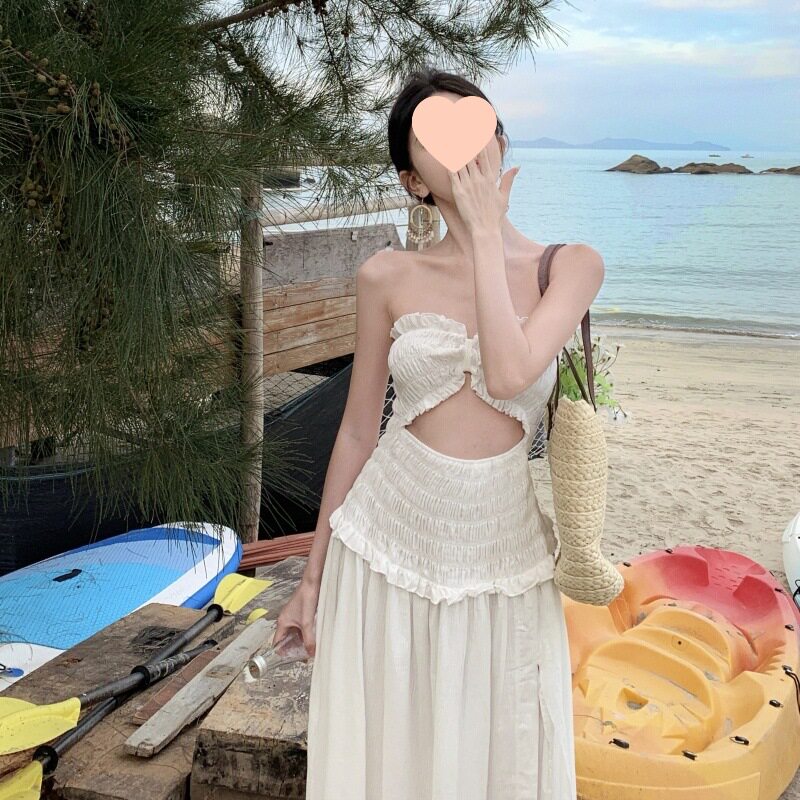 抹胸白色一字肩长裙度假风连衣裙纯欲温柔风性感纯白气质露腰长裙