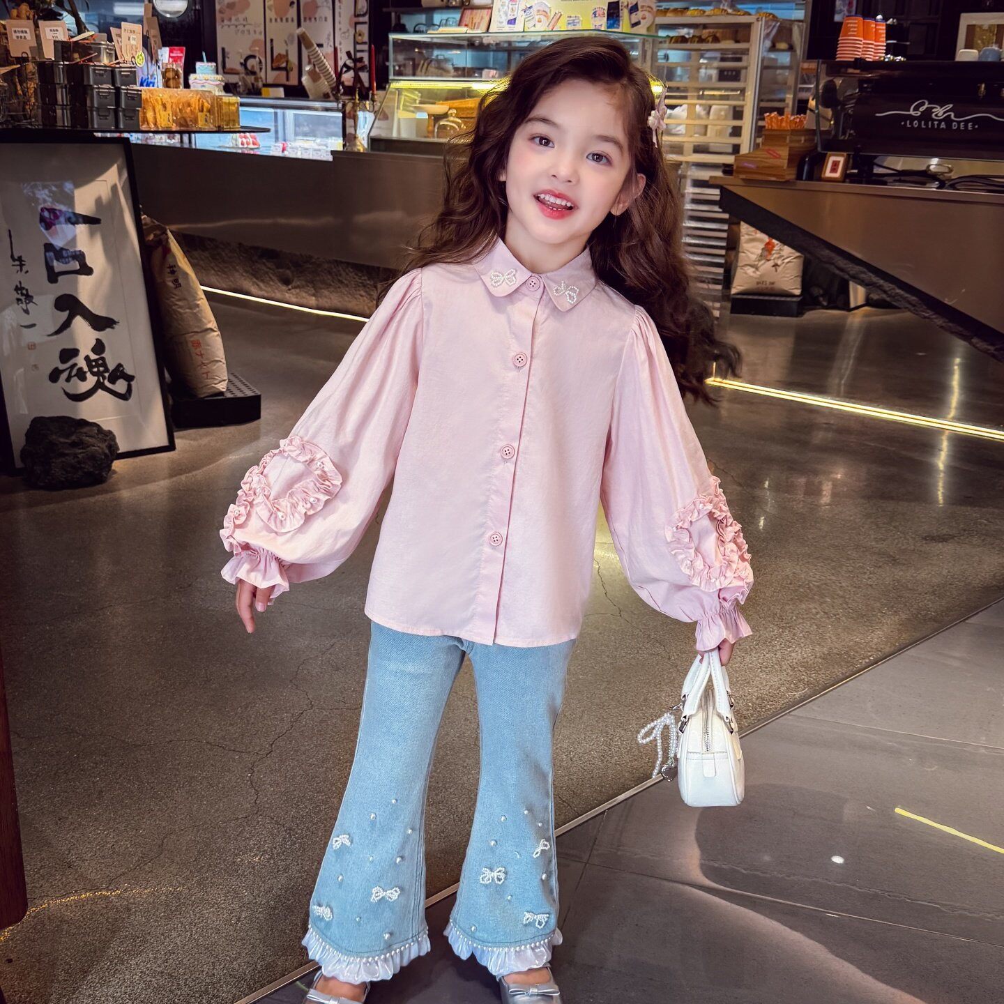311线报网描述:甜美百搭钉珠花边蝴蝶结灯笼袖翻领衬衫