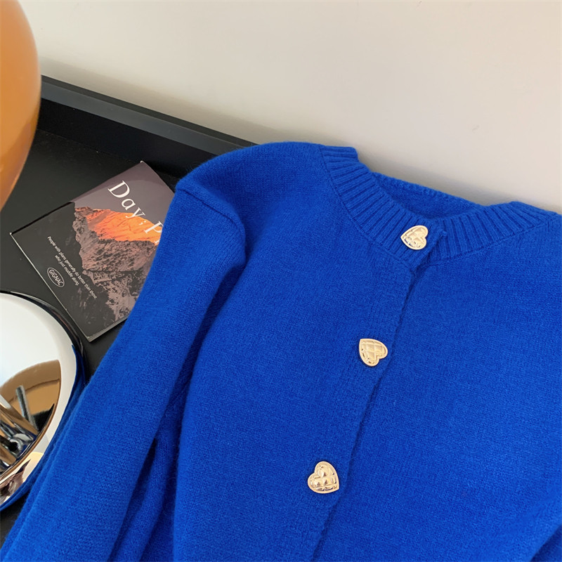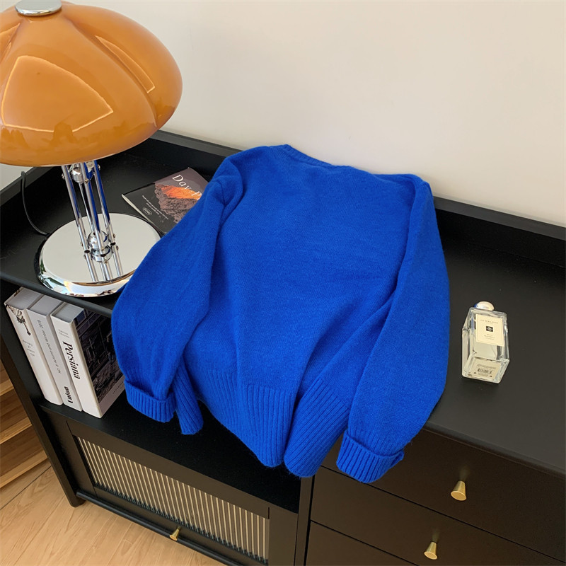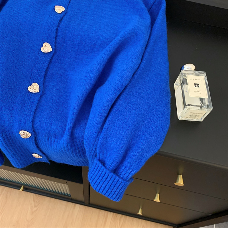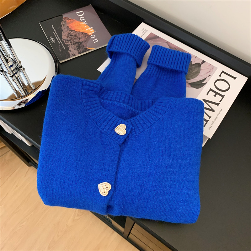 秋冬时尚慵懒宽松别致排扣克莱因蓝加厚毛衣开衫针织衫女羊绒外套