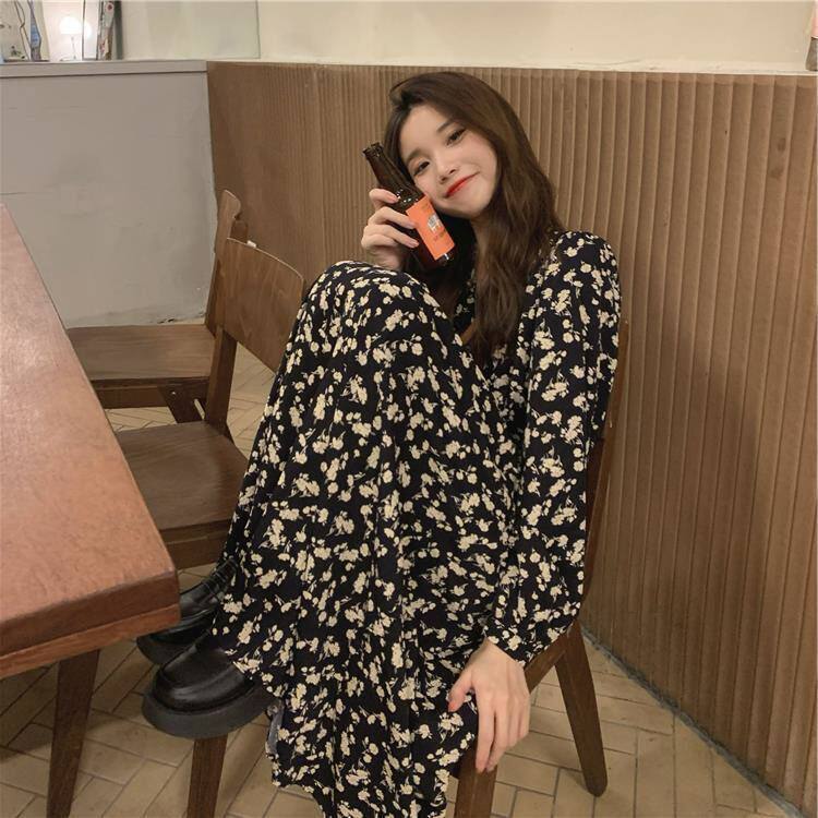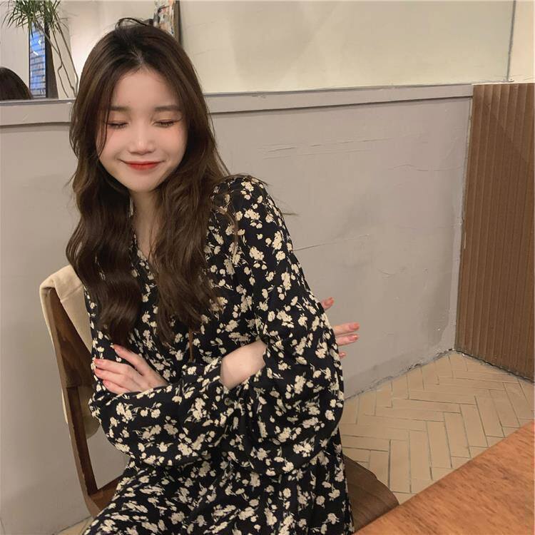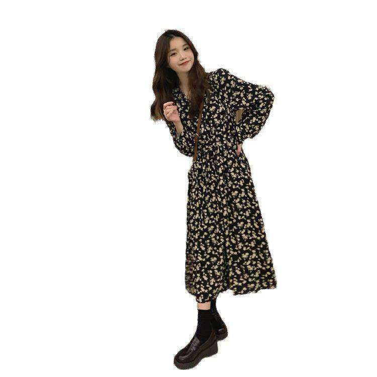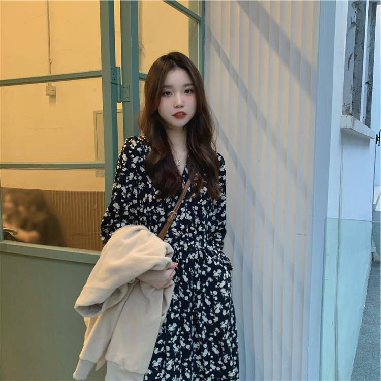 长袖春夏过膝领女碎花裙子2026风连衣裙V字高腰气质新款长款温柔A