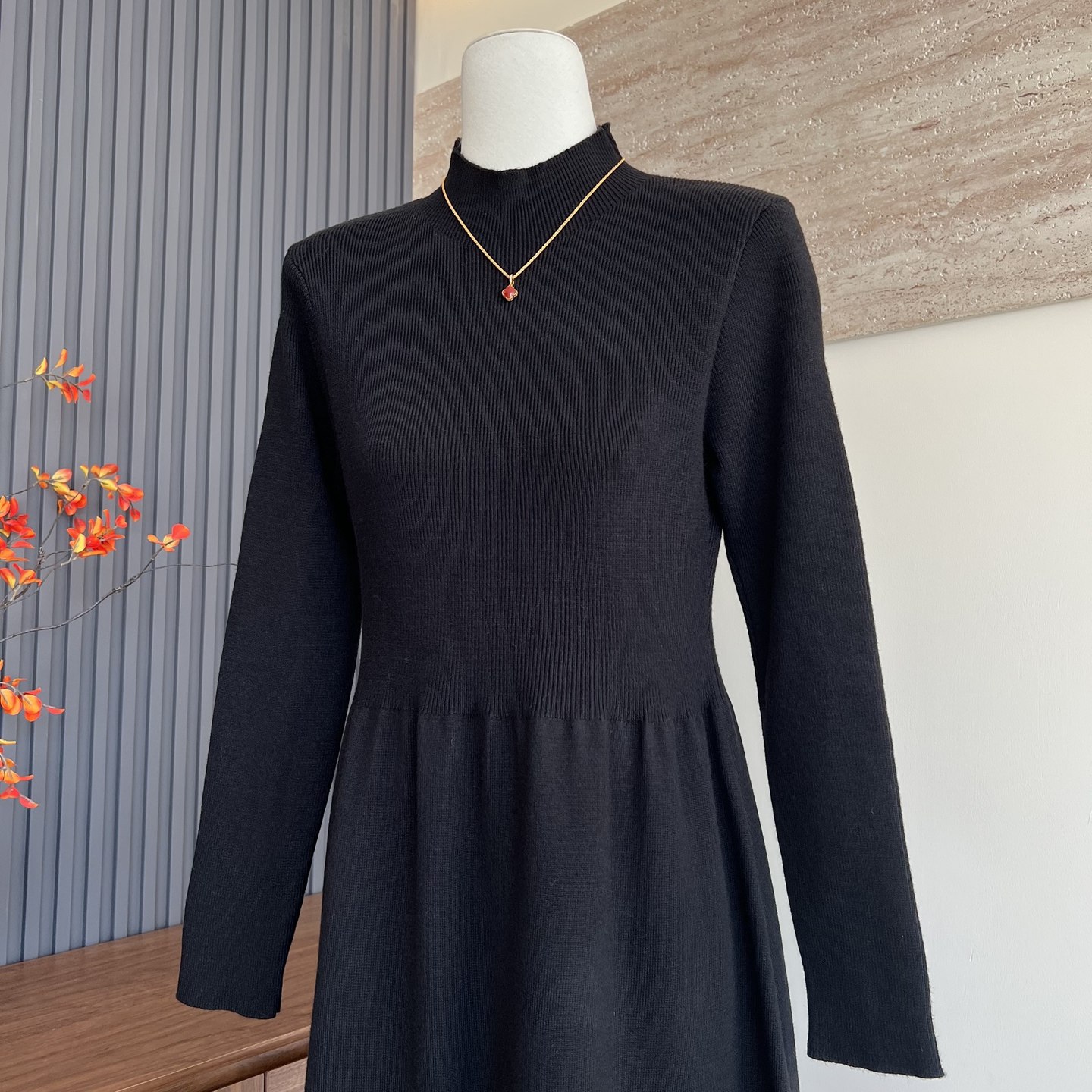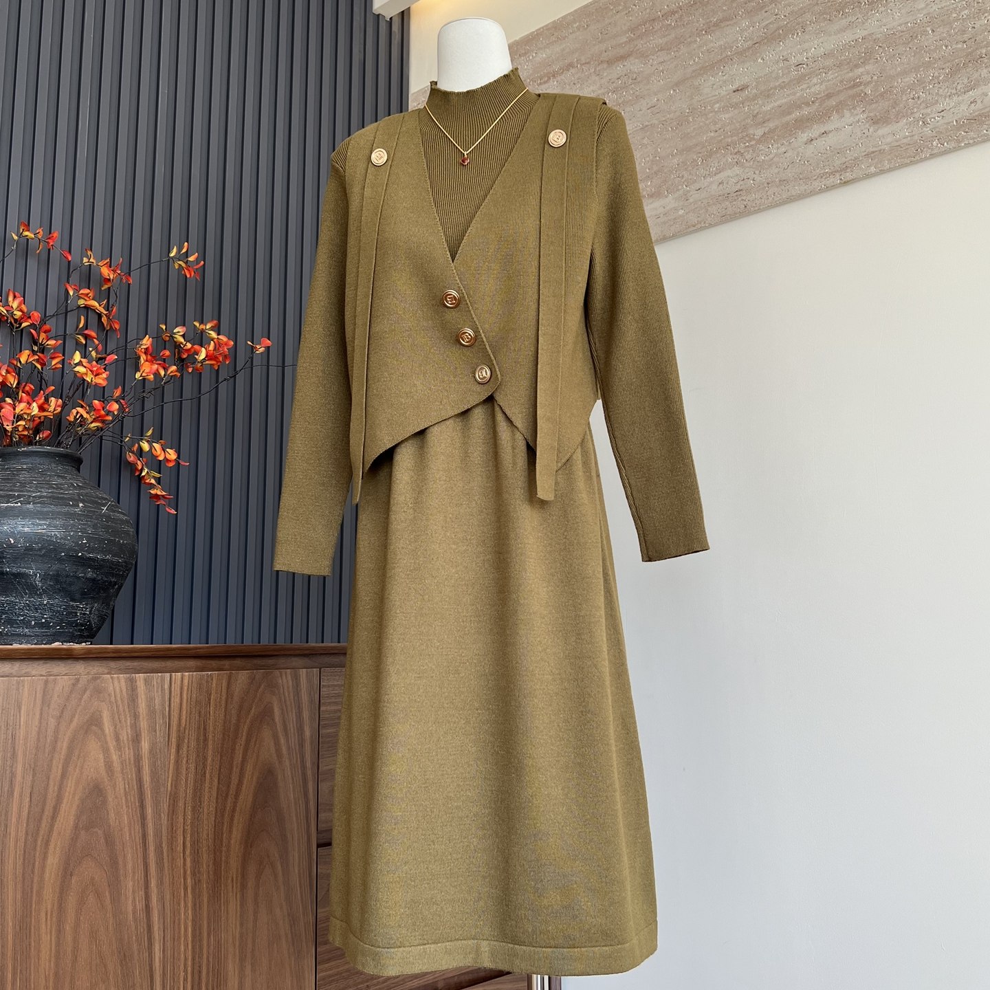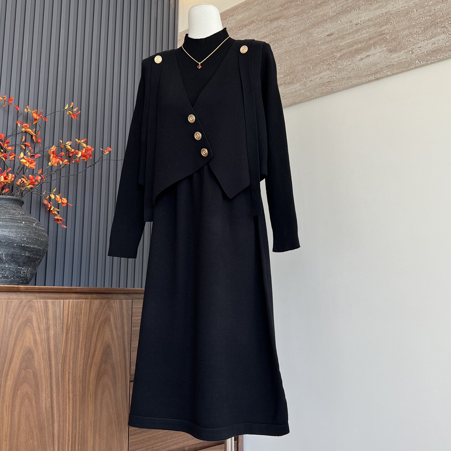 气质新款秋冬季半高领长袖中长款针织衫连衣裙时尚马夹中年女套装