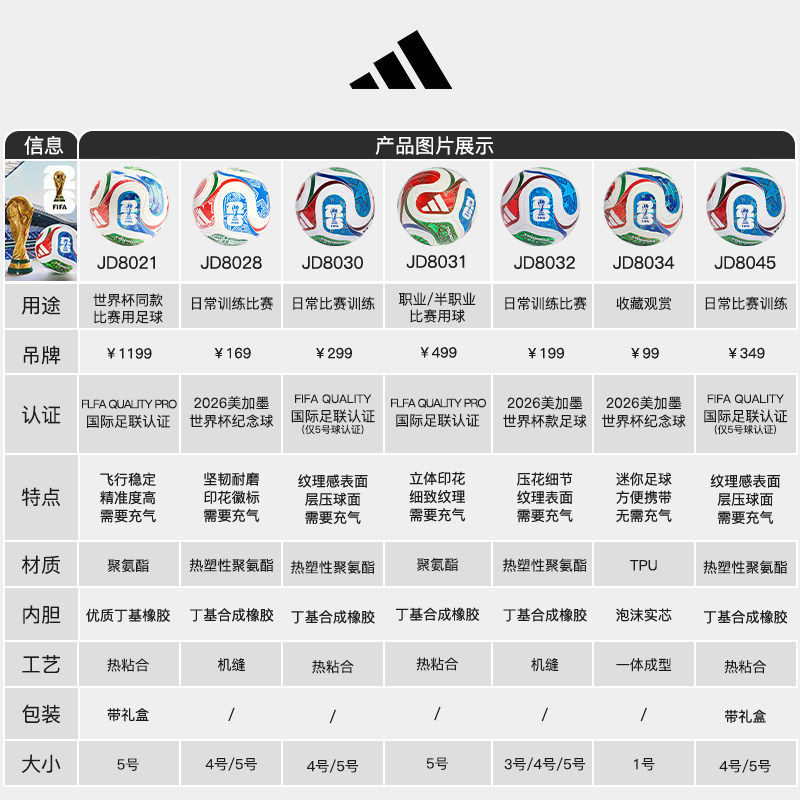 阿迪达斯26年FIFA美加墨世界杯三重浪训练用球JD8032比赛足球