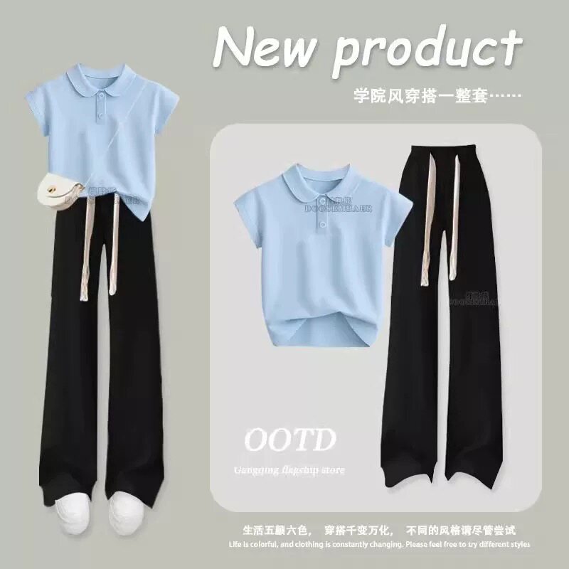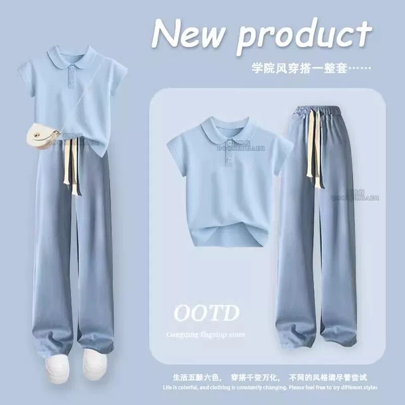 女童夏天翻领短袖学院风套装2025新款韩版女孩儿童阔腿裤两件套潮