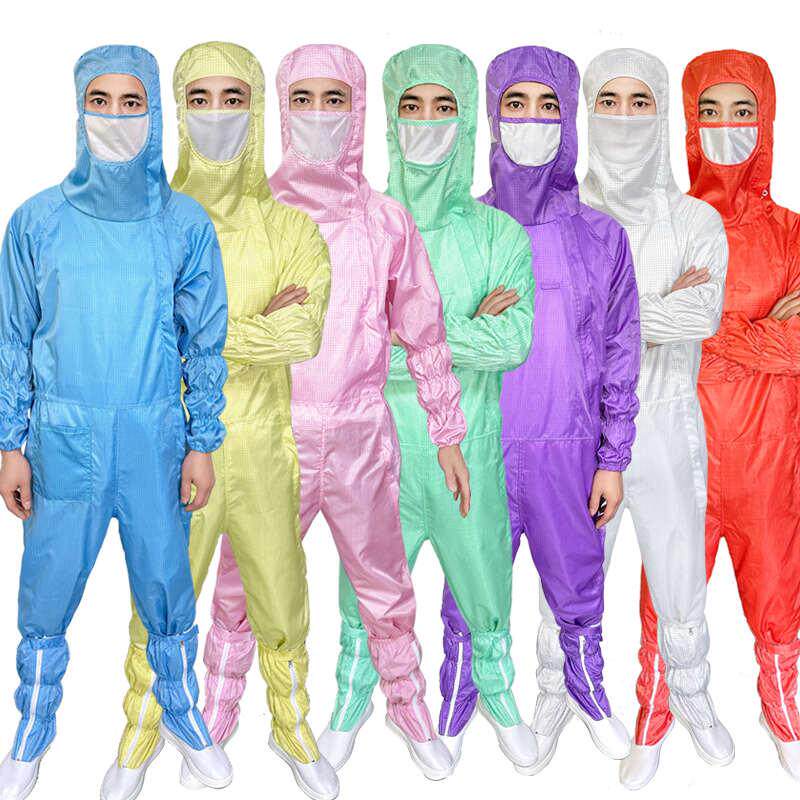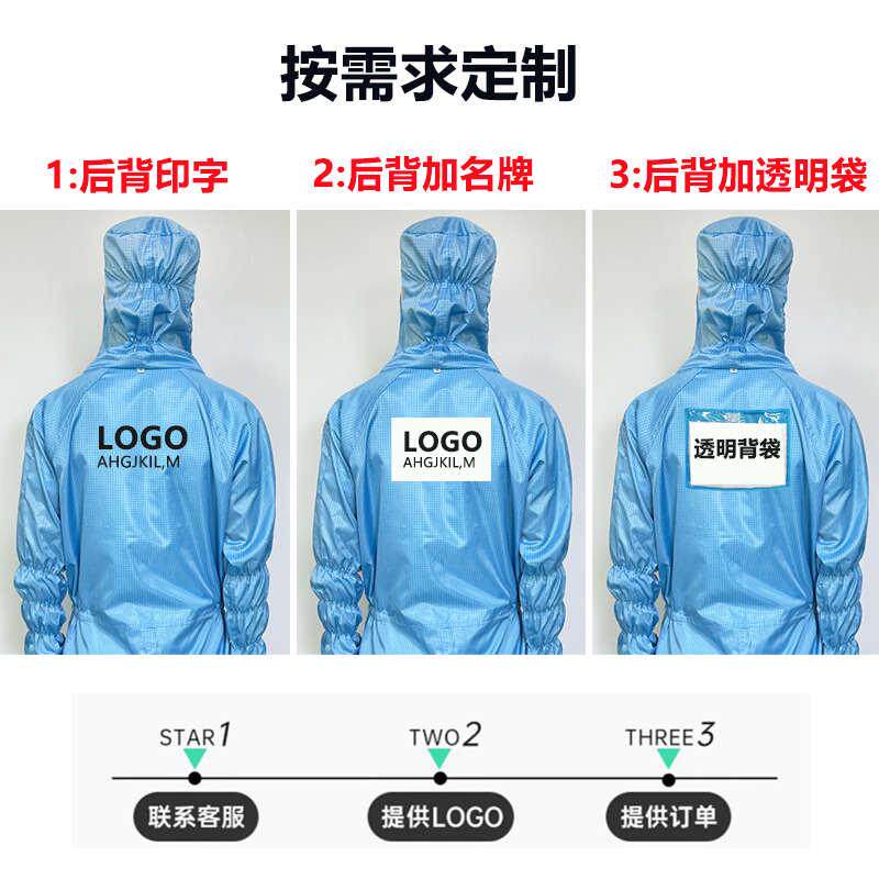 百级网格无尘服连体洁净车间防尘工作服带背标有口袋防静电橙蓝色