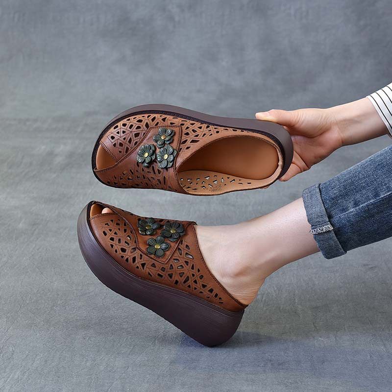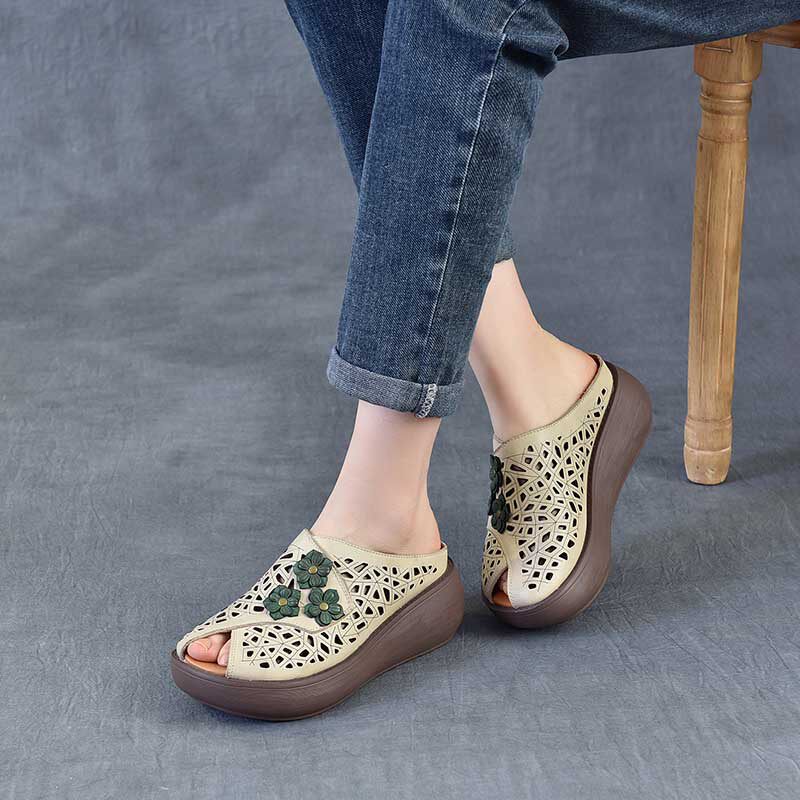 《头层牛皮》厚底增高6CM夏季真皮鱼嘴拖鞋女外穿花朵白色凉拖鞋