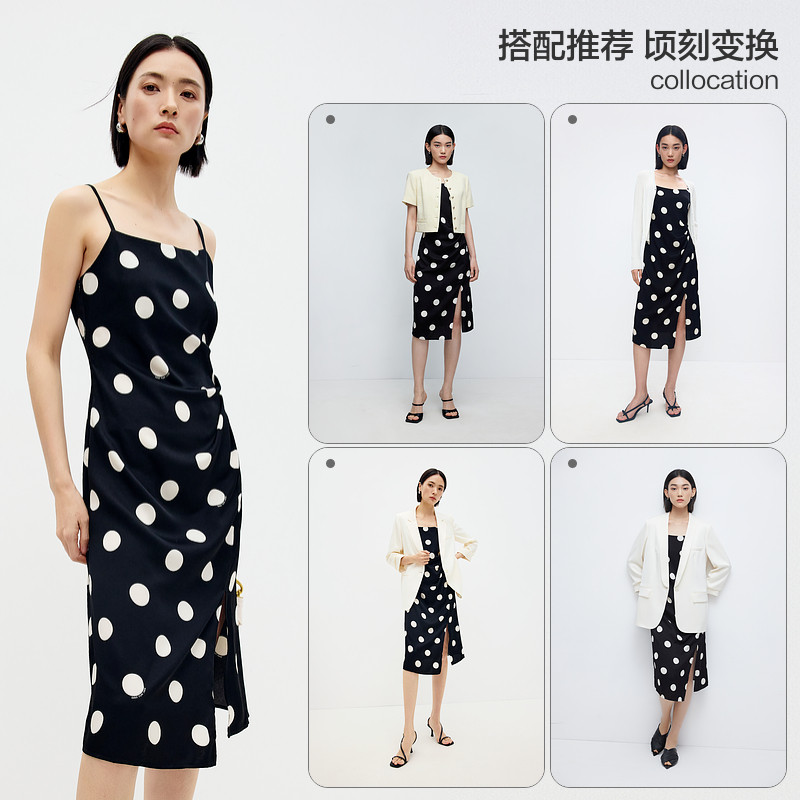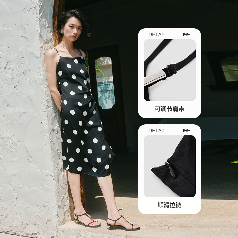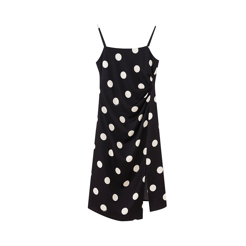 水云间黑色吊带波点连衣裙女收腰开叉中长款裙子醋酸2026夏季新款