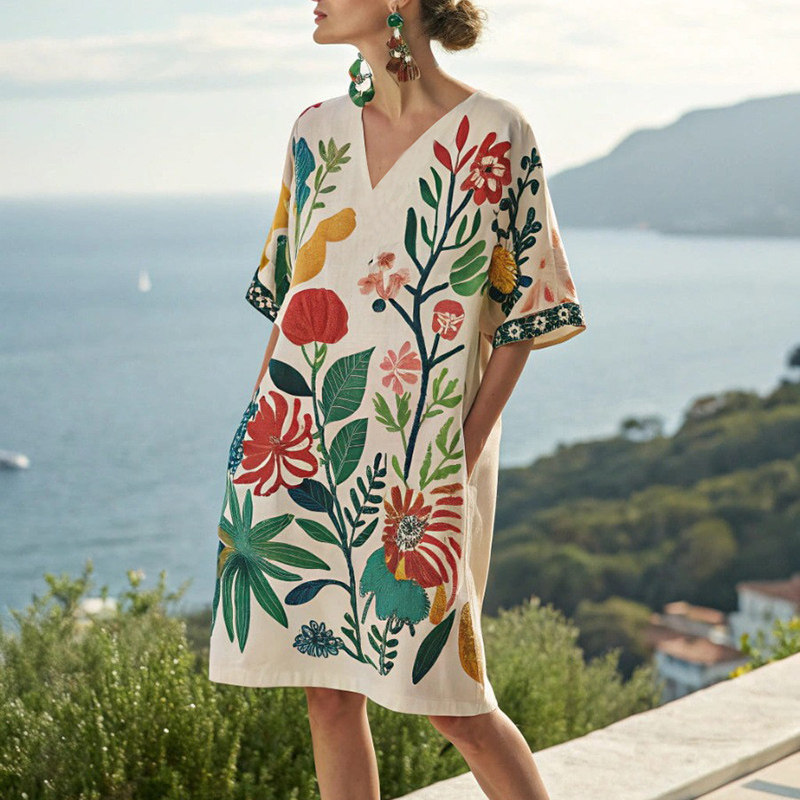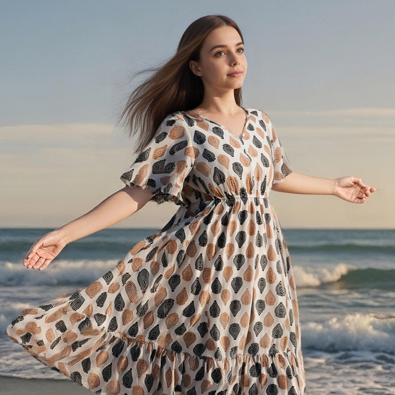 希腊风情海边度假大码沙滩裙连衣裙宽松洋气V领中长款棉麻质感