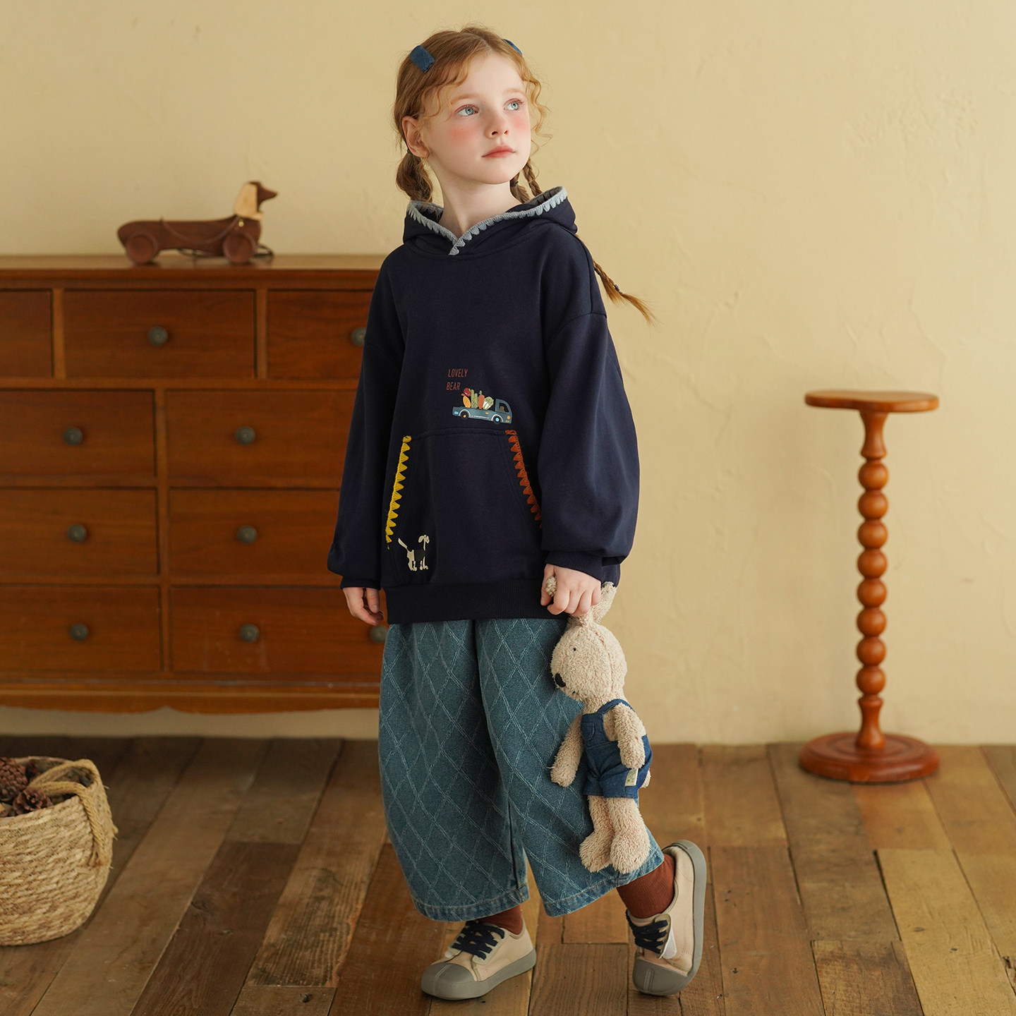 砚台家女童卫衣薄款2026春秋季新款儿童洋气时髦卡通刺绣连帽上衣